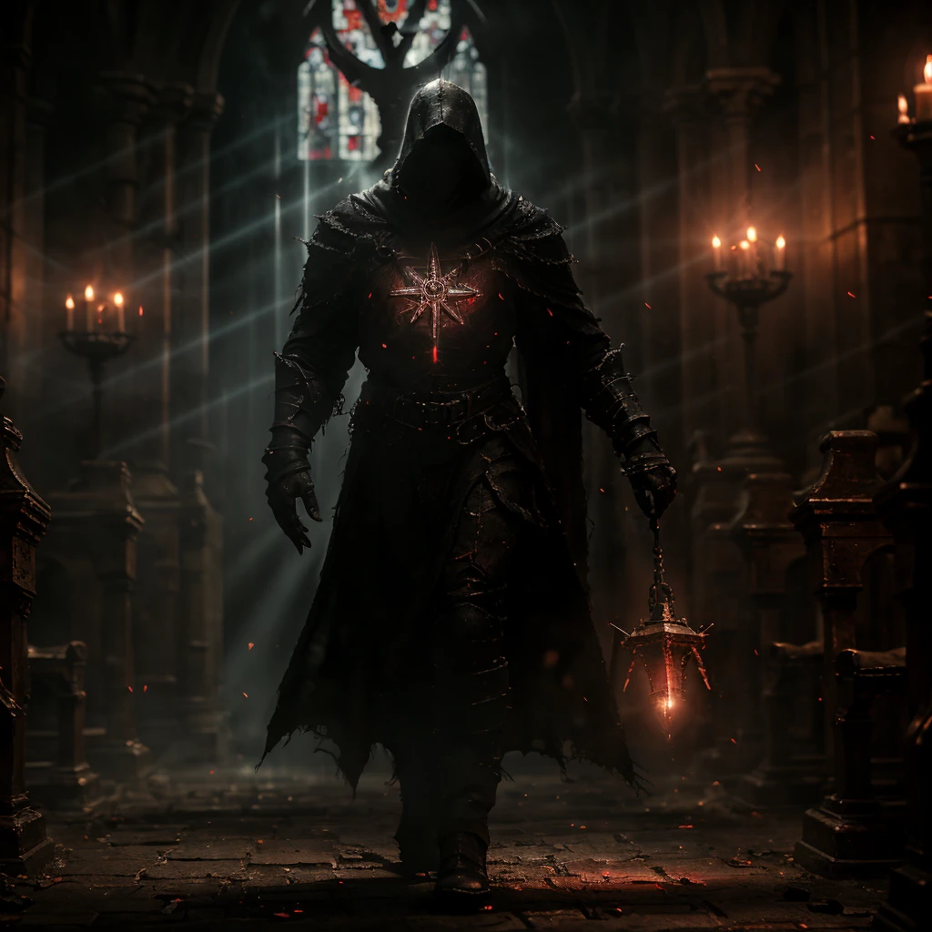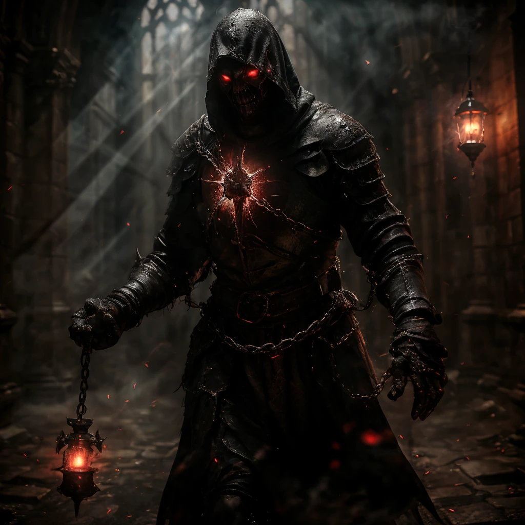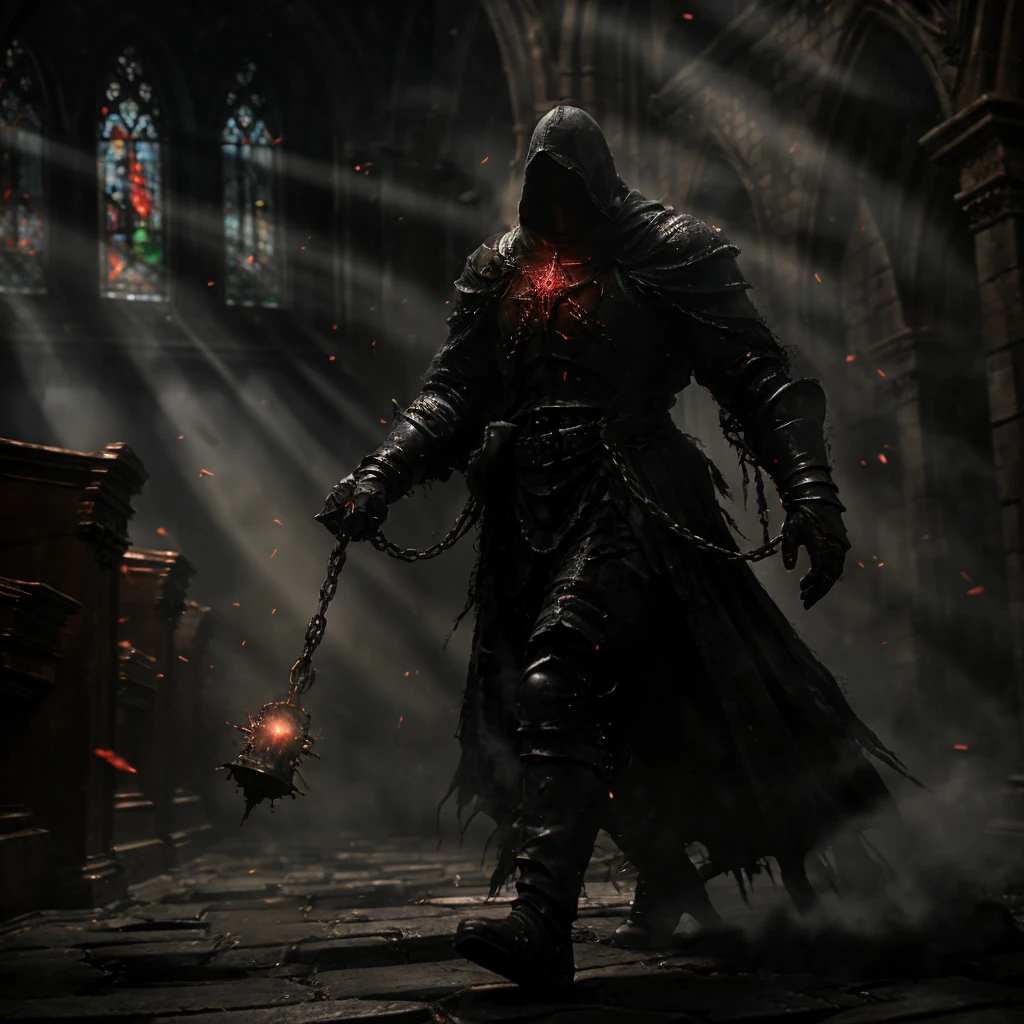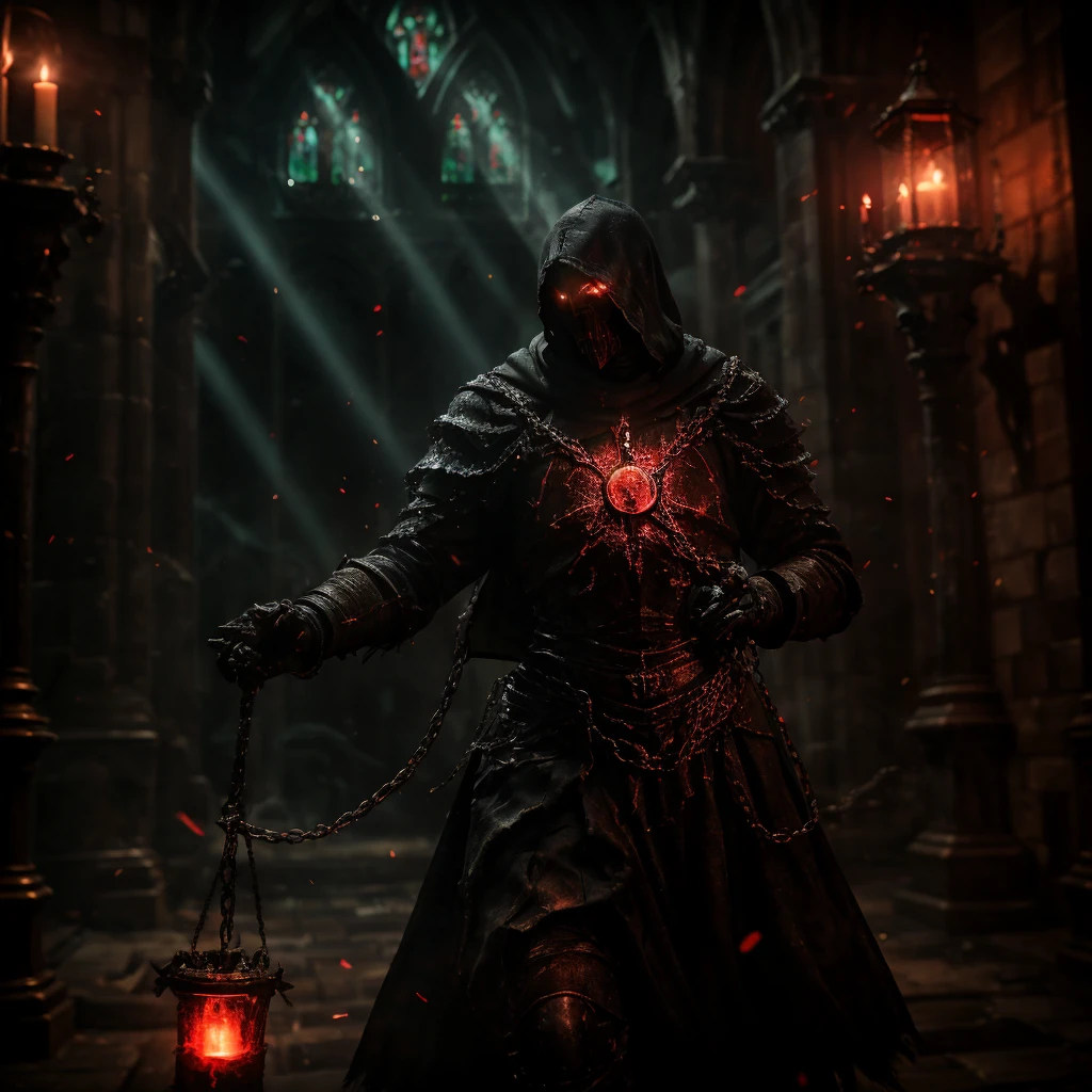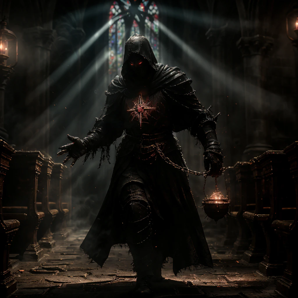 1other, armor, belt, black armor, blood, breastplate, cape, chain, chainmail, club, dual wielding, embers, facing viewer, fire, fog, full armor, full body, gauntlets, gloves, glowing, glowing eye, glowing eyes, gorkahn, helm, helmet, holding, holding sword, holding weapon, hood, hood up, indoors, looking at viewer, mace, male focus, mask, outdoors, pauldrons, red eyes, ruins, shoulder armor, smoke, solo, spiked club, spikes, standing, sword, thurible, weapon,Description