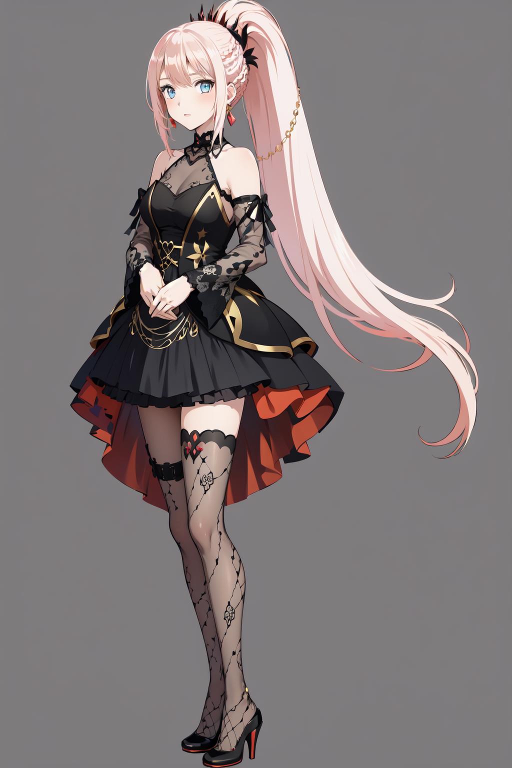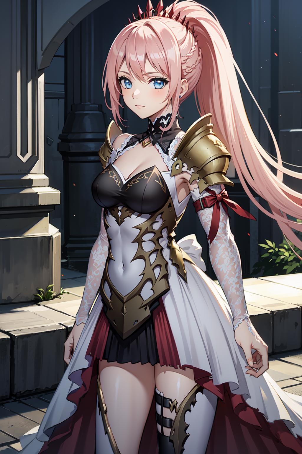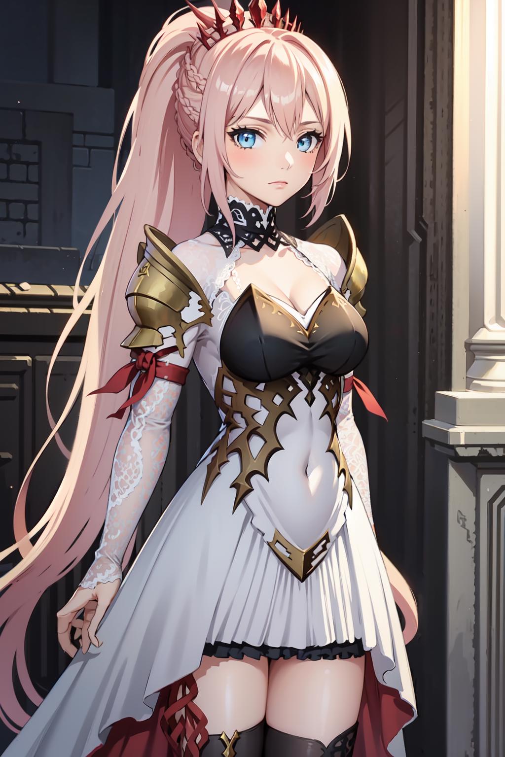 pink hair, very long hair, blue eyes, thighhighs, dress, white dress, armor, ponytail, tiara, shoulder armorPlease ask my permission to use on generation services. You have to at least credit me.