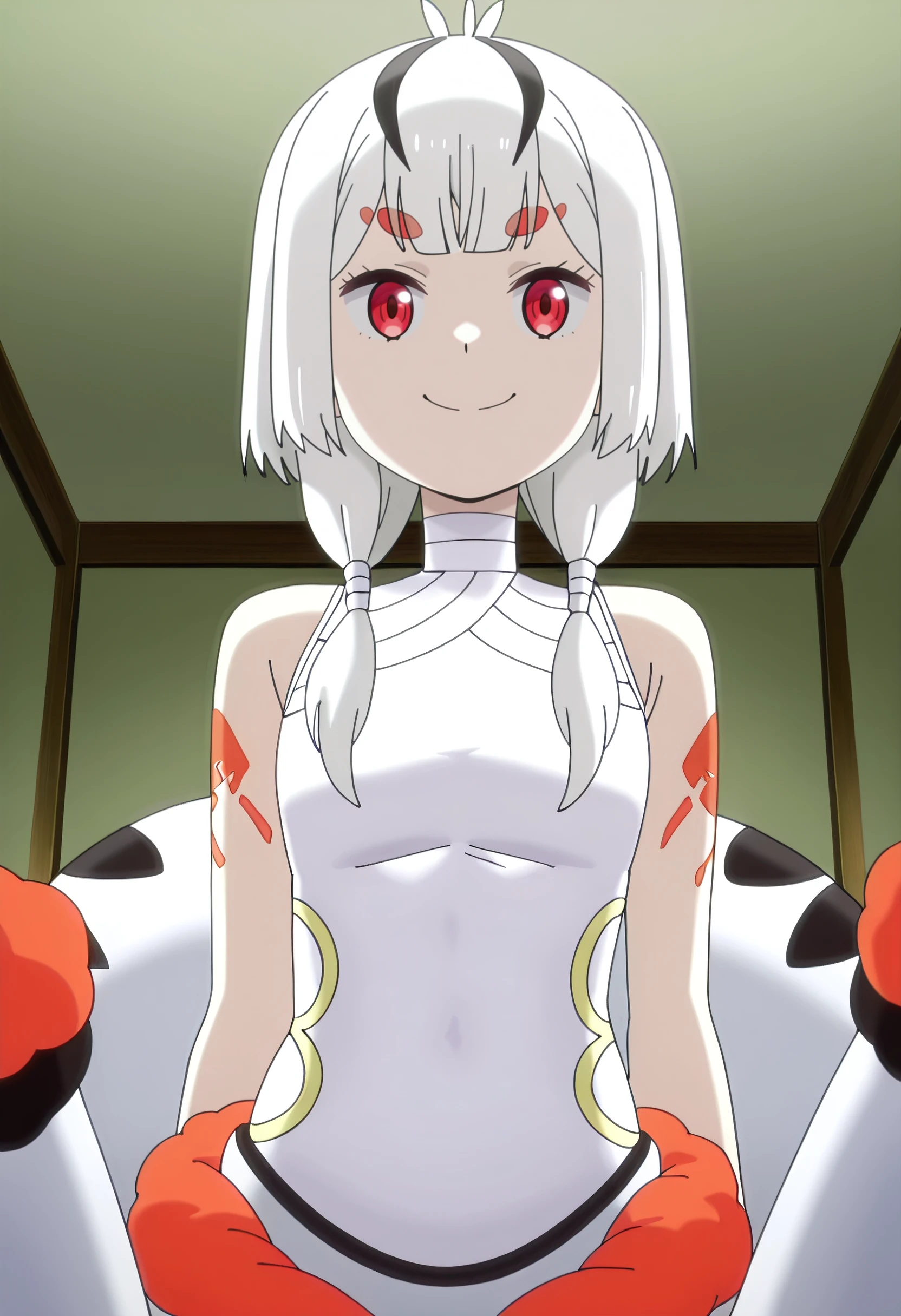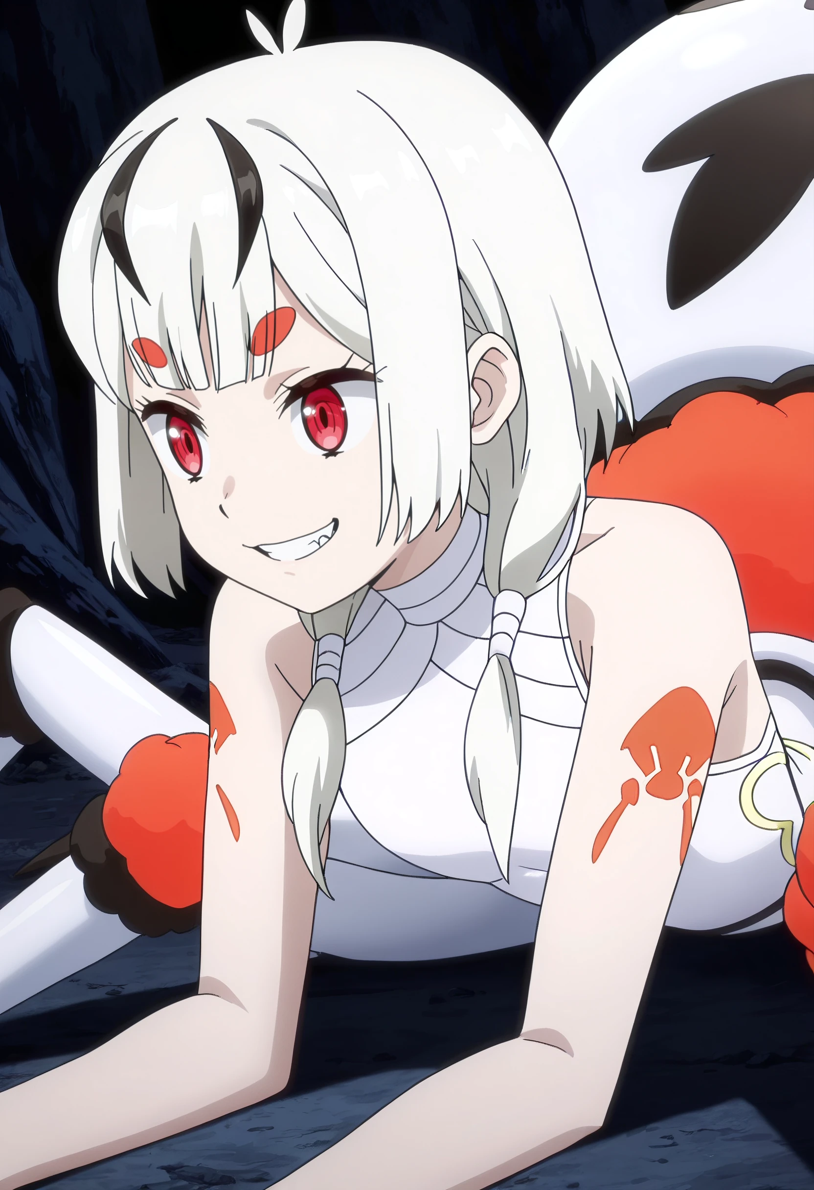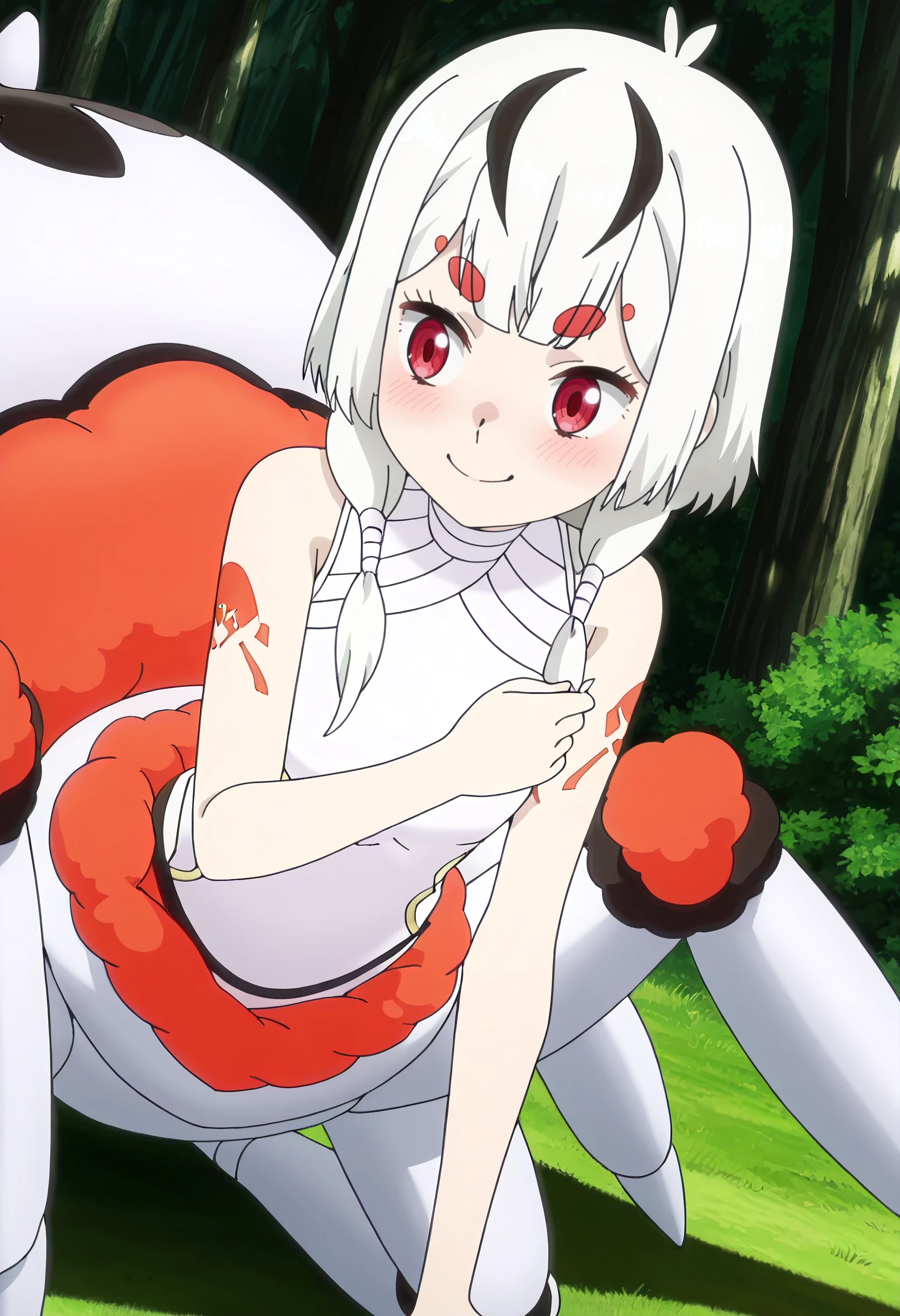 ISNMaple, white hair, red eyes, low twintails, streaked hair, twintails, black hair, short hair, monster girl, arthropod girl, arthropod limbs, arthropod abdomen, multiple legs, arachne, spider girl, thick eyebrows, streaked hair, short eyebrows,