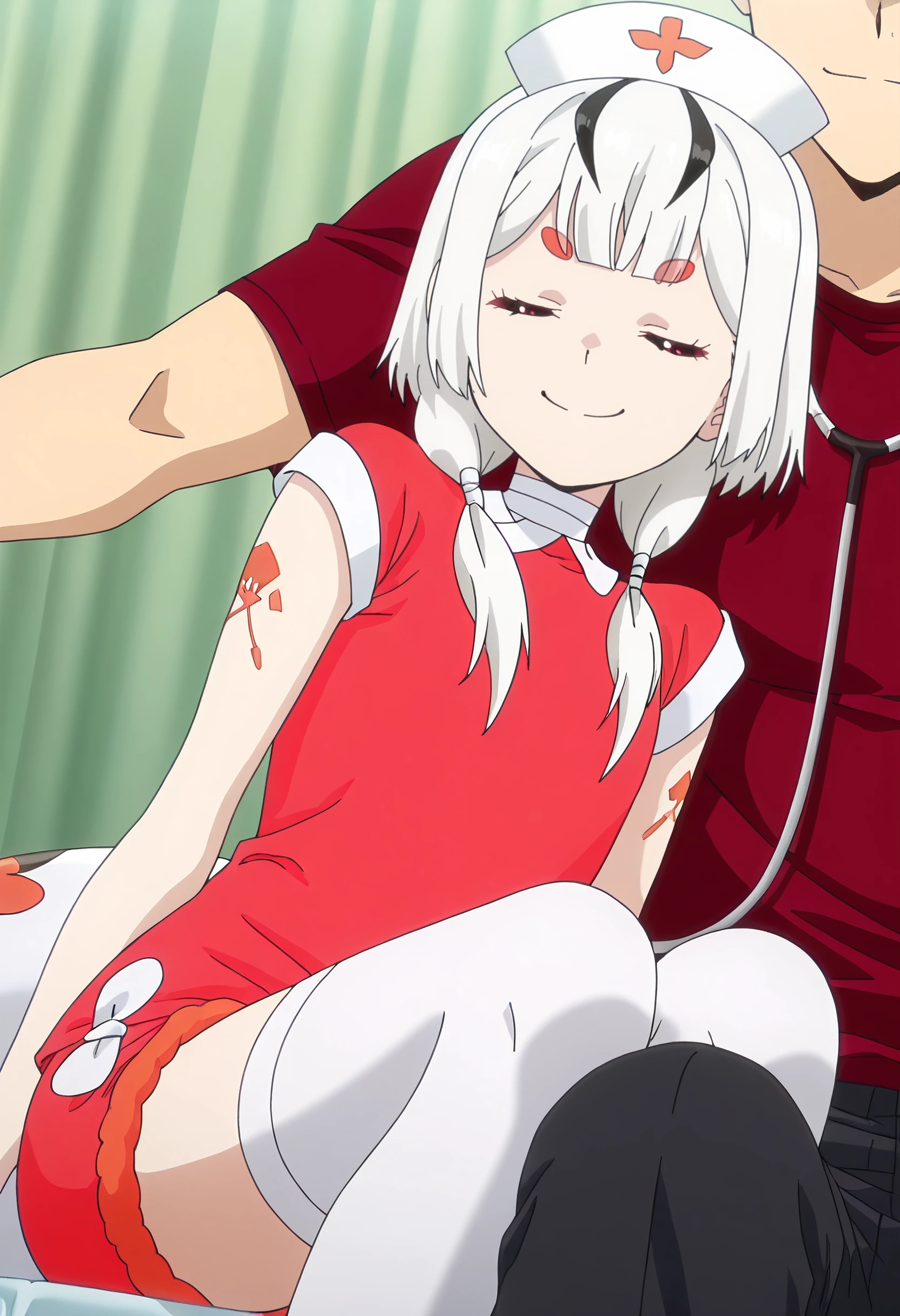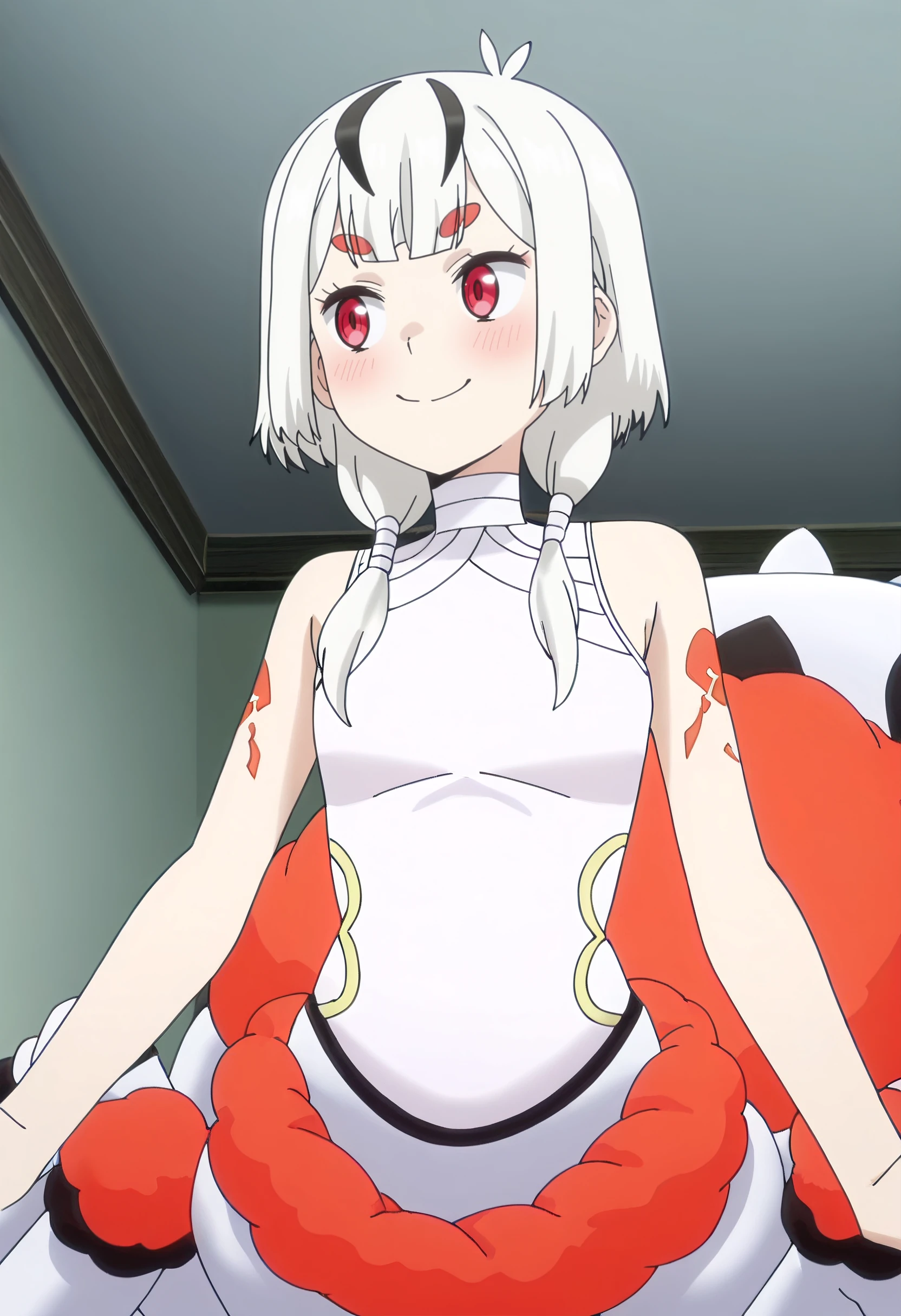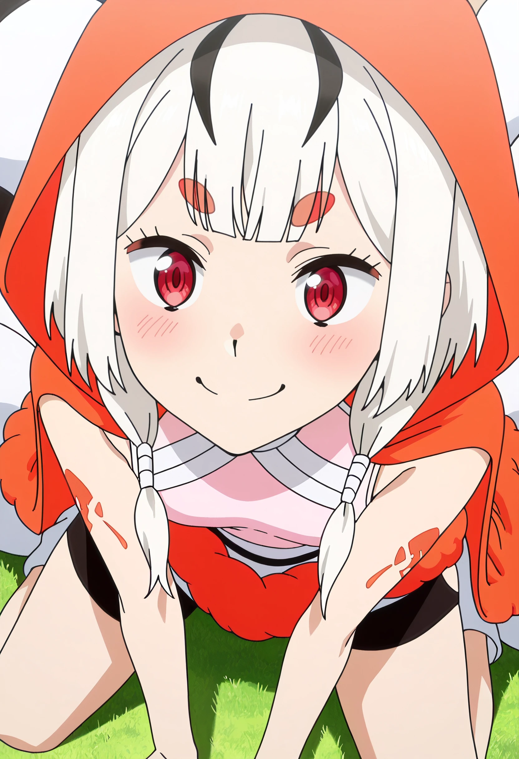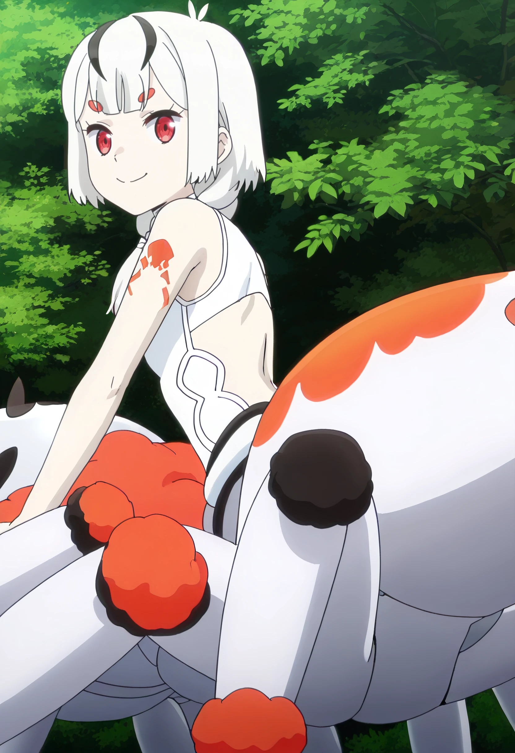 ISNMaple, white hair, red eyes, low twintails, streaked hair, twintails, black hair, short hair, monster girl, arthropod girl, arthropod limbs, arthropod abdomen, multiple legs, arachne, spider girl, thick eyebrows, streaked hair, short eyebrows,