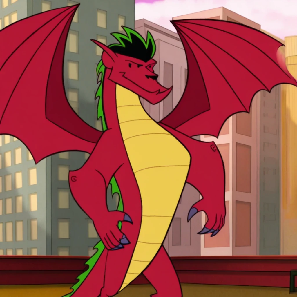 Jake Long, Dragon, Red scales, yellow chest, tail, wings, Black eyes, green hair, black hair, sharp teeth, claws,