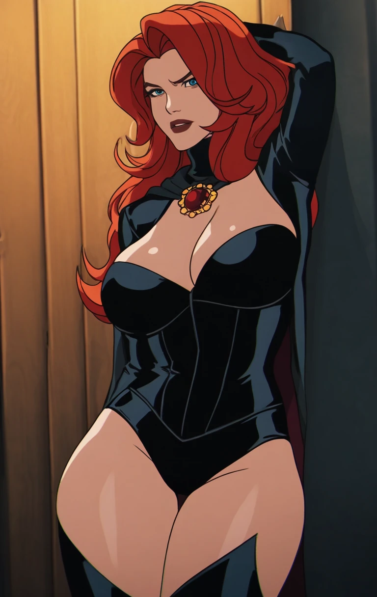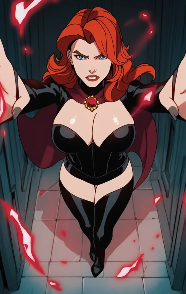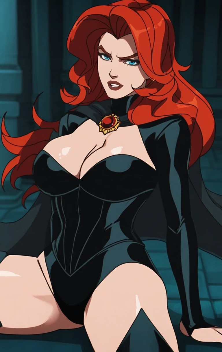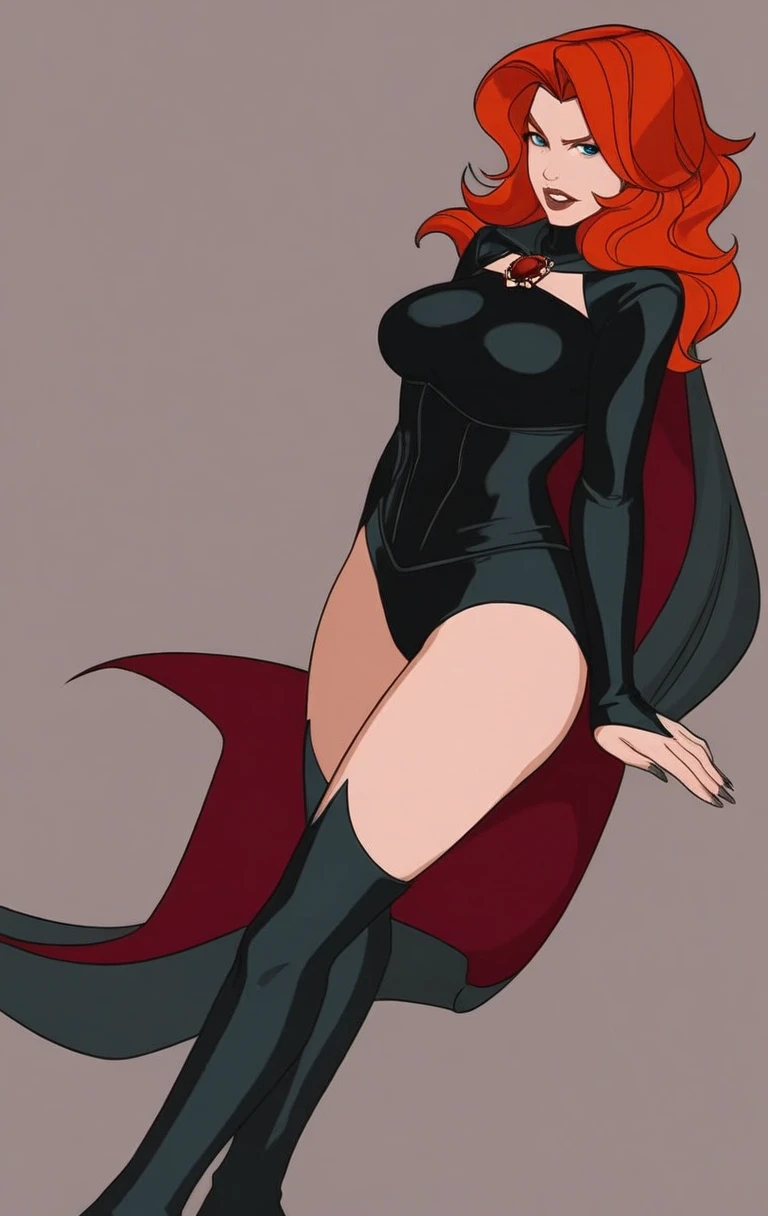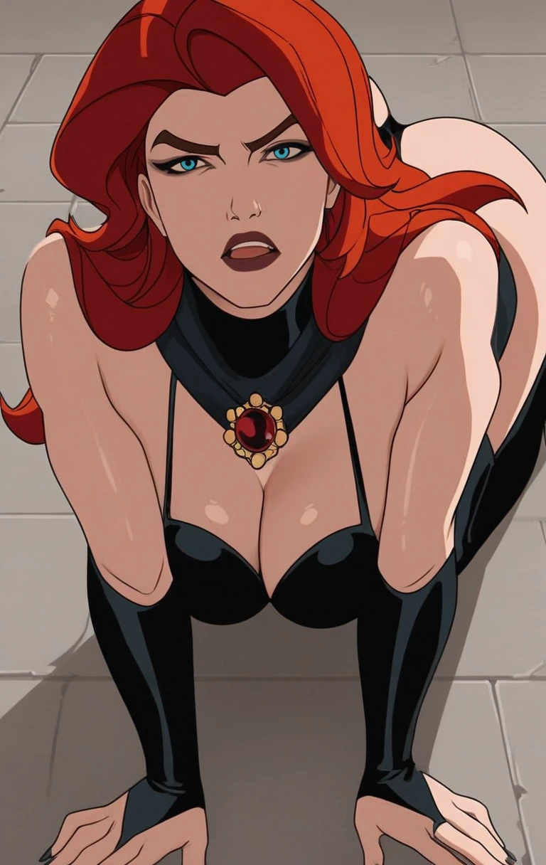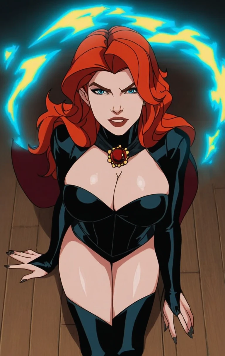 m4d3lyn, 1girl, solo, long hair, looking at viewer, blue eyes, simple background, red hair, necklace, red lips, colored skin, dark skin, turtleneck, colored sclera, dark-skinned female