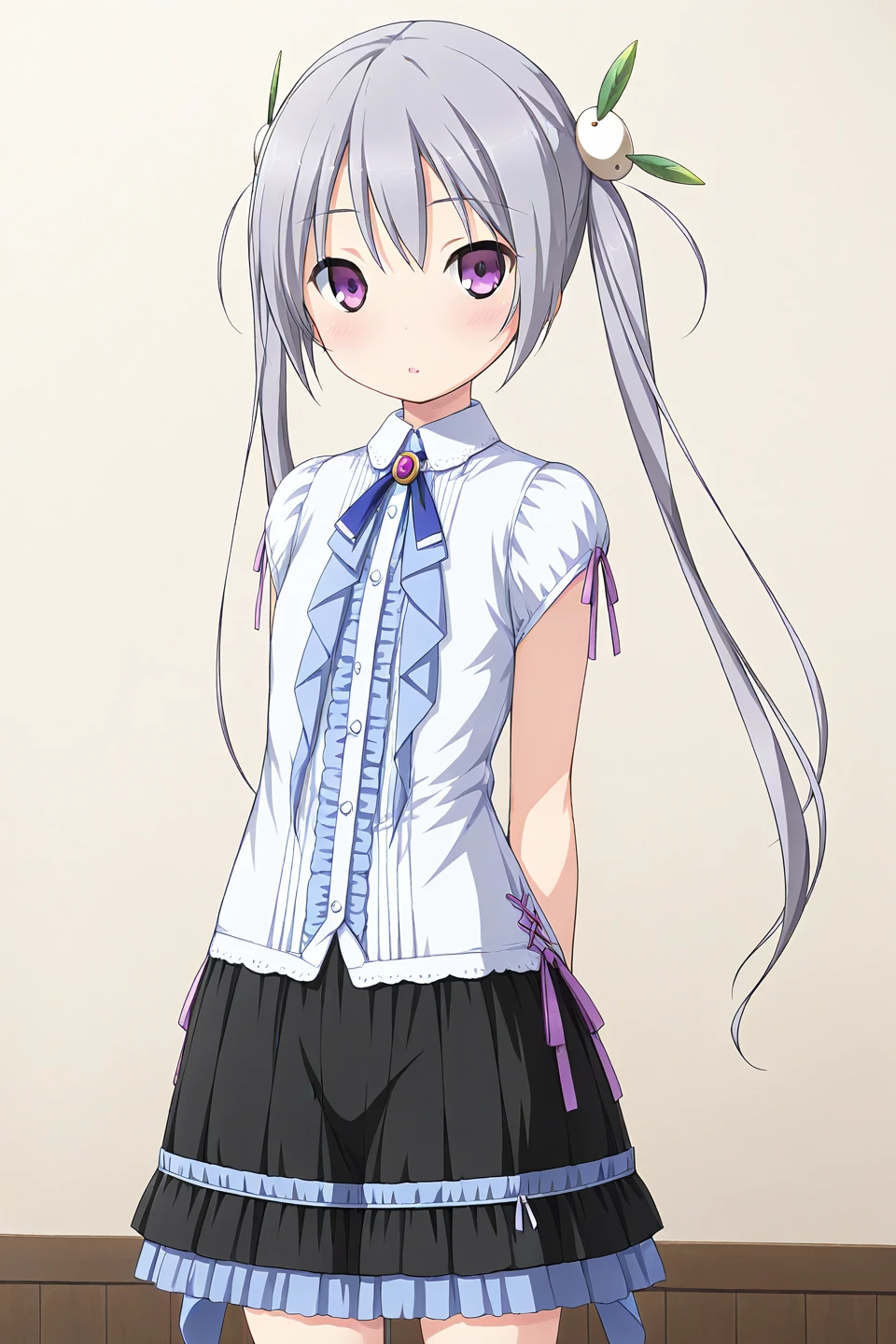 kamine mashiro,1girl,solo,purple eyes,grey hair,long hair,twintails,rabbit hair ornament,leaf hair ornament,snow bunny,