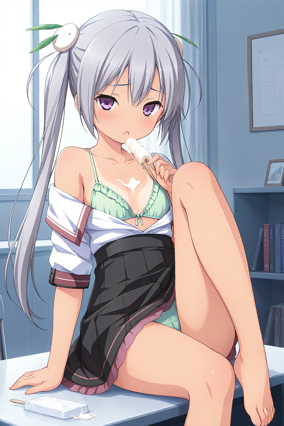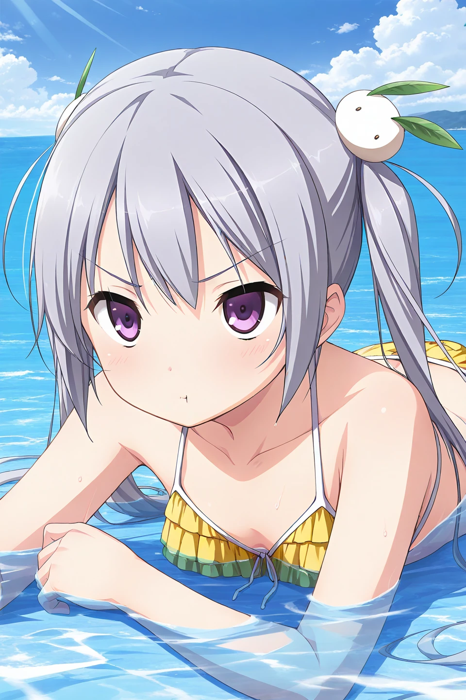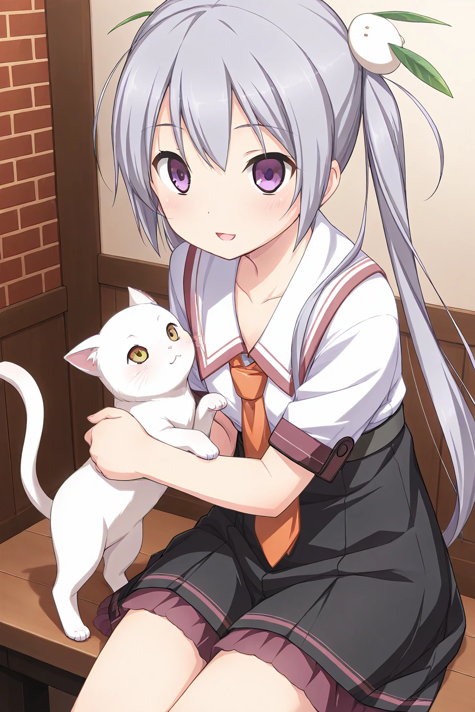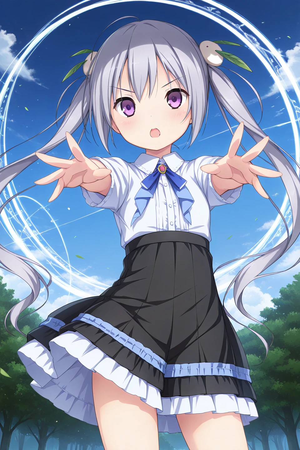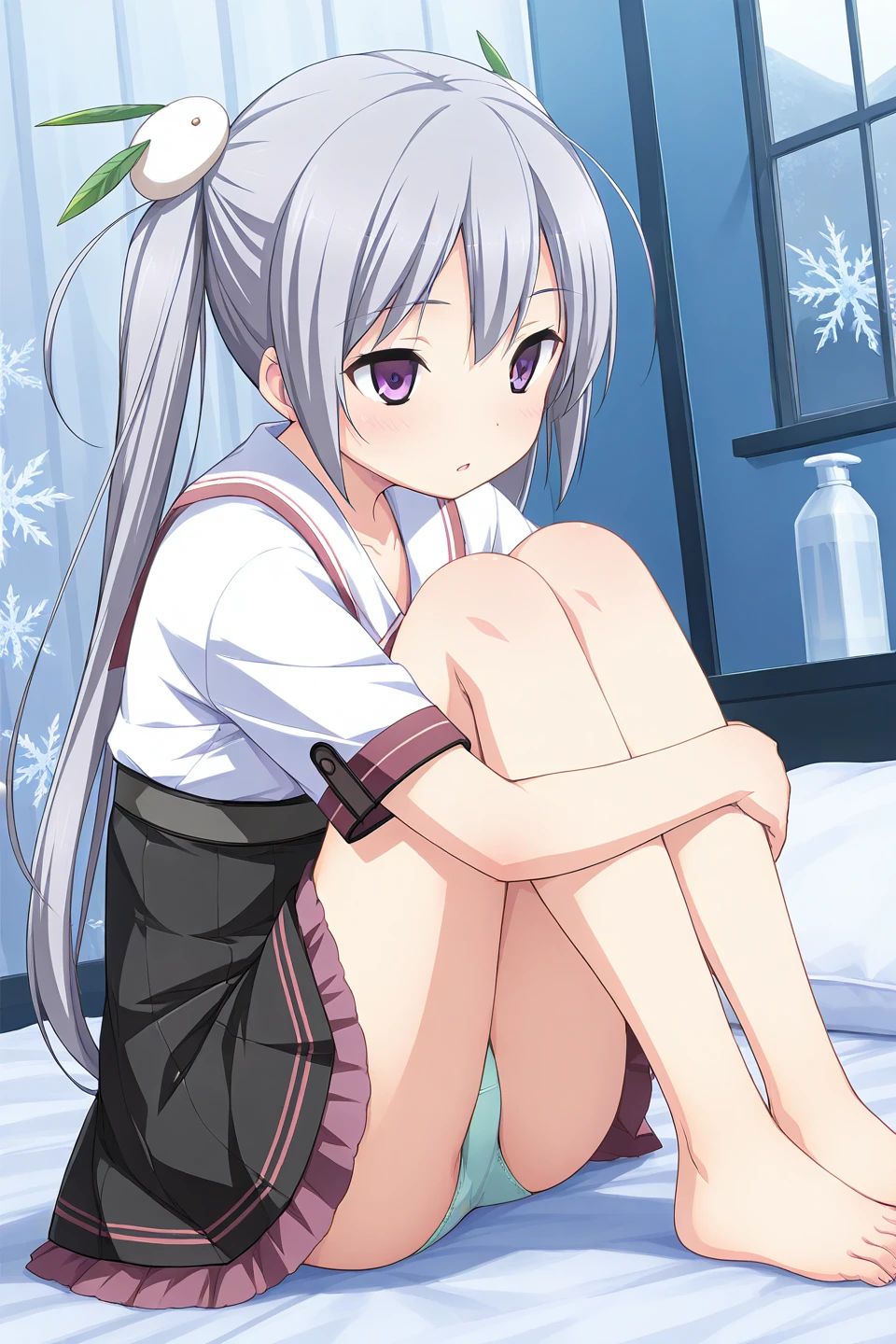 kamine mashiro,purple eyes,grey hair,long hair,twintails,rabbit hair ornament,leaf hair ornament,snow bunny,