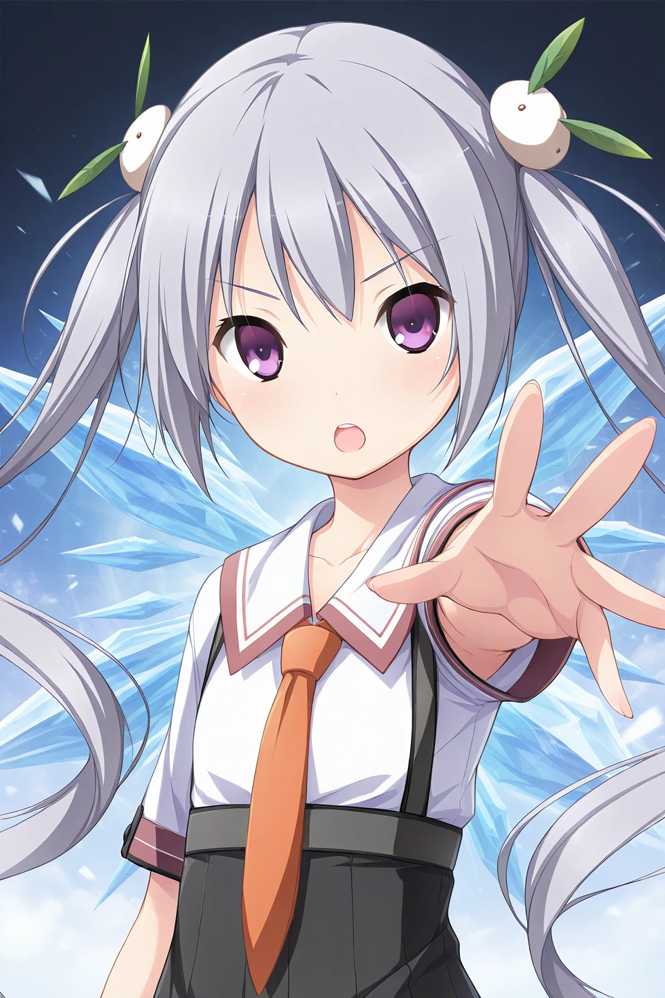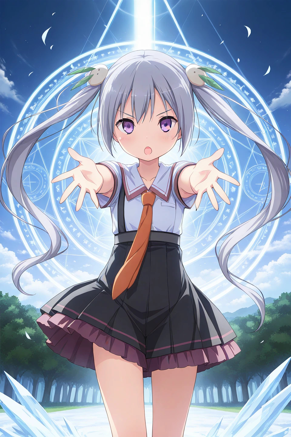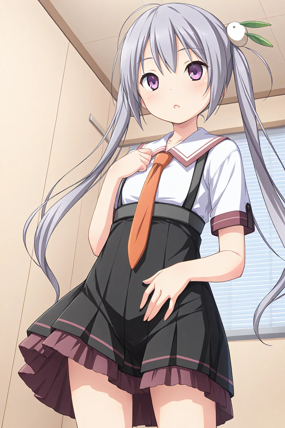 school uniform,orange necktie,serafuku,sailor collar,white shirt,short sleeves,suspender skirt,high-waist skirt,black skirt,pleated skirt,frilled skirt,