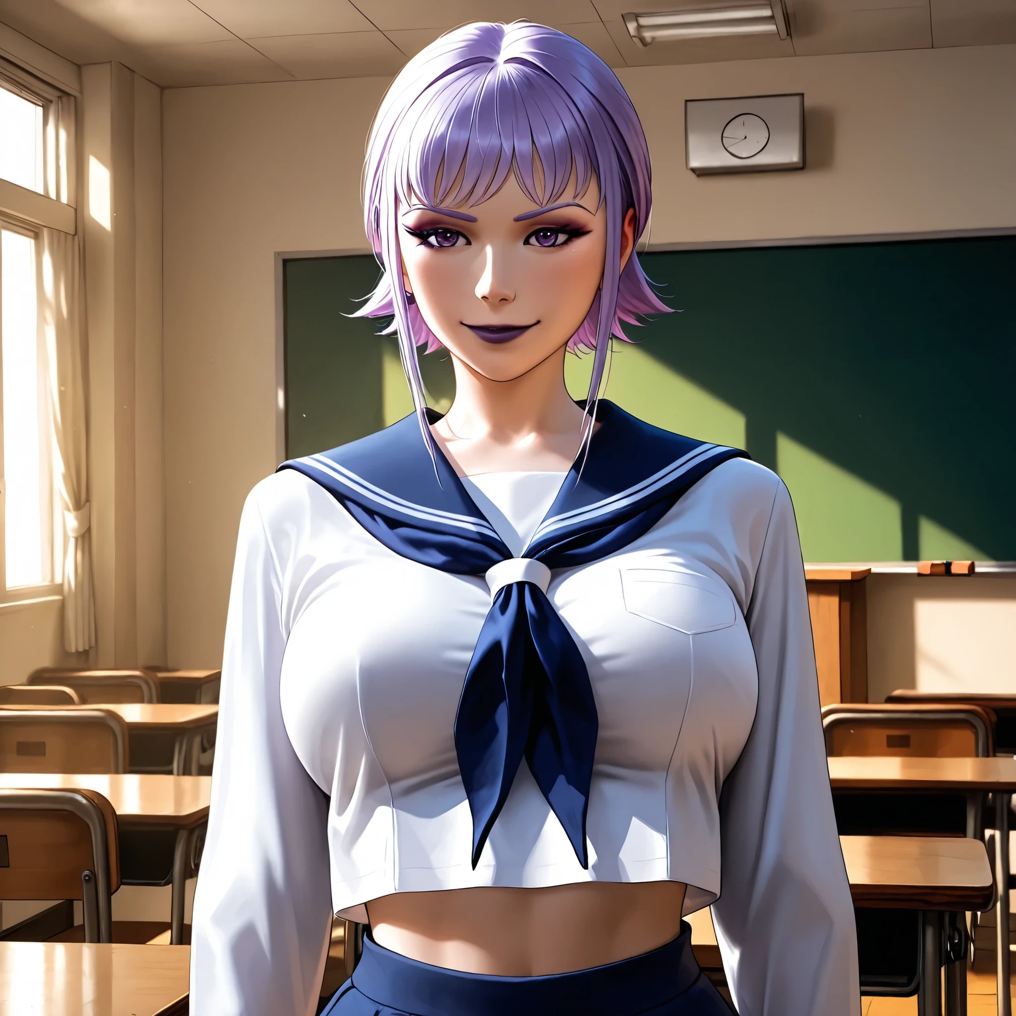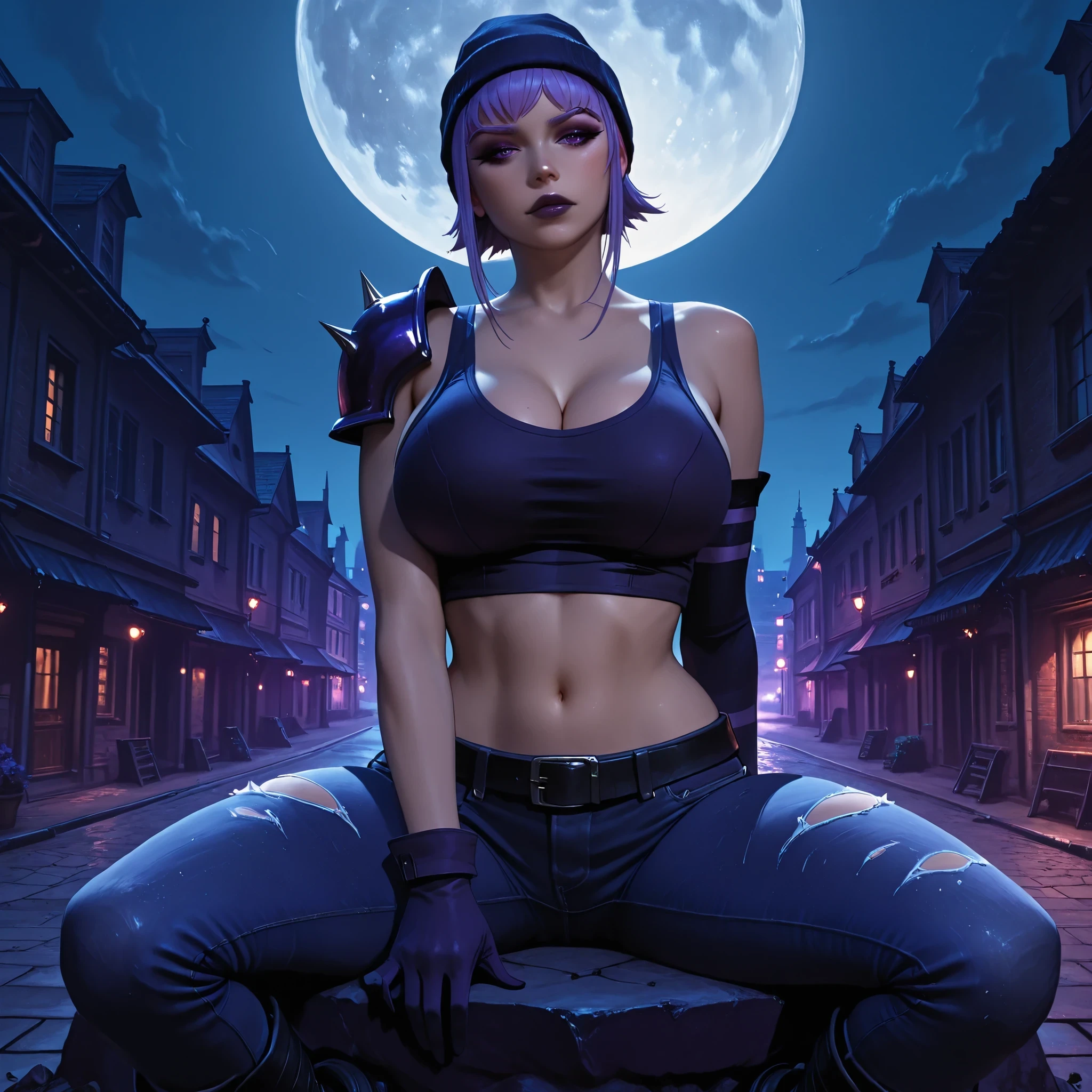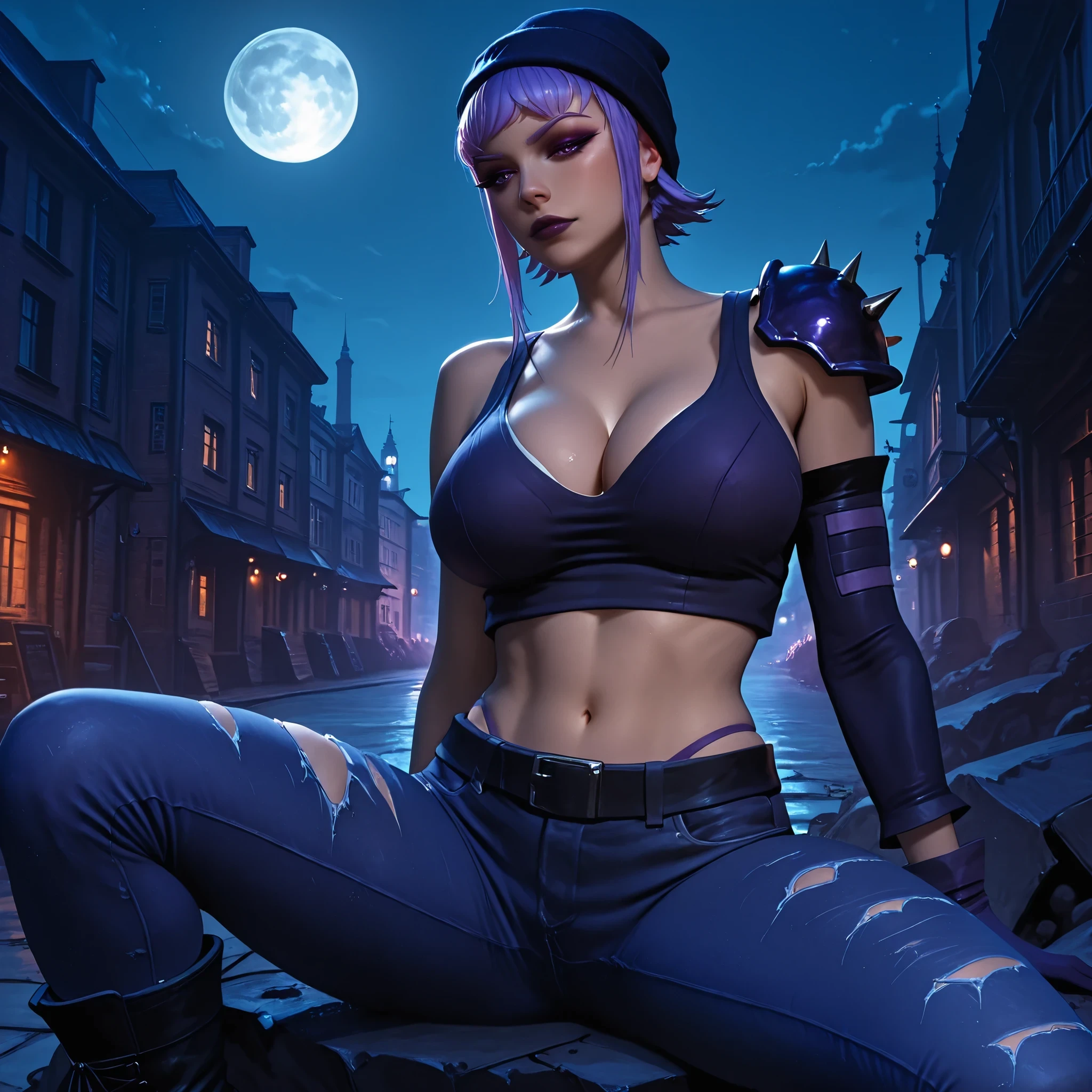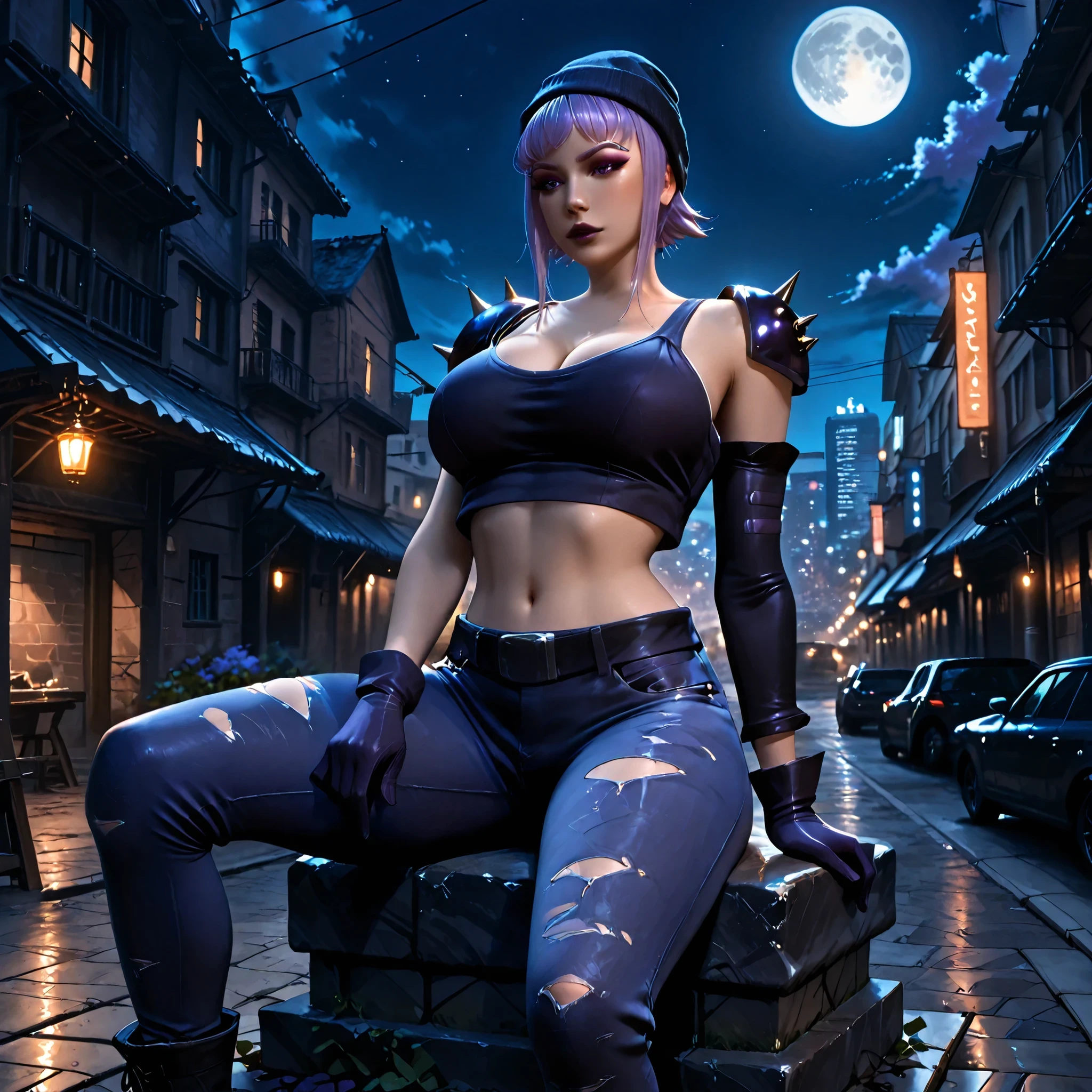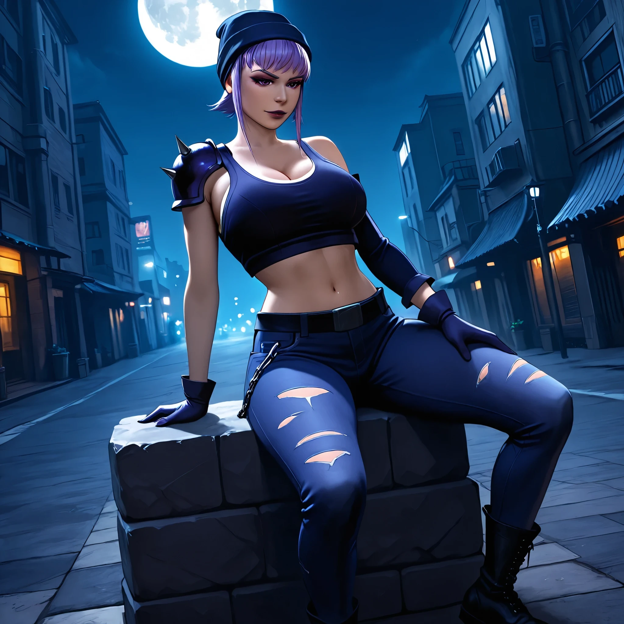 score_9, photorealistic, hyper realistic, ultra detailed, high quality. r3b0und, lilac hair, short hair, side locks, lilac eyes, lilac eyebrows, ???????????, thin waist, wide ????, eyeliner, dark lilac eyeshadow, dark lilac lipstick, dark lilac beanie, dark lilac crop top, dark lilac single spiked shoulder pad, belt, ripped jeans, cleavage, navel, dark lilac gloves, dark lilac single detached sleeve, black combat boots. night, modern city, full moon, modern buildings. sitting on a slab, ???? pose, sensual expression. cinematic lighting, soft light.