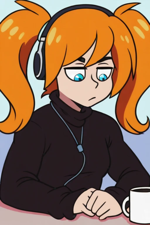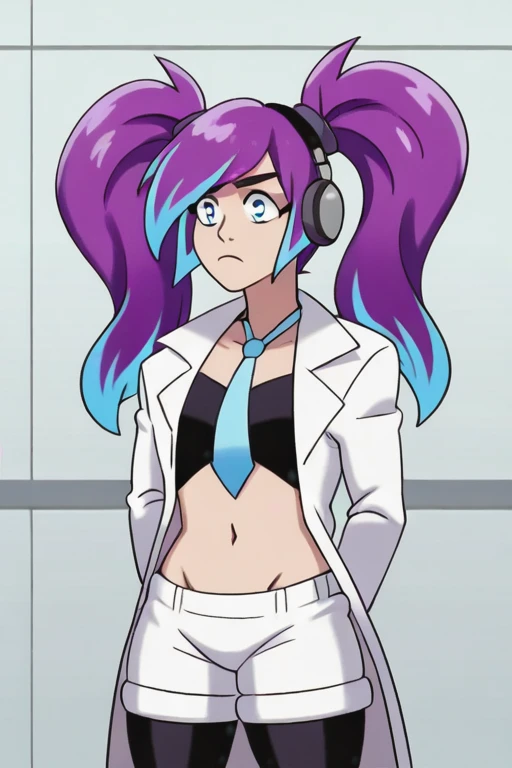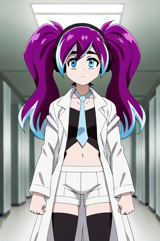 GlitchProdBo, Purple Hair, Blue Highlights,Twintails, Blue Eyes, Glasses, headphones,White Labcoat, Black Croptop, Blue Tie, White Shorts, black thighhighs
