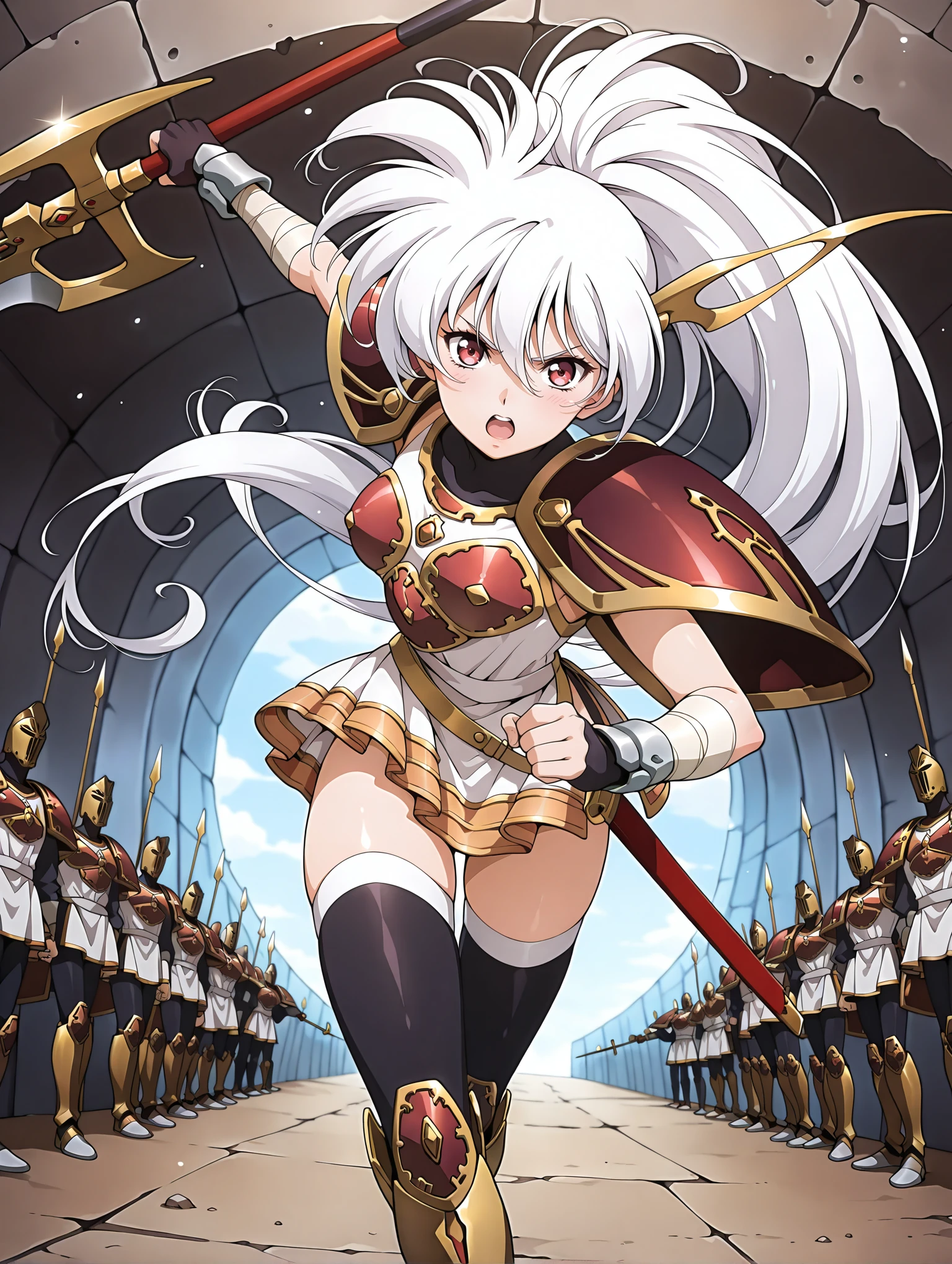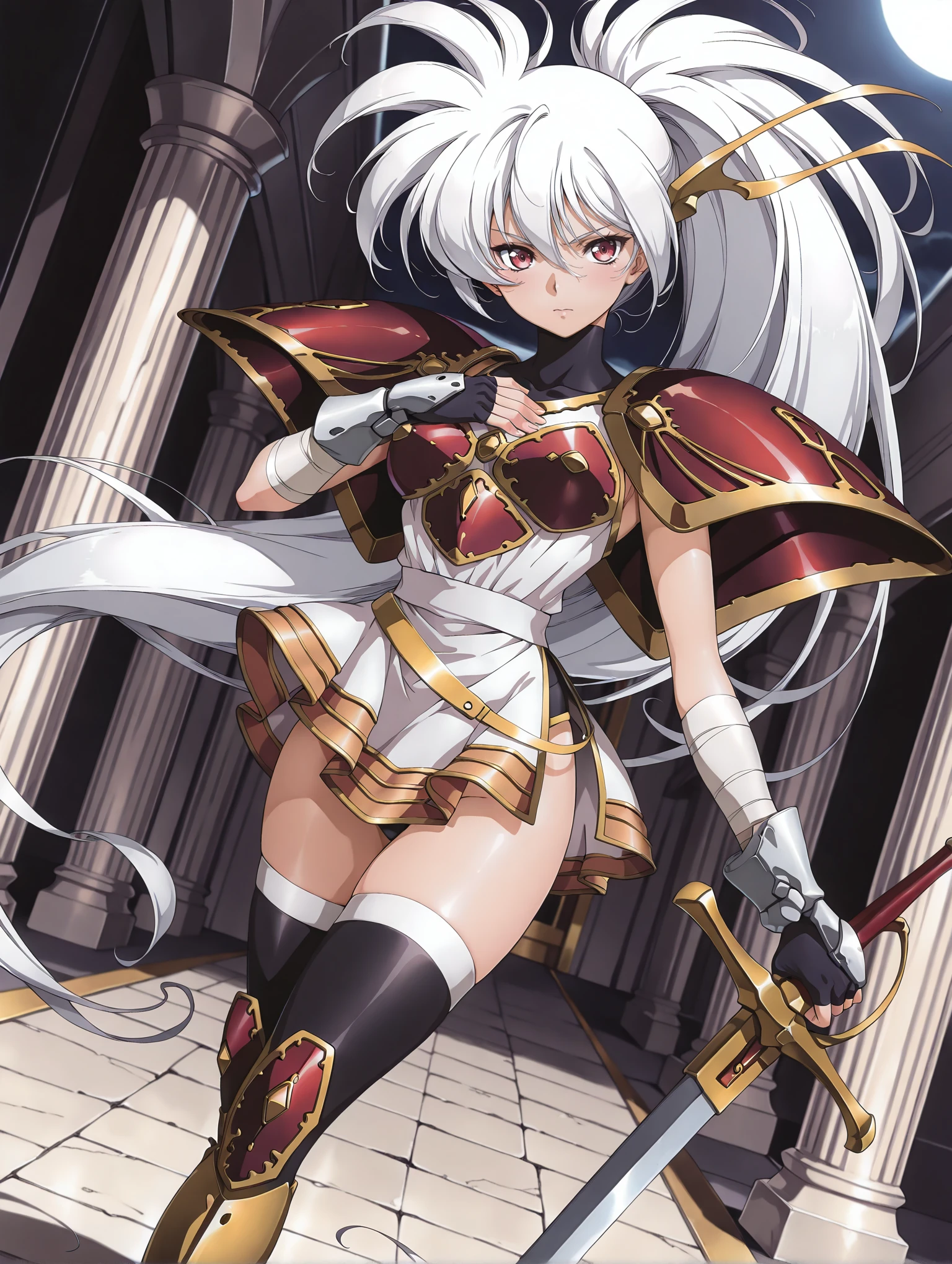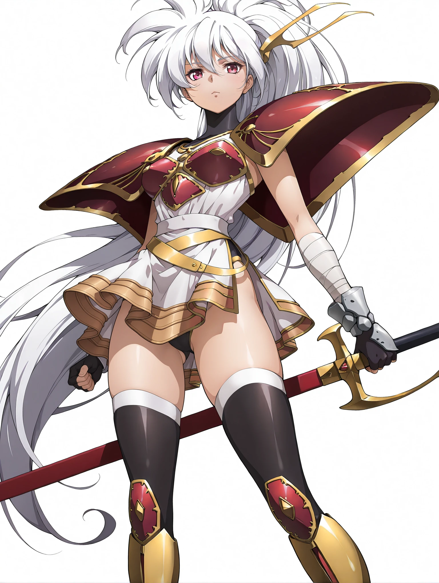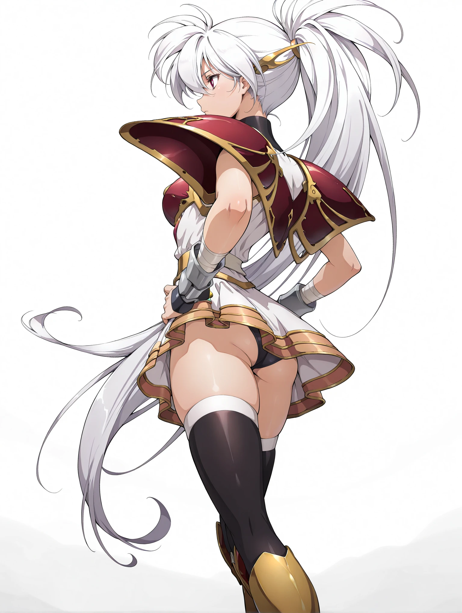 l_clothes,shoulder armor,red breast plate,miniskirt,black thighhighs,knee boots,