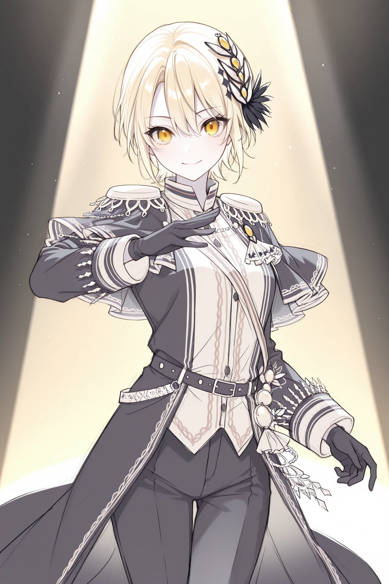 short hair,blonde hair,hair between eyes,yellow eyes,hair ornament,