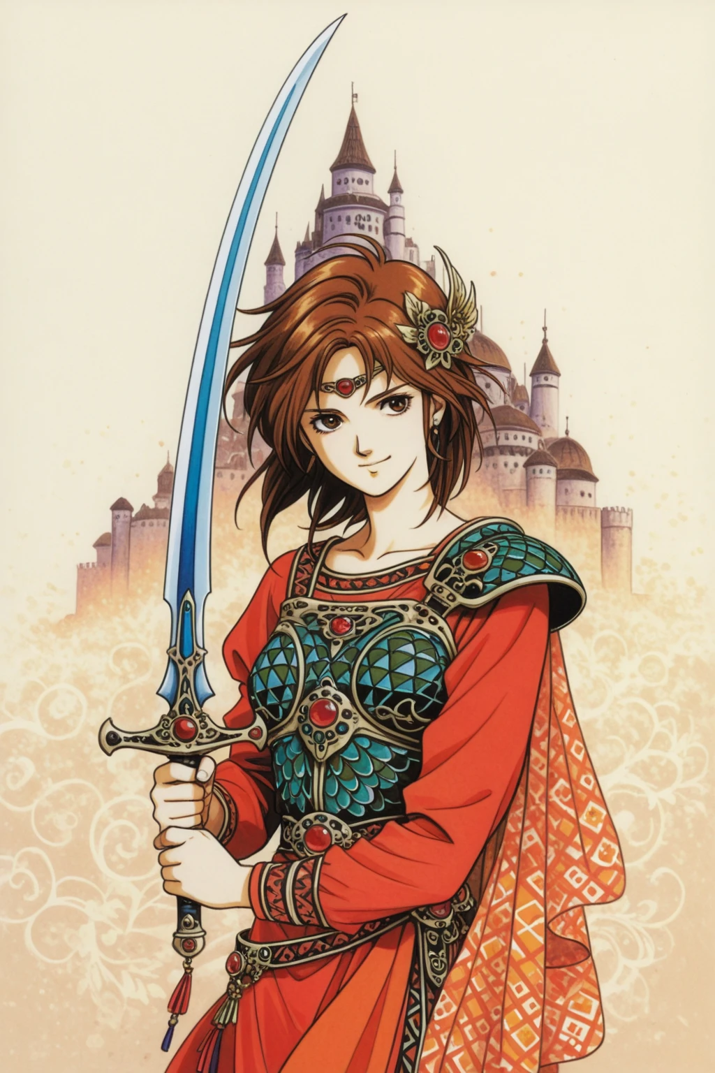 Several designs in the training data were made by Yoshitaka Amano, with his typical flowing, delicate armor designs. Just try going crazy with patterns and colours here. Oh and it does a really nice curved sword.