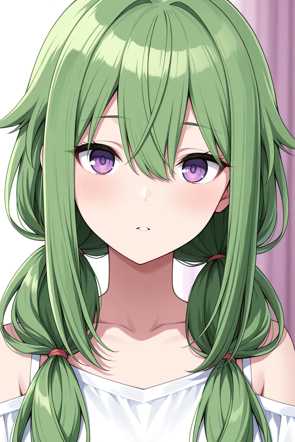 nenechan, long hair, green hair, purple eyes, bangs, hair between eyes, low twintails
