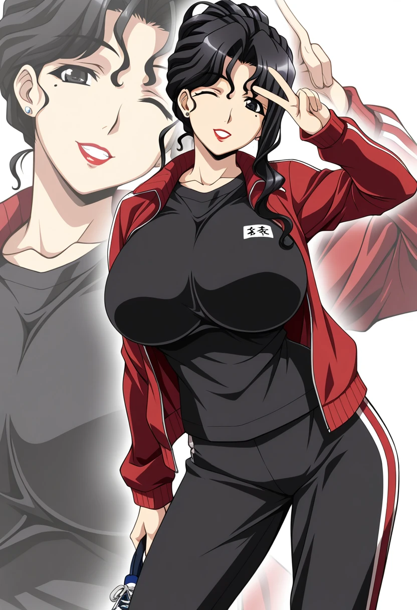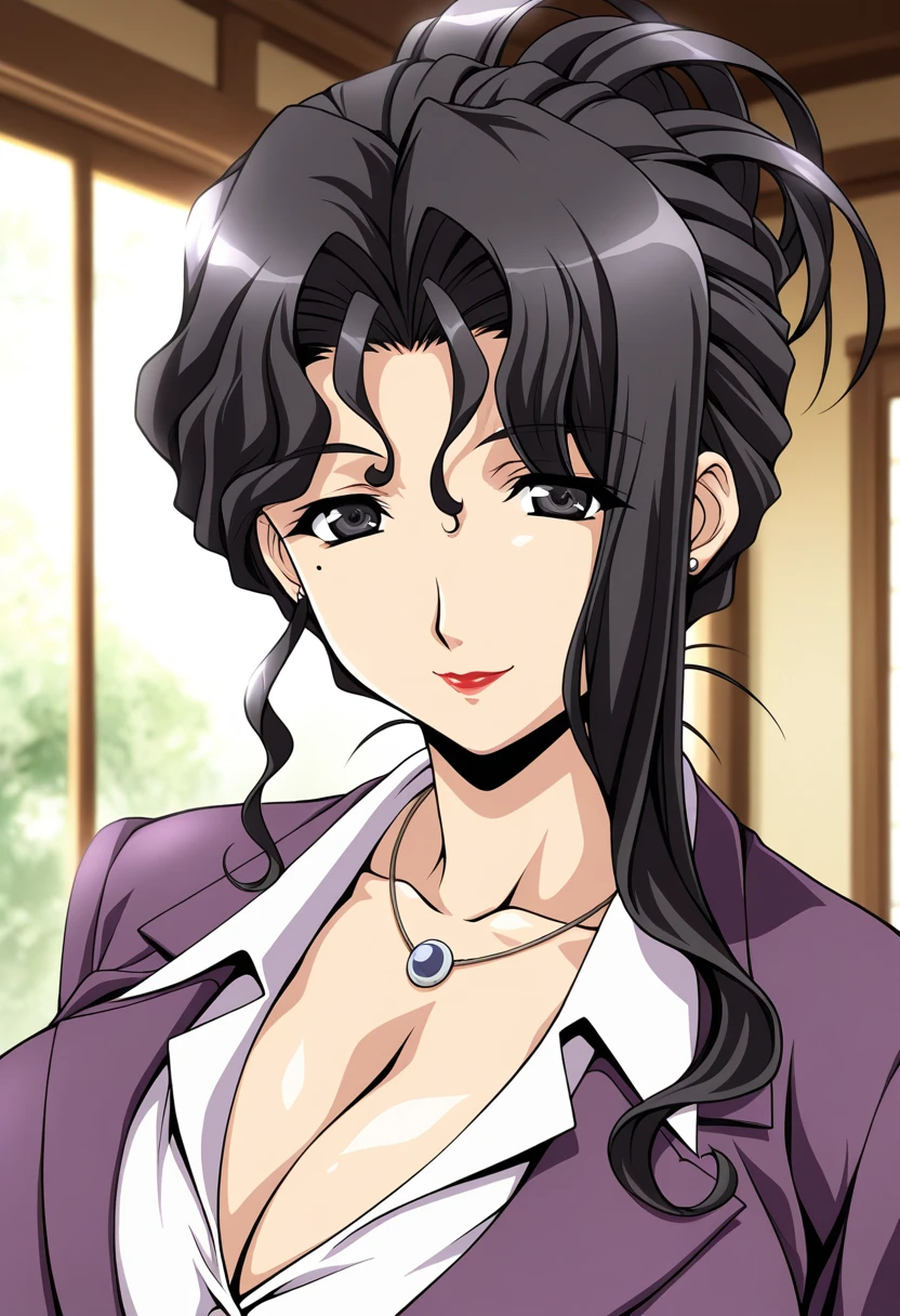 • miyabi, mature female, curvy, black eyes, black hair, long hair, wavy hair, hair up, updo, parted bangs, hair between eyes, asymmetrical sidelocks, mole under eye, red lips, stud earrings, huge breasts,