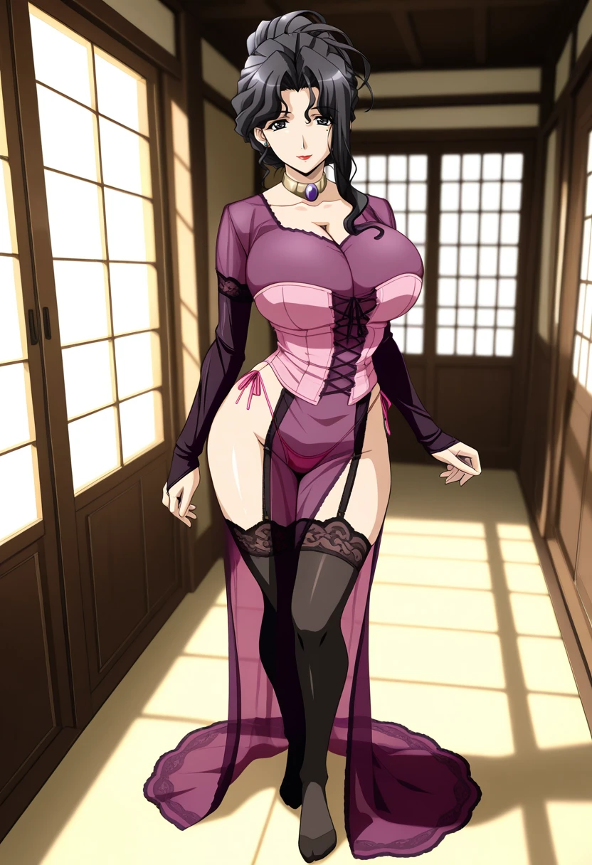 neck ring, brooch, see-through nightgown, purple nightgown, long sleeves, side slit, pink bustier, black gloves, bridal gauntlets, lace-trimmed gloves, garter belt, garter straps, pink panties, string panties, side-tie panties, highleg panties, thong, black thighhighs, lace-trimmed thighhighs,