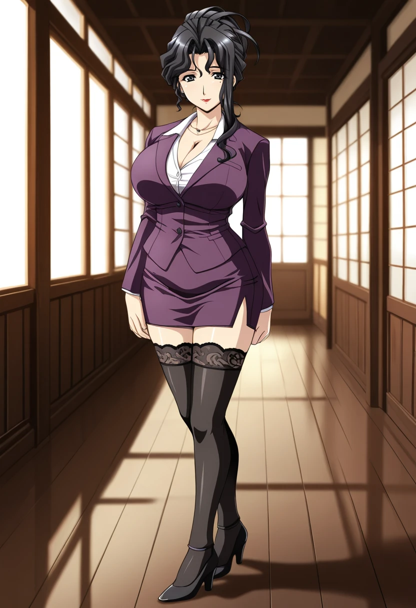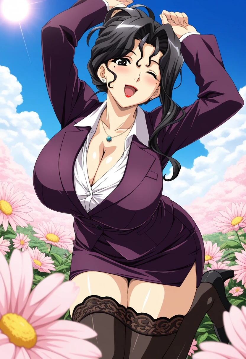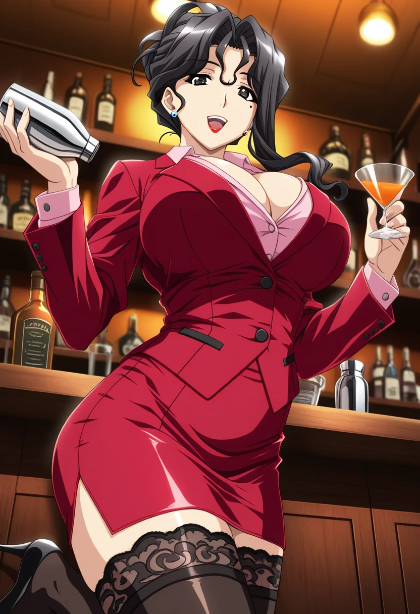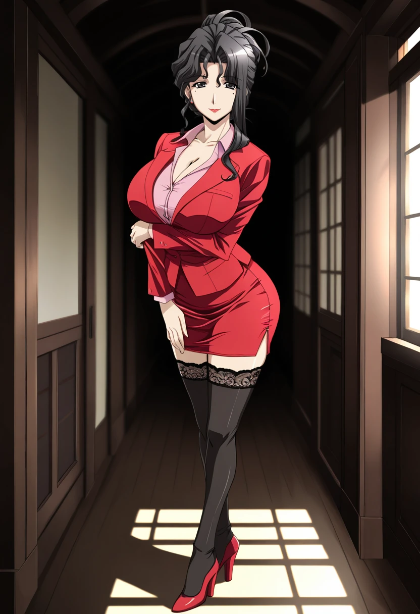 miyabi, mature female, curvy, black eyes, black hair, long hair, wavy hair, hair up, updo, parted bangs, hair between eyes, asymmetrical sidelocks, mole under eye, red lips, stud earrings, huge breasts,