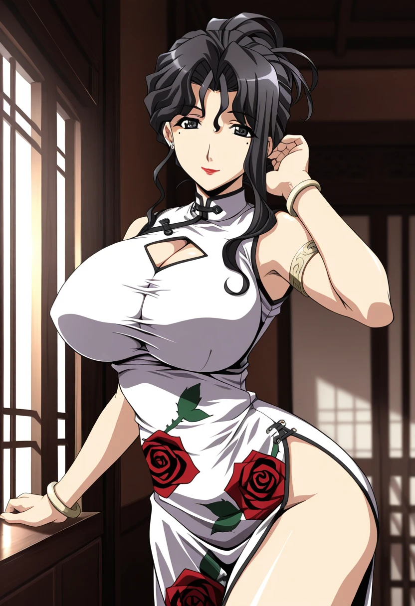 • china dress, taut clothes, impossible dress, white dress, print dress, rose print, red rose, sleeveless turtleneck, cleavage cutout, side slit, armlet, bracelet,