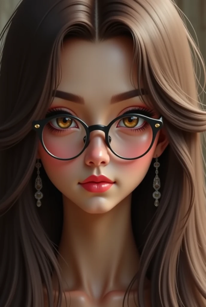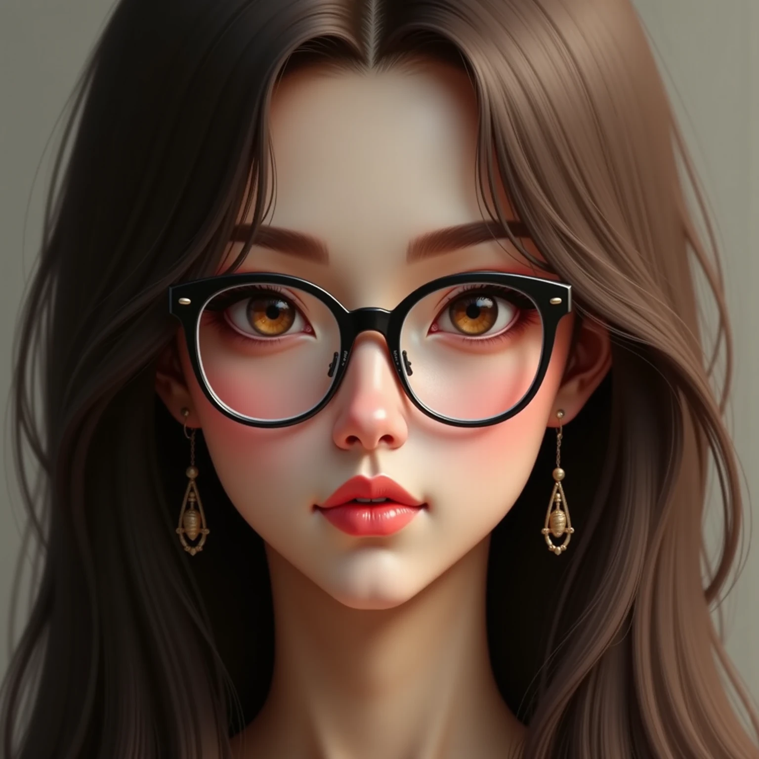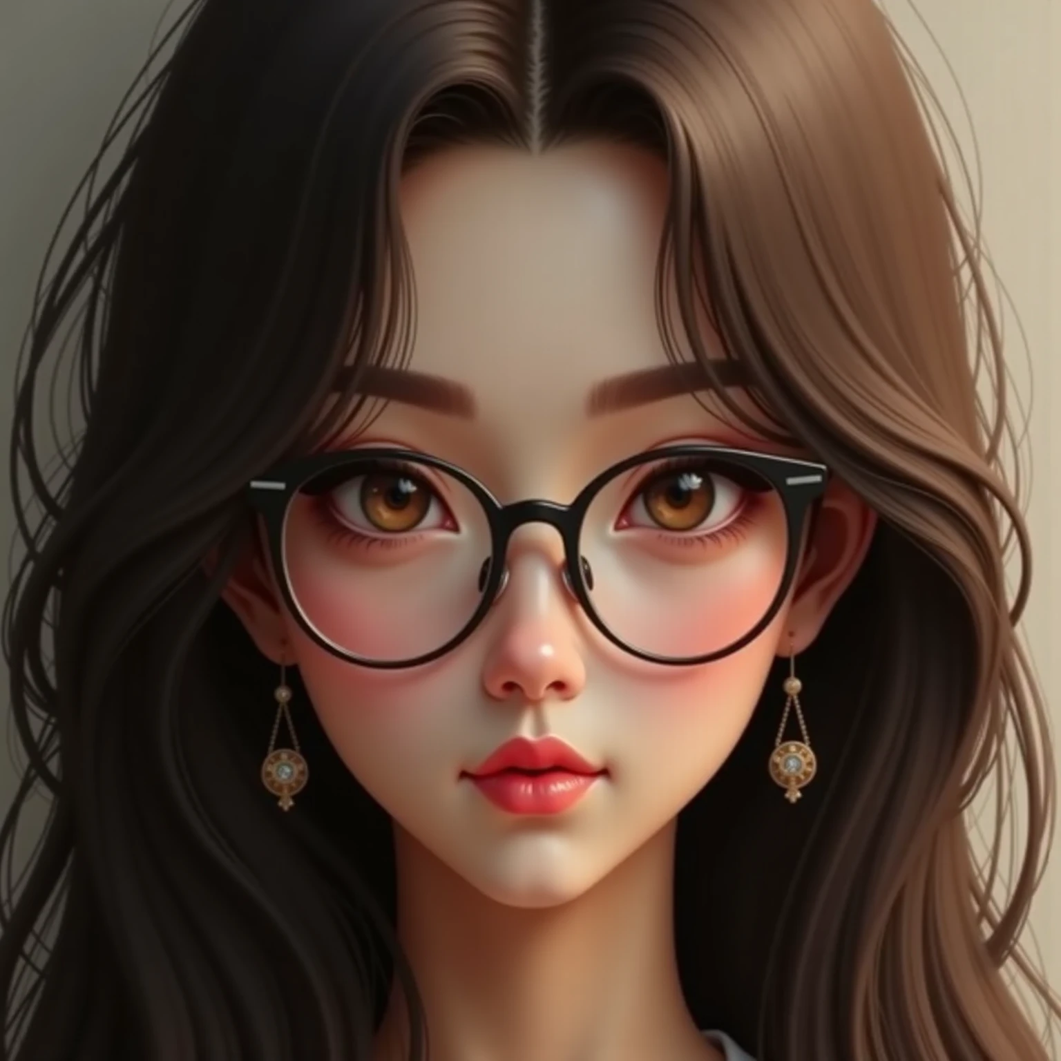 メガネ女子の真面目な顔のアップ写真。クローズアップのポートレートで、穏やかな表情の若い女性を捉えています。彼女の目は印象的な茶色で、銀色のスタッドが付いた丸い黒縁メガネをかけています。彼女の髪はゆるやかなウェーブがかっており、肩まで流れています。彼女は涙滴型のデザインの大きな垂れ下がるイヤリングを着けており、唇は淡いピンク色に塗られています。設定は屋内のようで、背景をぼかすことで画像に奥行きが加わっています。照明は柔らかく拡散しており、彼女の顔の輪郭とイヤリングのディテールが際立っています。画像のスタイルは写実的で、過度な照明なしで被写体の本質を捉えています。