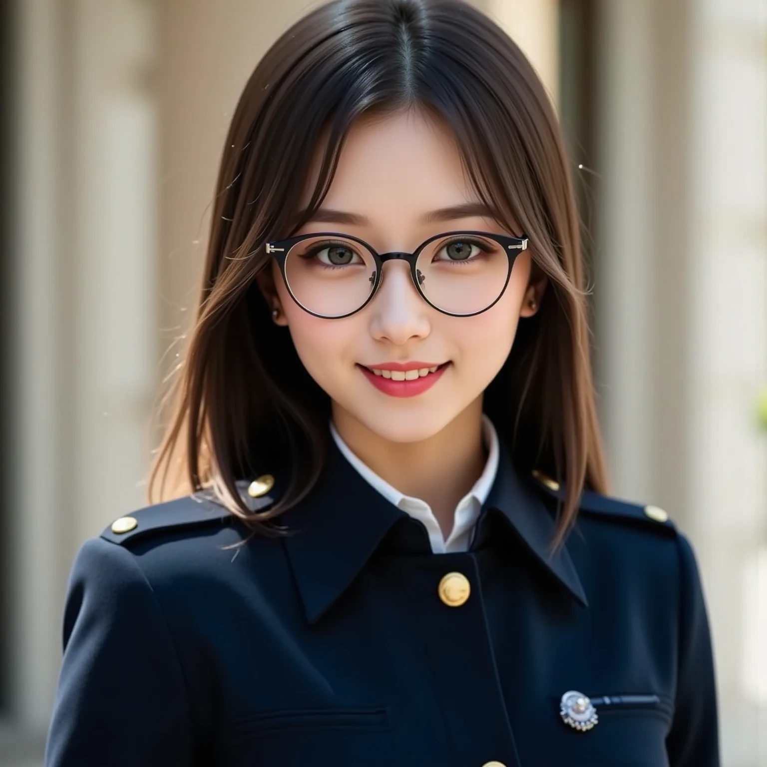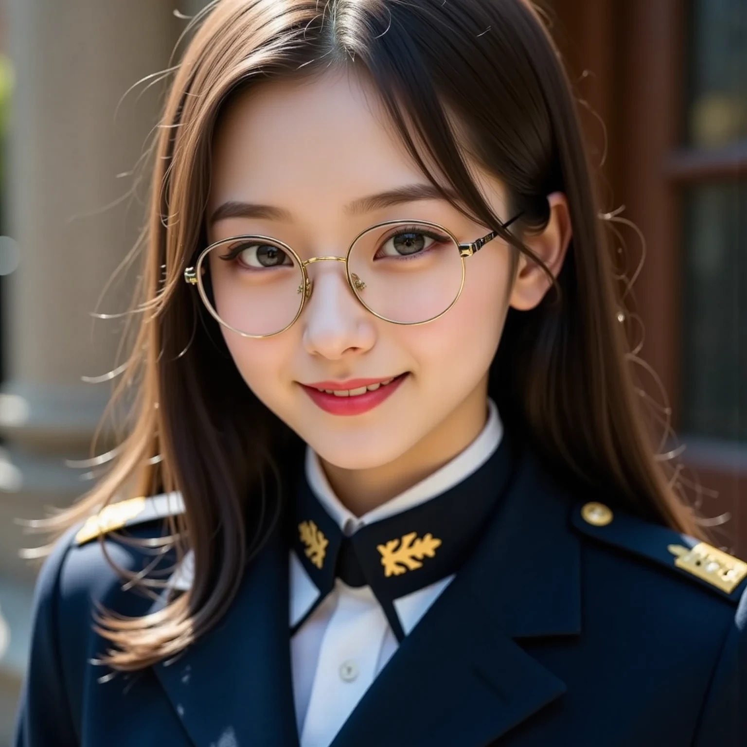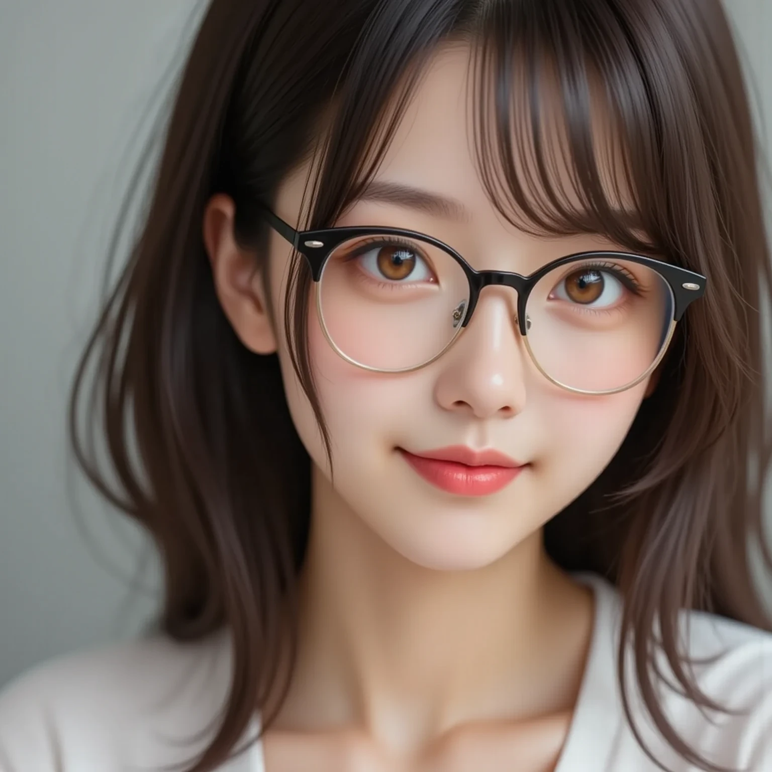 メガネ女子の真面目な顔のアップ写真。クローズアップのポートレートで、穏やかな表情の若い女性を捉えています。彼女の目は印象的な茶色で、銀色のスタッドが付いた丸い黒縁メガネをかけています。彼女の髪はゆるやかなウェーブがかっており、肩まで流れています。彼女は涙滴型のデザインの大きな垂れ下がるイヤリングを着けており、唇は淡いピンク色に塗られています。設定は屋内のようで、背景をぼかすことで画像に奥行きが加わっています。照明は柔らかく拡散しており、彼女の顔の輪郭とイヤリングのディテールが際立っています。画像のスタイルは写実的で、過度な照明なしで被写体の本質を捉えています。