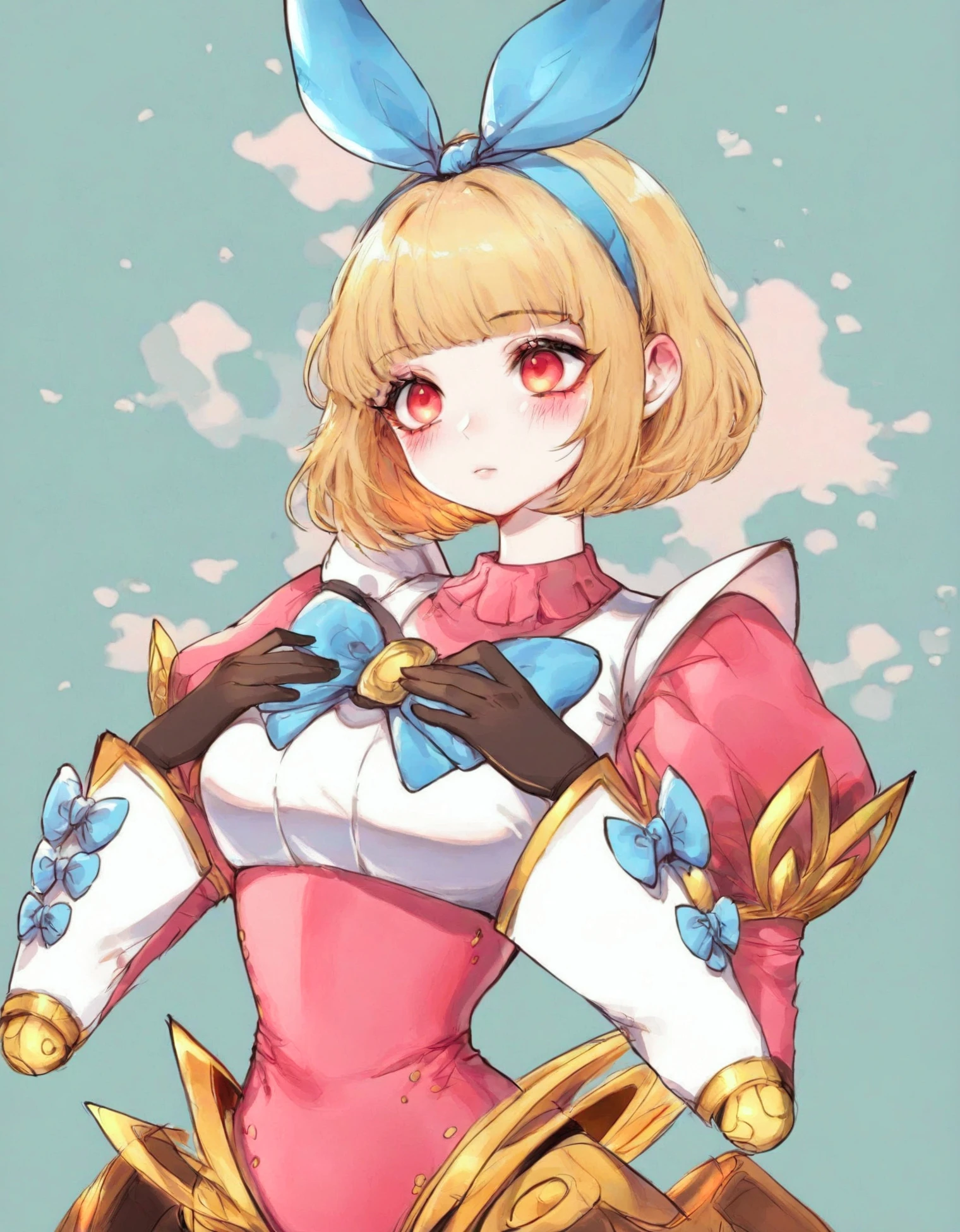 angela, 1girl, short hair, solo, bow, gloves, bangs, blue bow, blonde hair, joints, red eyes, hair bow, hairband, puffy sleeves