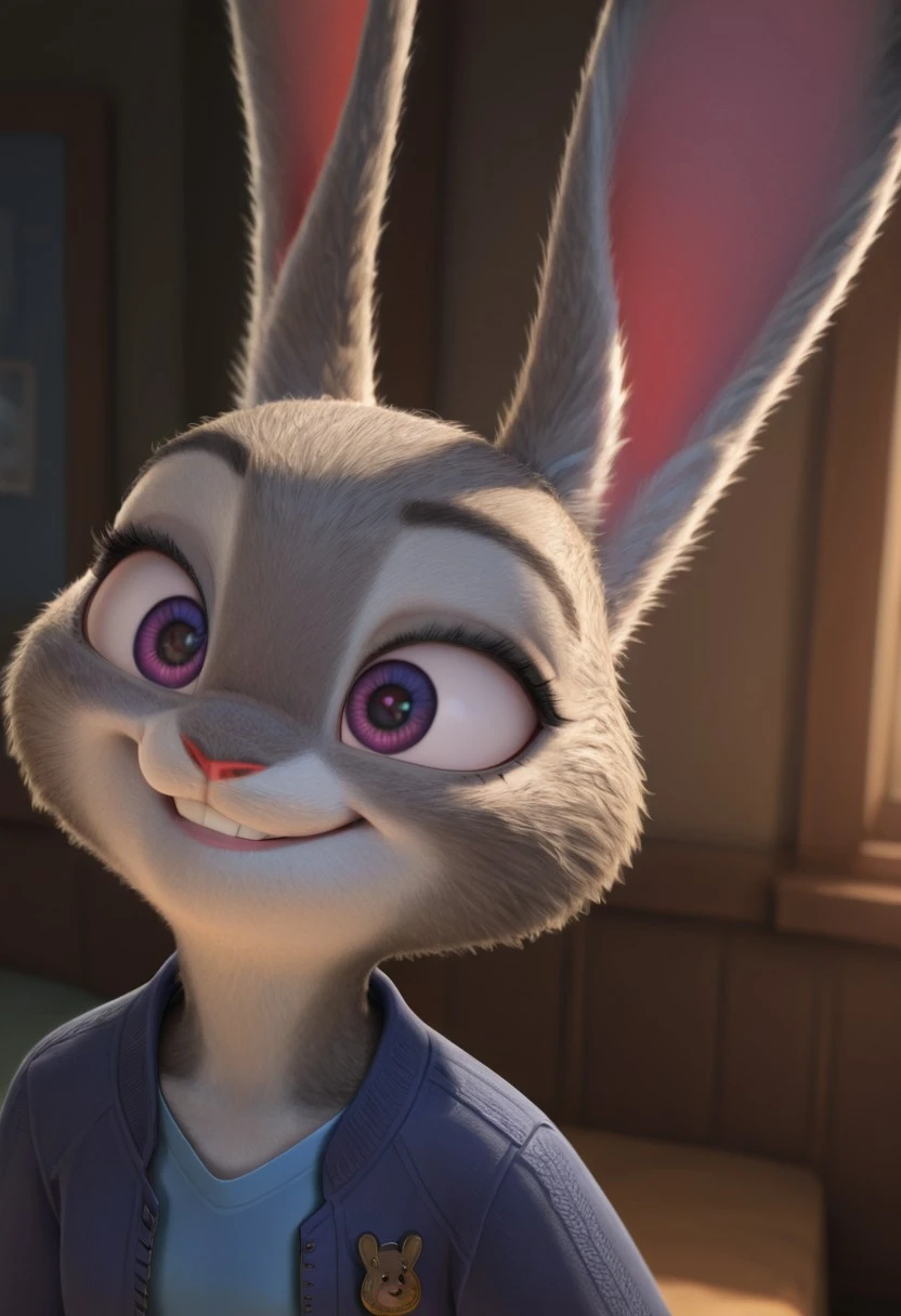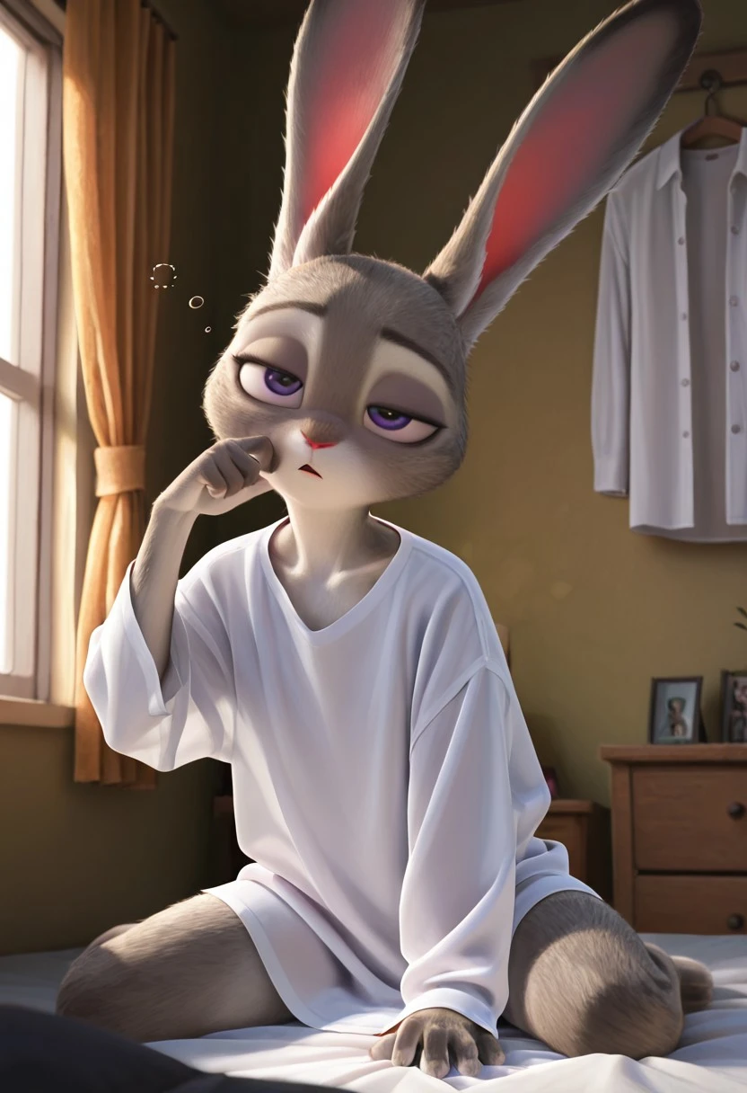 judhoppsv1,1girl,solo,purple eyes, rabbit ears, rabbit girl, two tone fur, grey fur, white fur