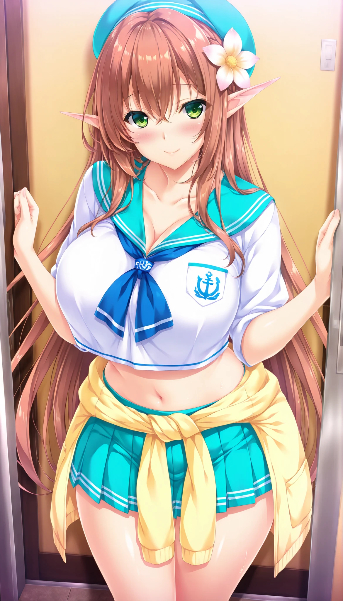 Aoe Kuon, long hair, brown hair, green eyes, pointy ears