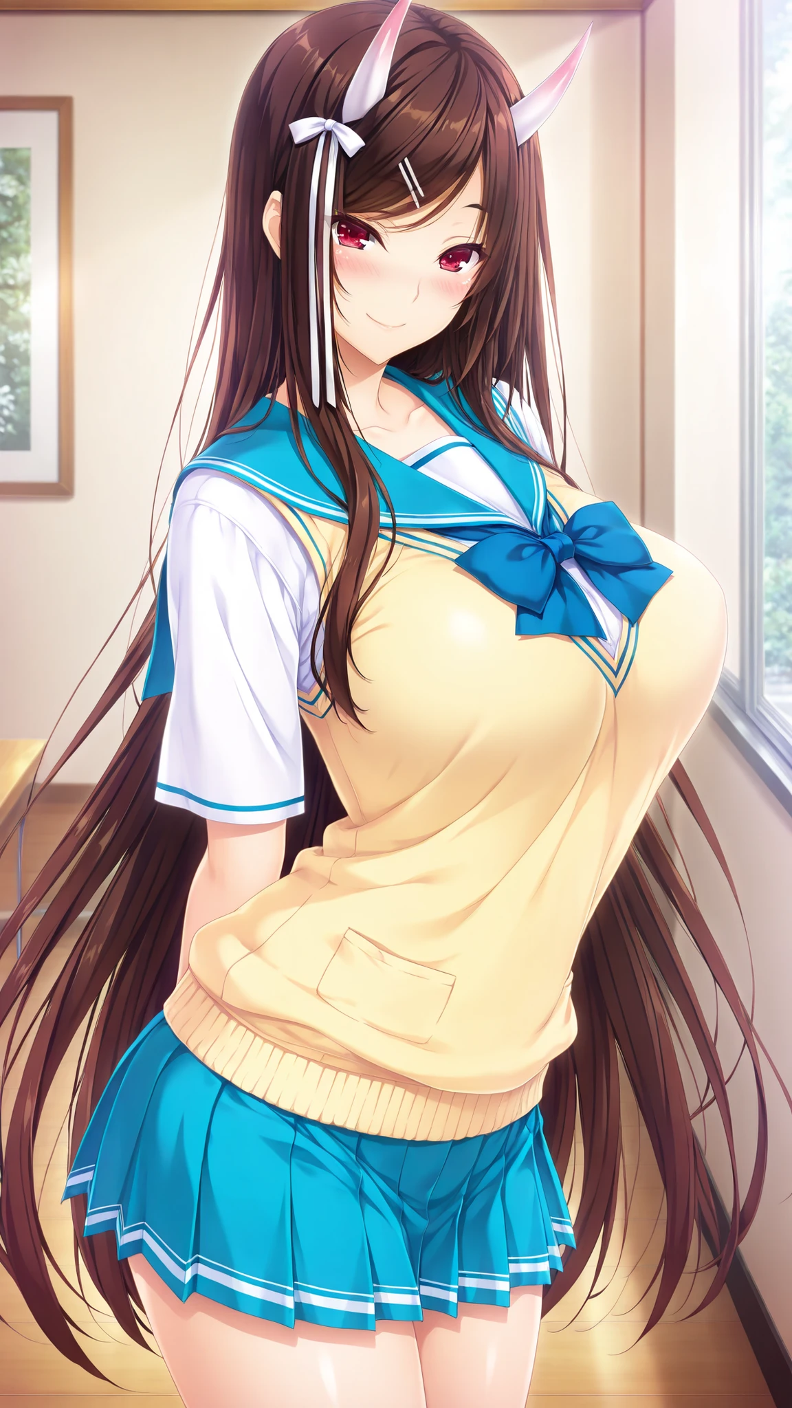 2. Kijou Suzuka, brown hair, long hair, red eyes, horn