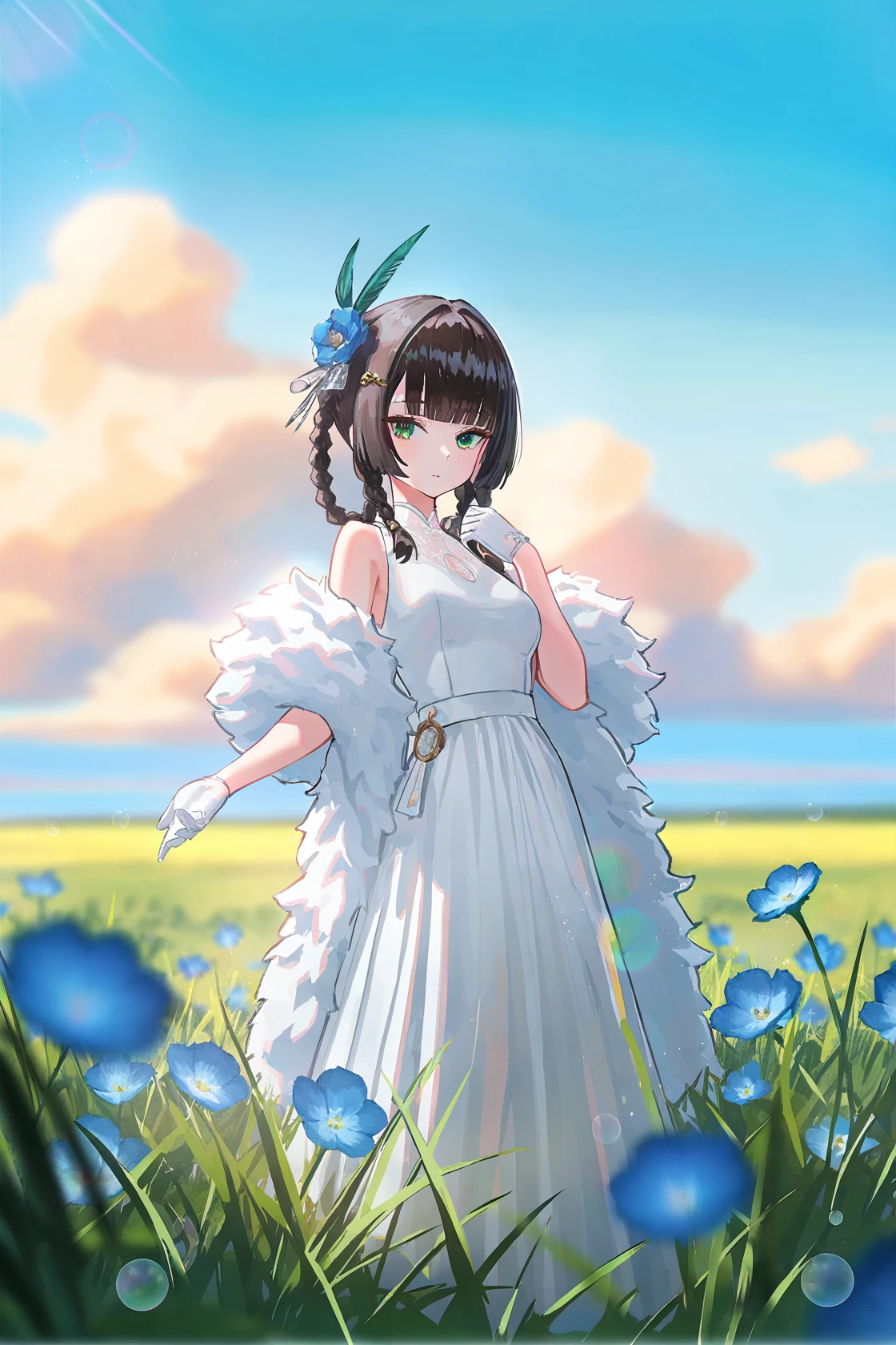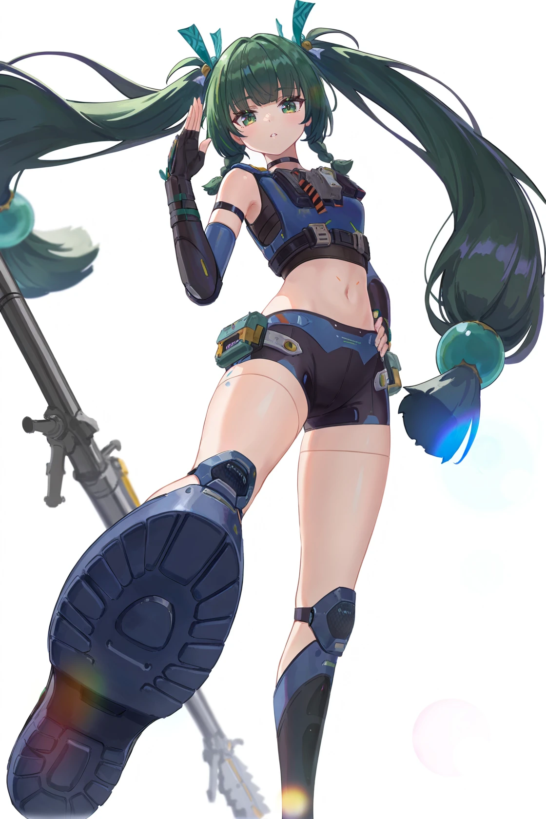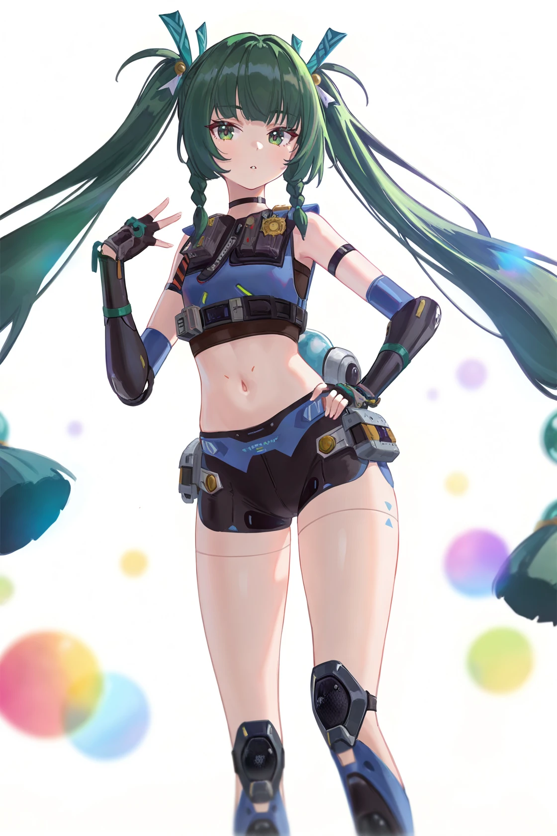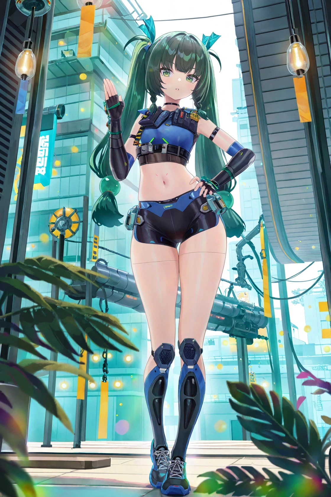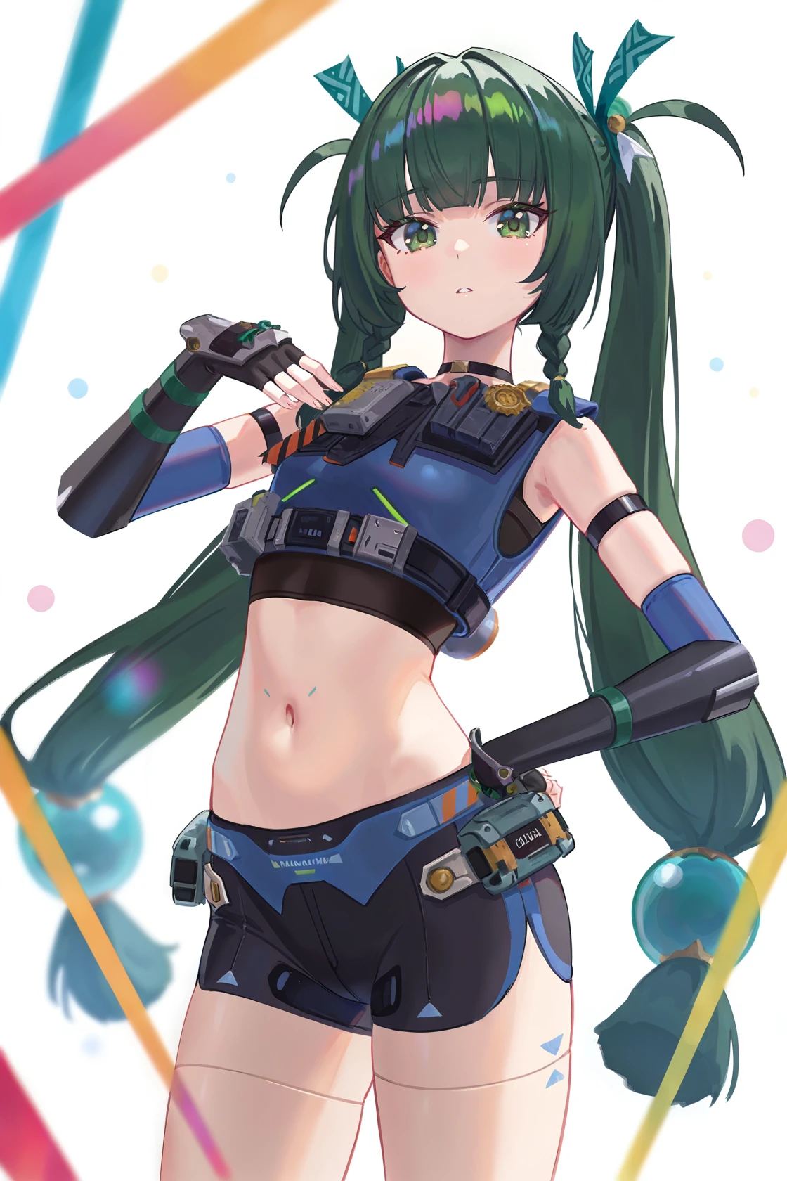 qinyi, default clothes, 1girl, long hair, green hair, green eyes, fingerless gloves, robot joints, shorts, navel, twintails,
