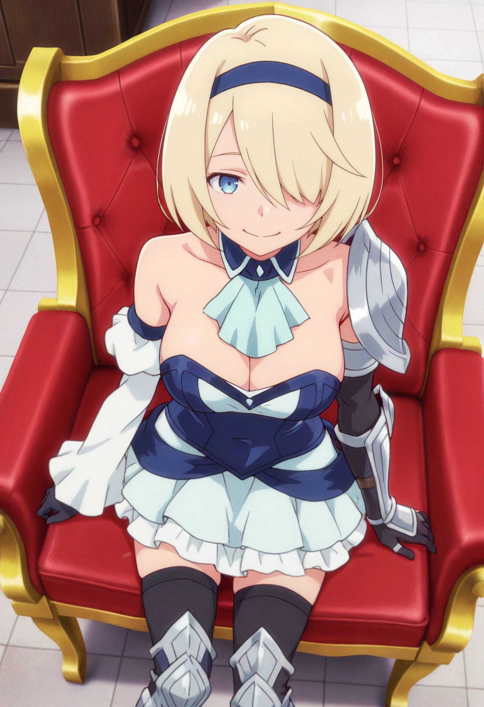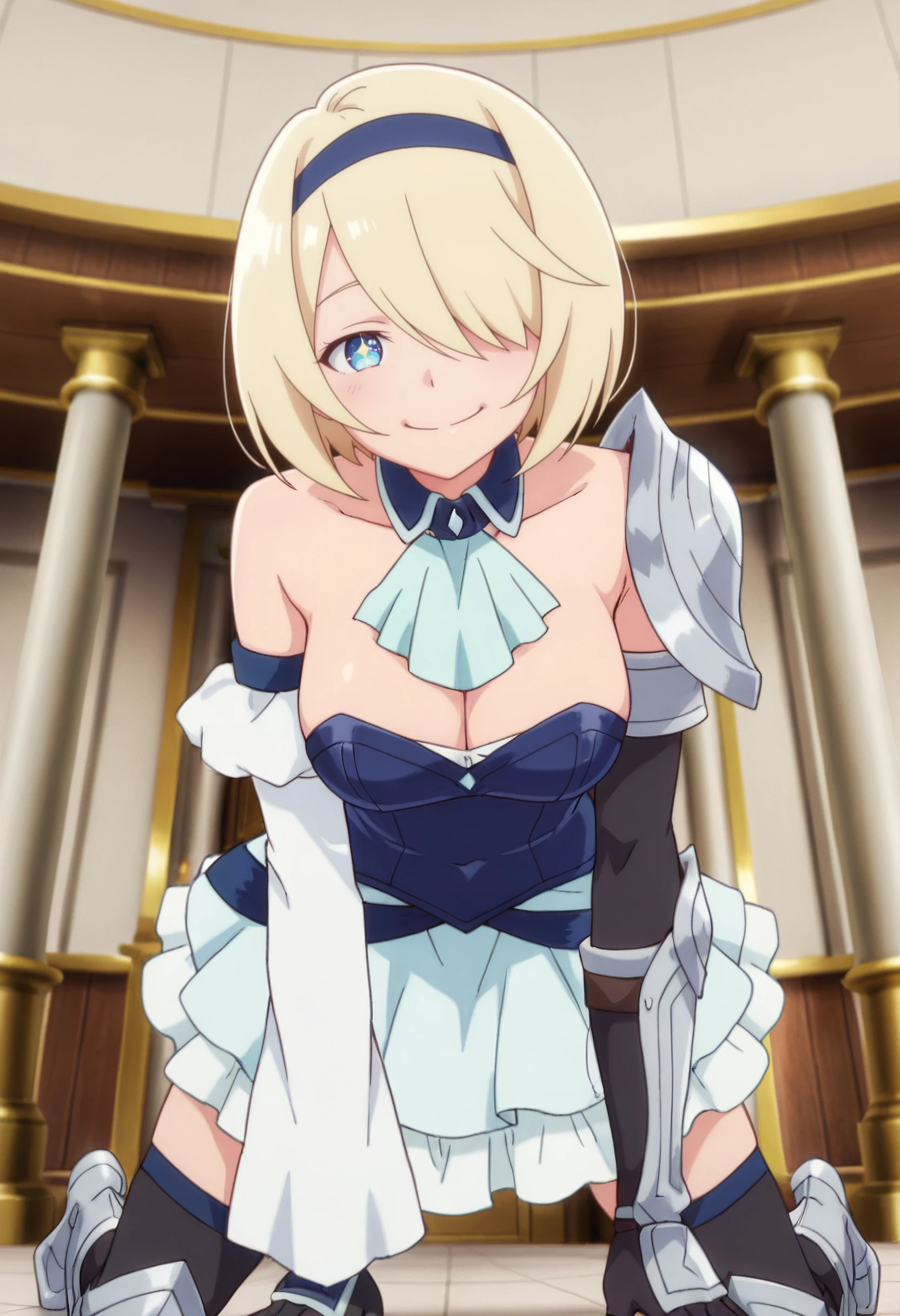 SheraOutfit, hairband, blue hairband, armor, shoulder armor, pauldrons, ascot, detached sleeves, gloves, single pauldron, bob cut, white sleeves, dress, blue ascot, gauntlets, blue collar, black gloves, single gauntlet, greaves, thighhighs, single bare shoulder, cleavage, boots, skirt, blue dress, black thighhighs,