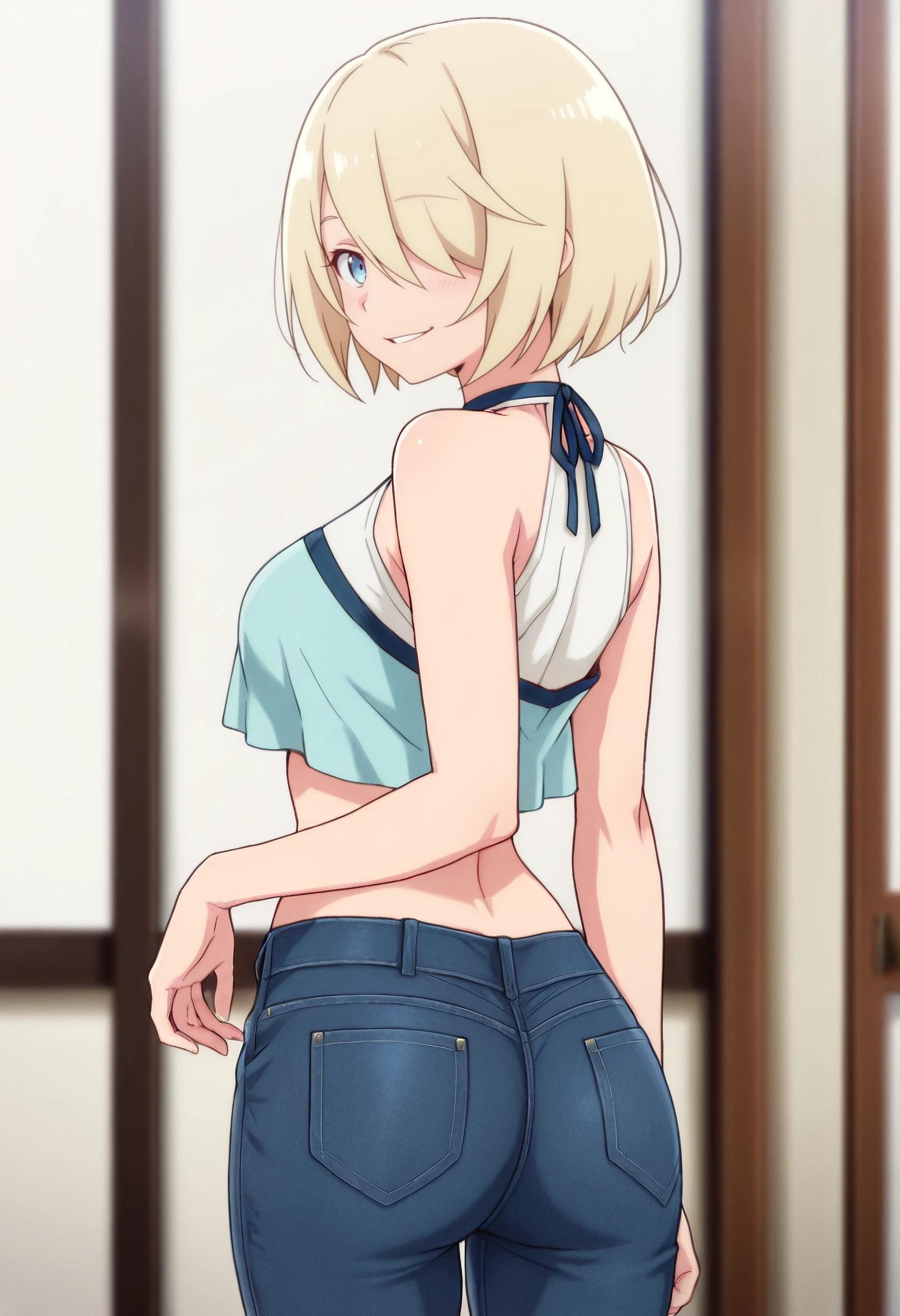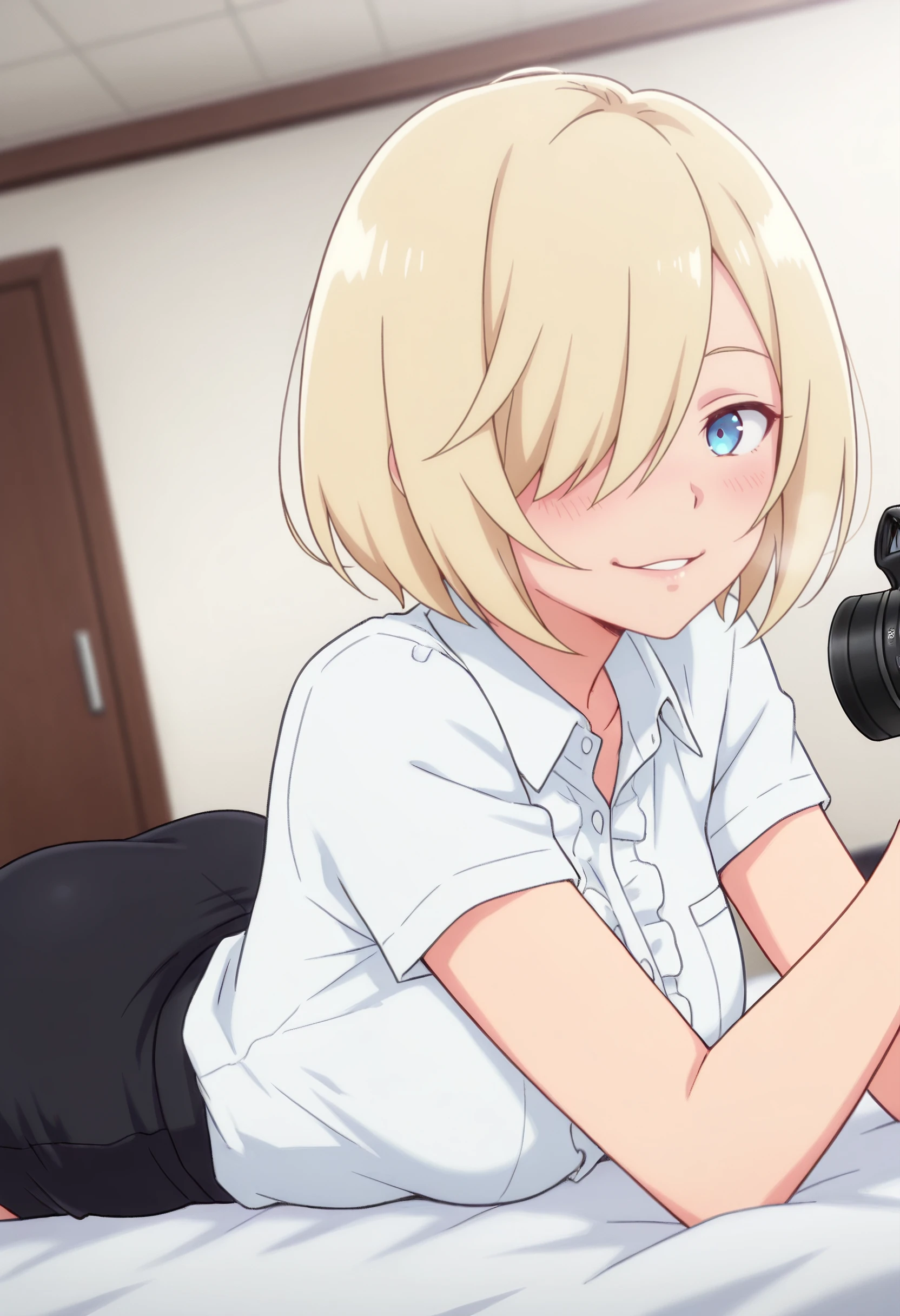 KMaShera, short hair, blonde hair, hair over one eye, blue eyes,