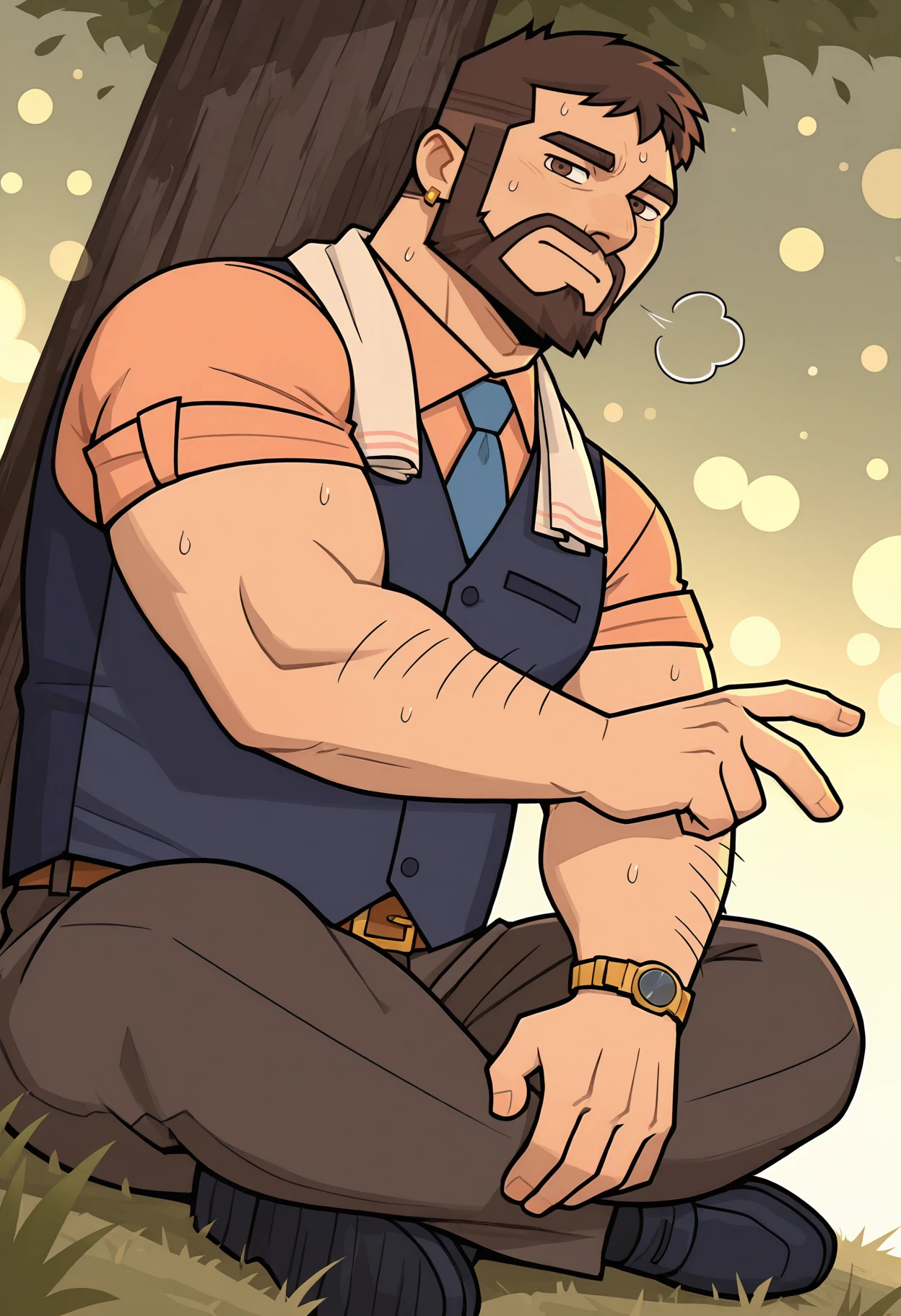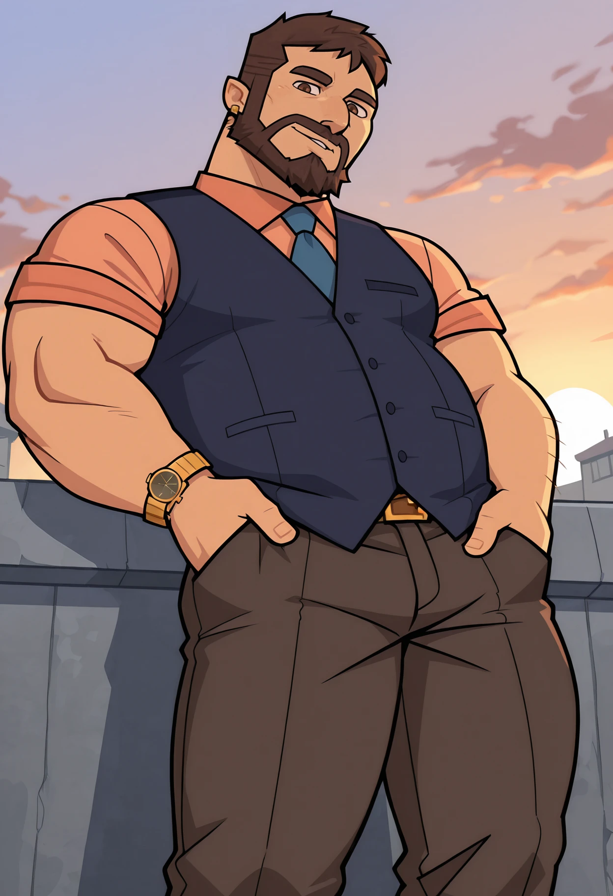 peach colored shirt, dark blue vest, blue tie, dark brown pants, gold belt buckle, gold watch,