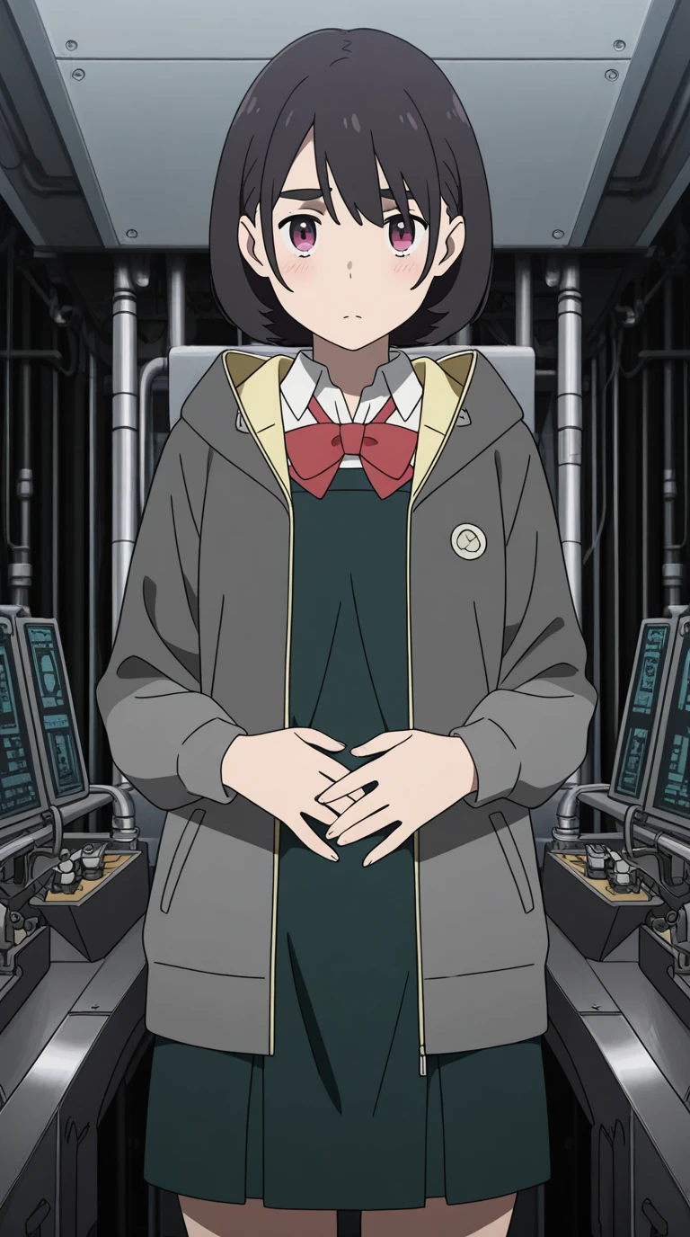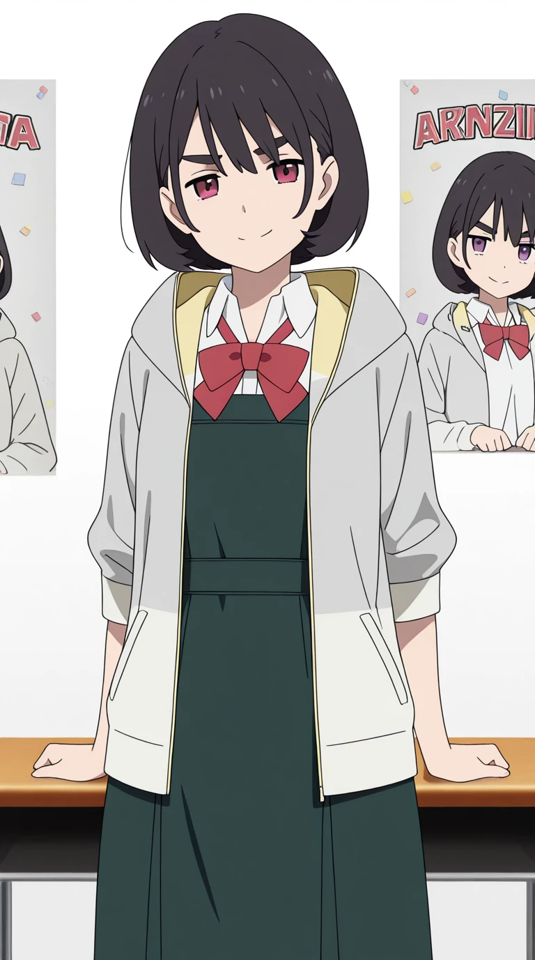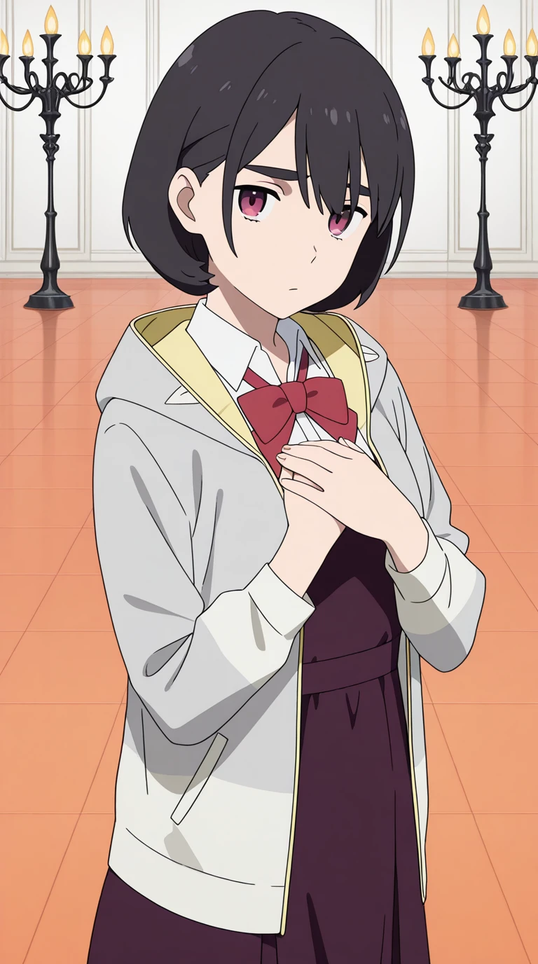 shirt, dress, bow, jacket, white shirt, collared shirt, hood, bowtie, red bow, red bowtie,