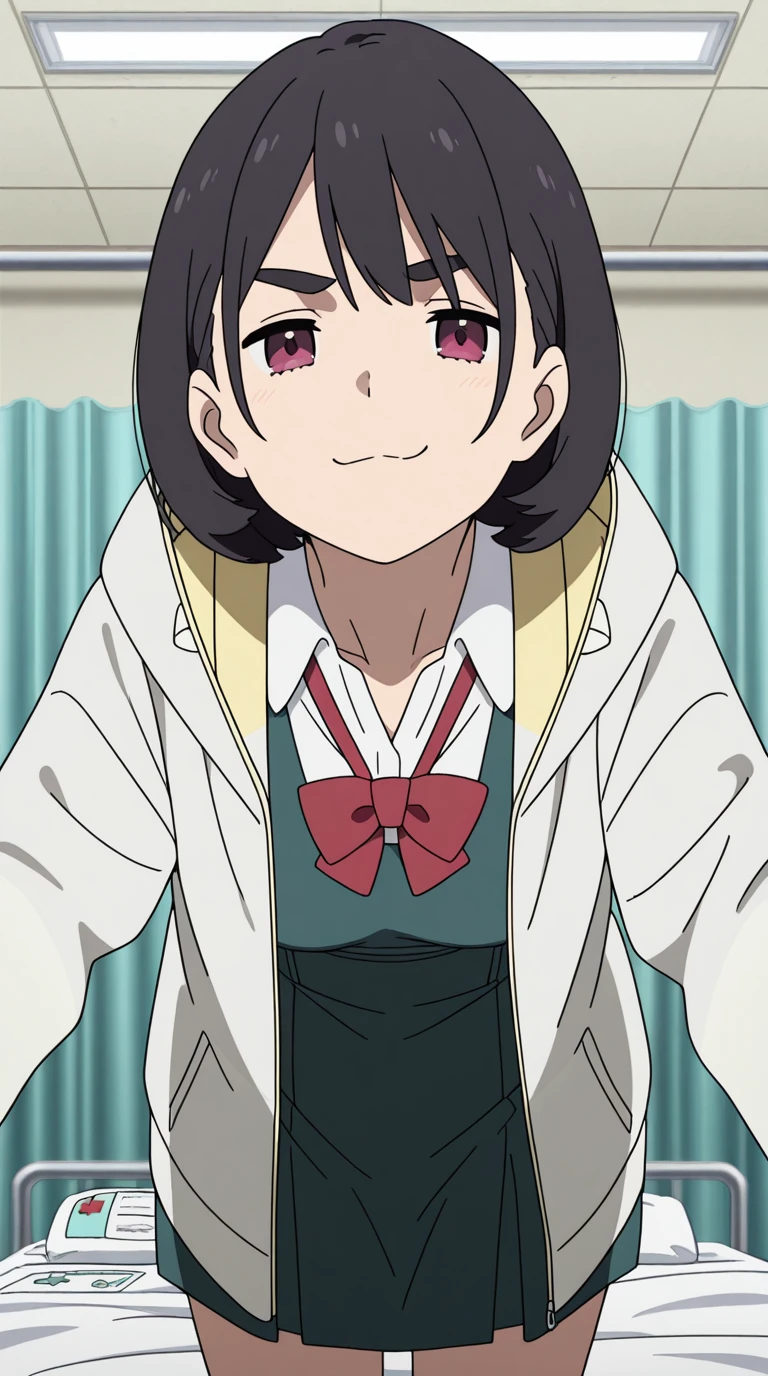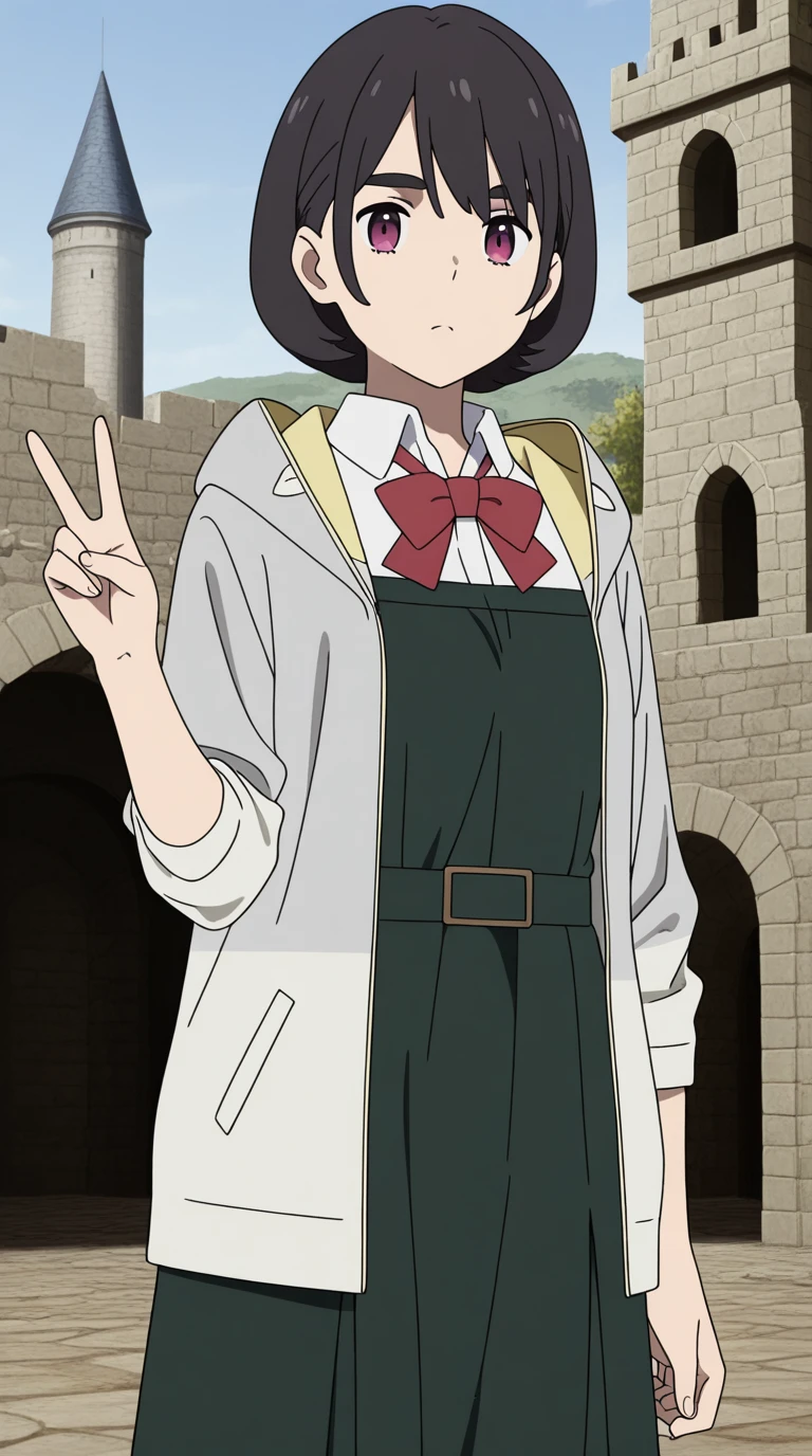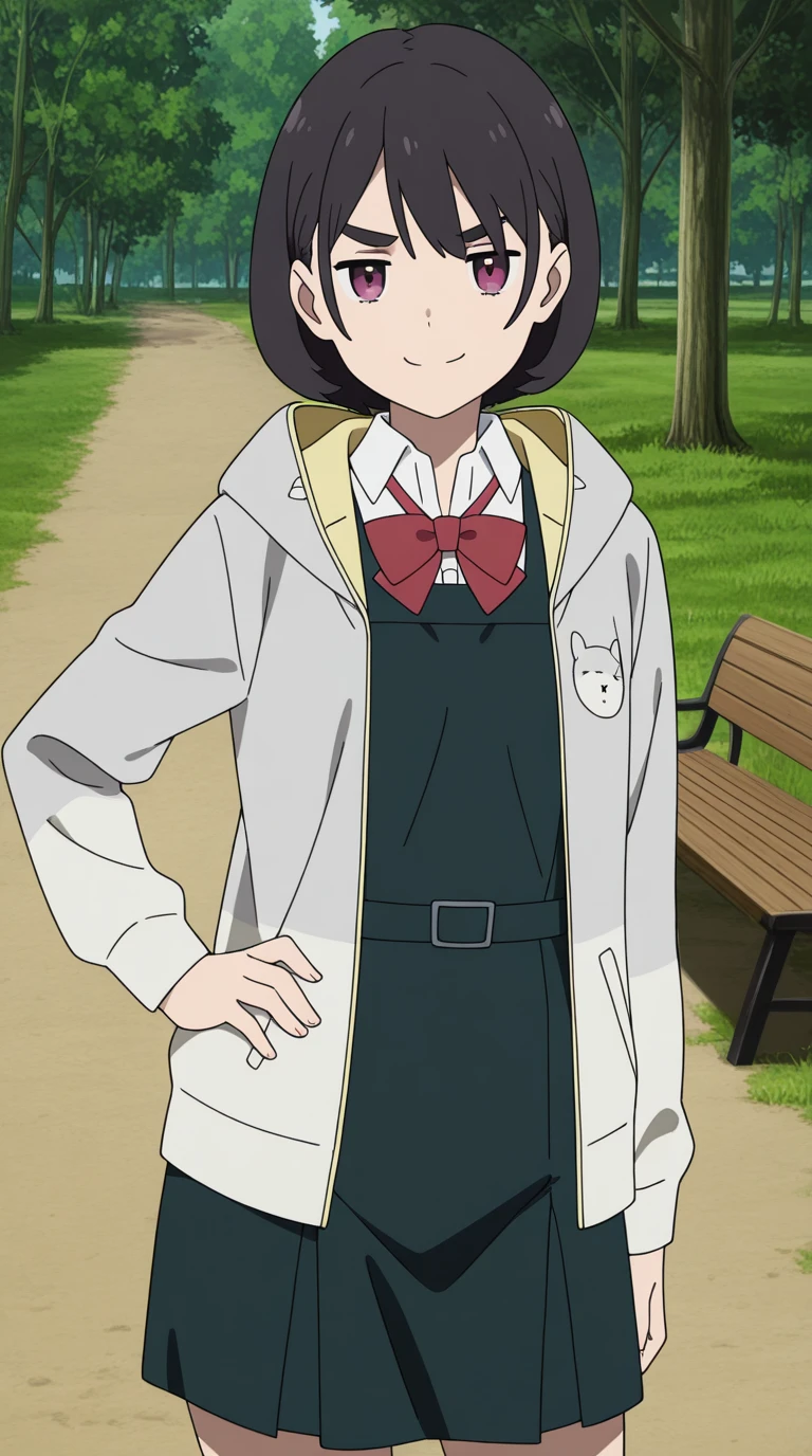 shirt, dress, bow, jacket, white shirt, collared shirt, hood, bowtie, red bow, red bowtie,
