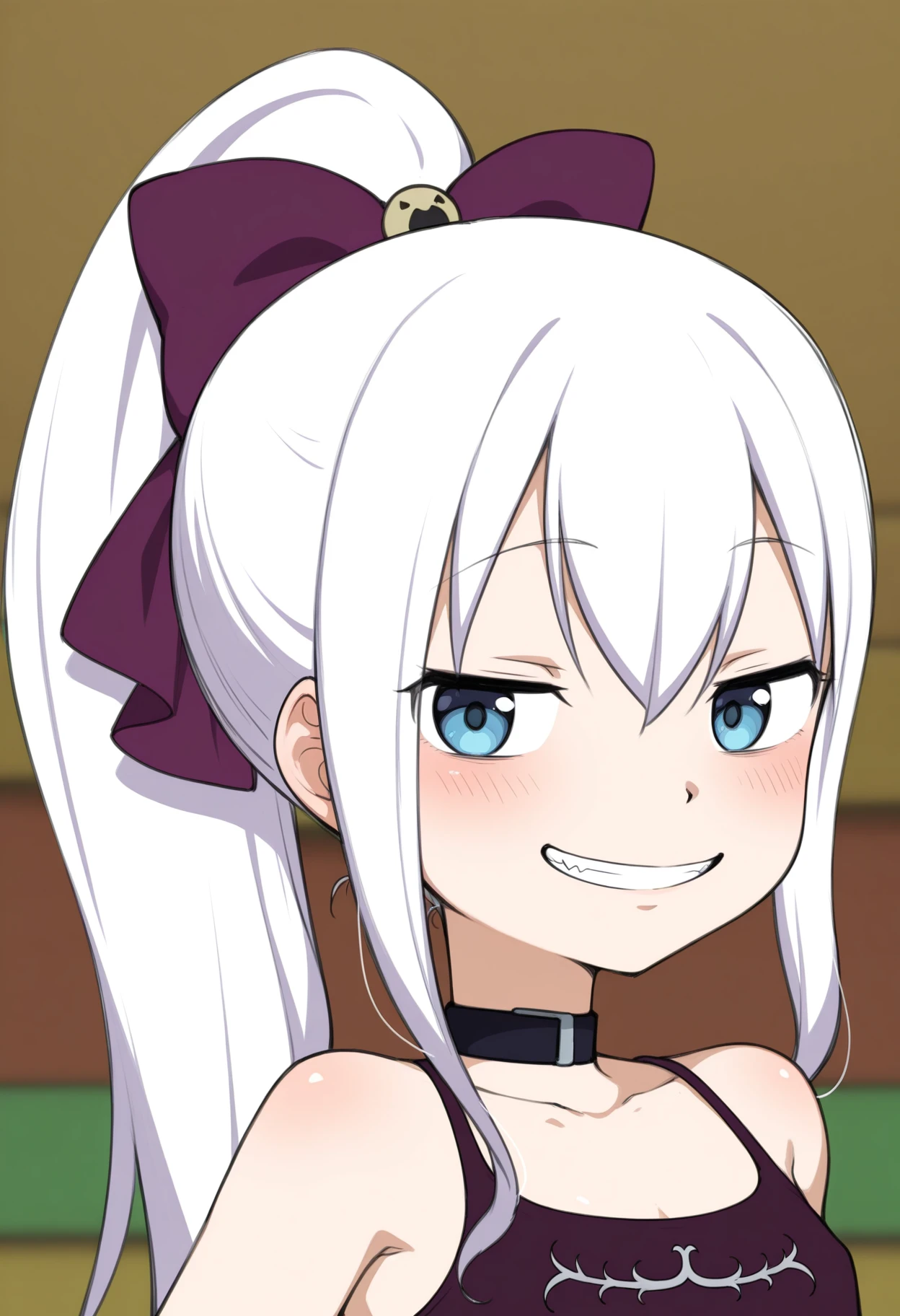 mira_mayo, blue eyes, white hair, ponytail, hair bow, choker, crop top, micro shorts, thighhighs, high heels