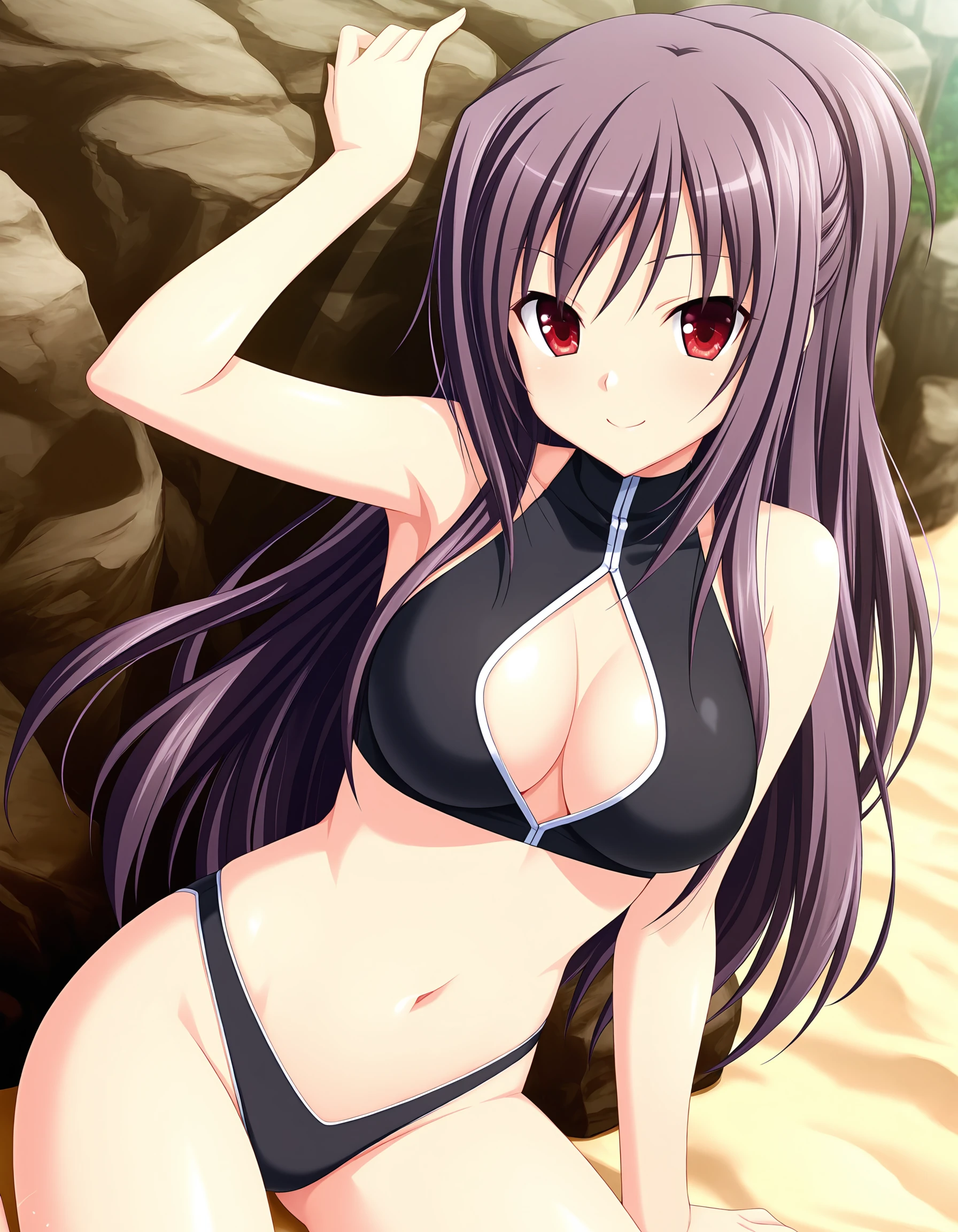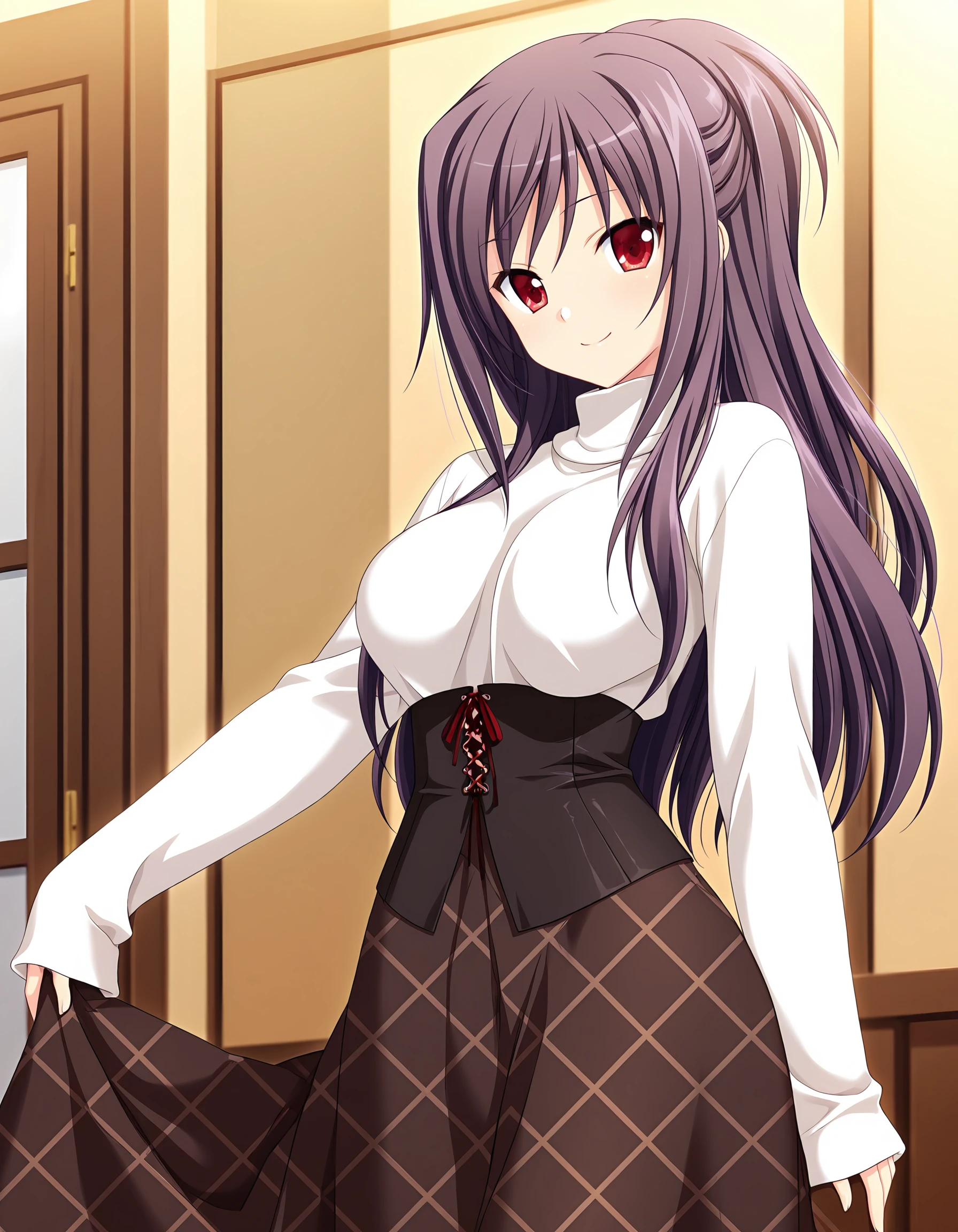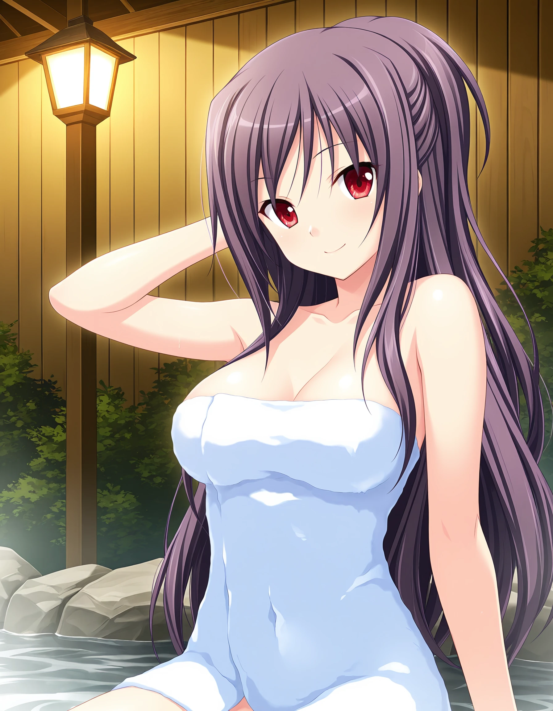miyabi, purple hair, long hair, half updo, red eyes, large breasts,