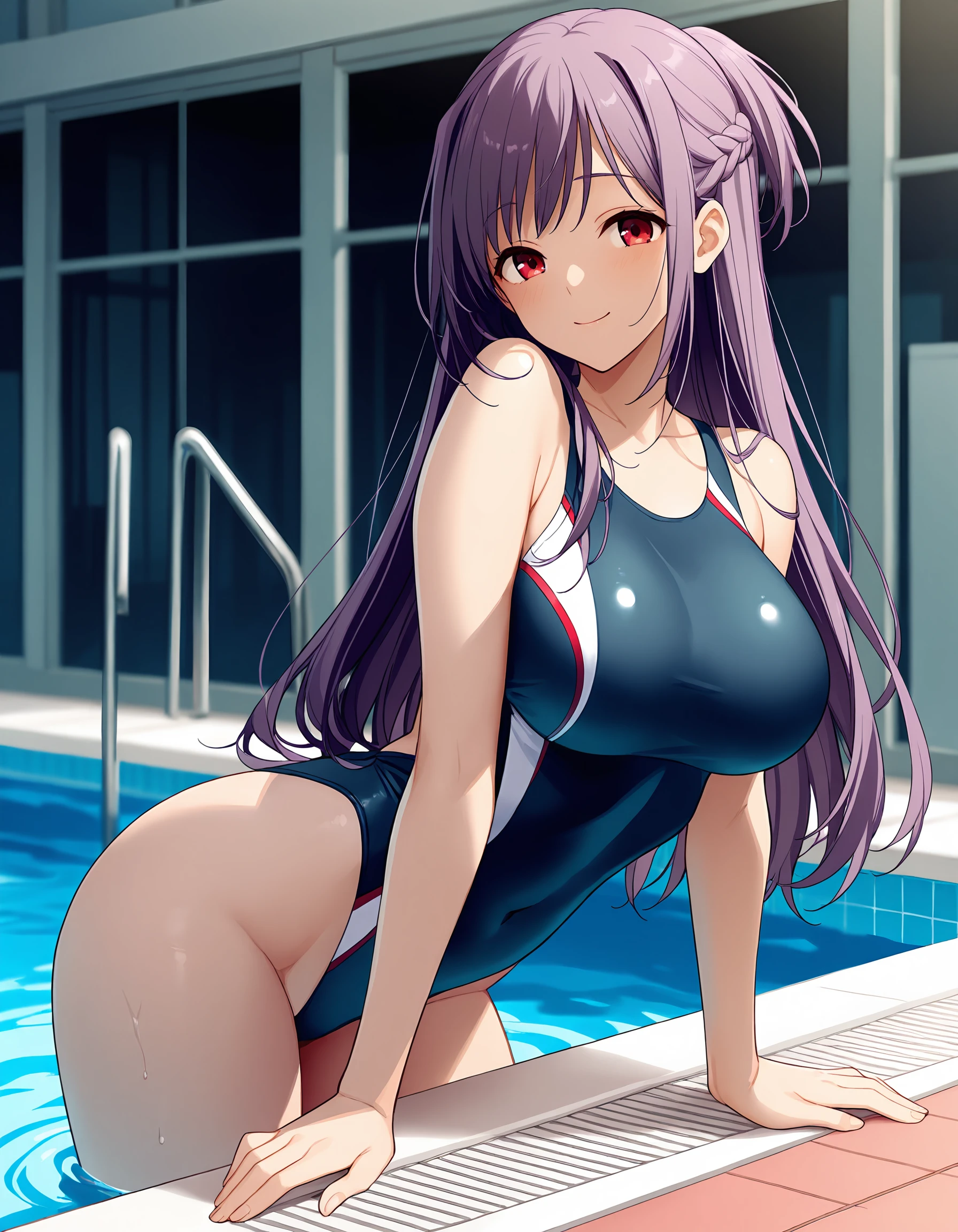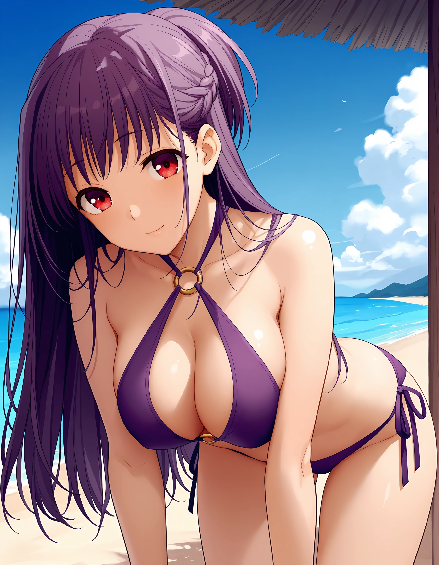 takasu-miyabi, mature female, purple hair, long hair, half updo, hair braid, red eyes, large breasts,