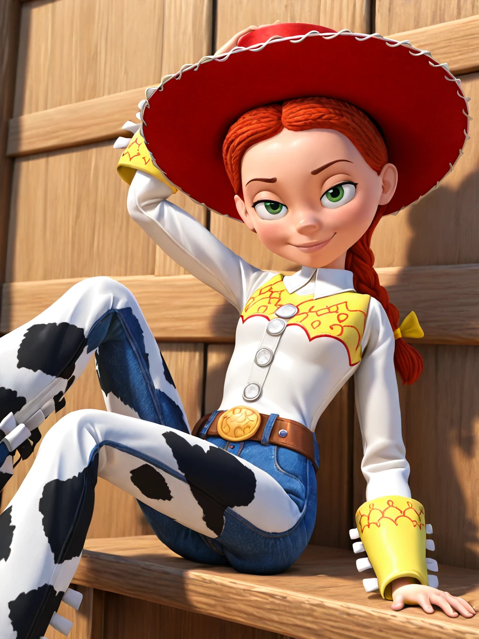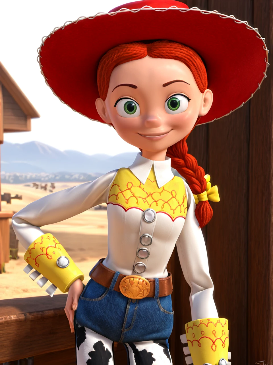 Trigger Words: J3s13, 1girl, 3d, solo, long hair, green eyes, braid, red hair, belt, pants, cowboy hat,