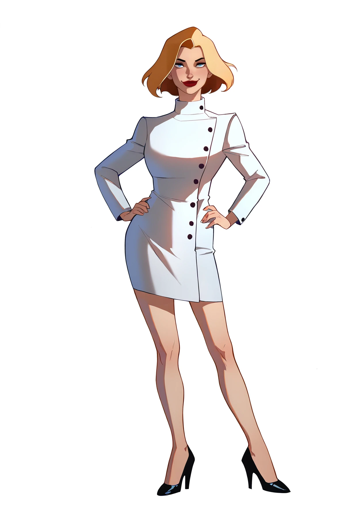 white coat, white skirt, high heels