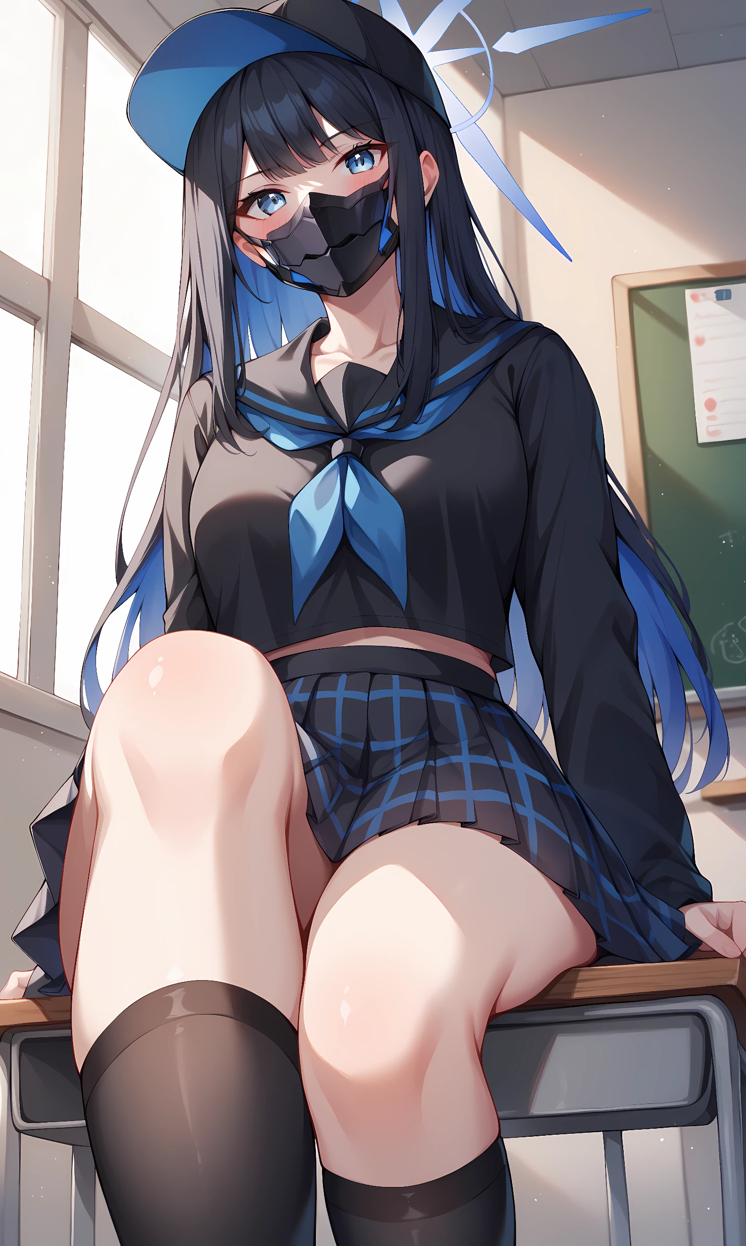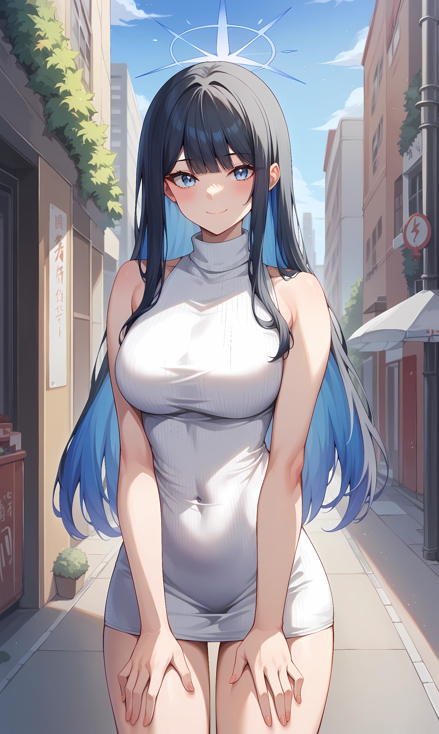 saori, blue eyes, black hair, colored-inner hair, long hair, halo