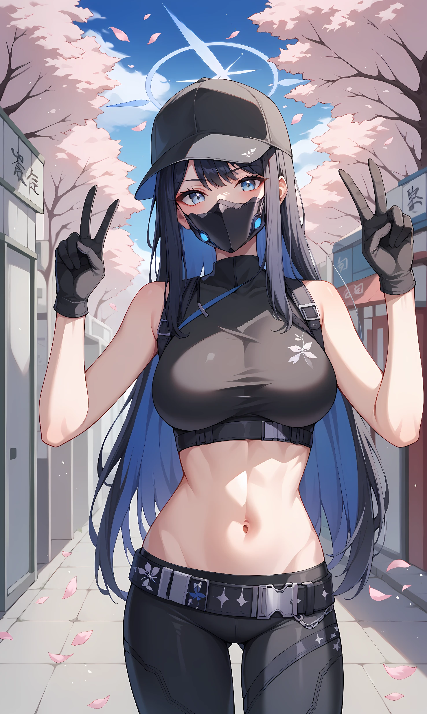 outfit: baseball cap, black cap, mask, mouth mask, black crop top, black pants, tight pants, navel, belt, black boots, white coat, open clothes, long sleeves, armband
