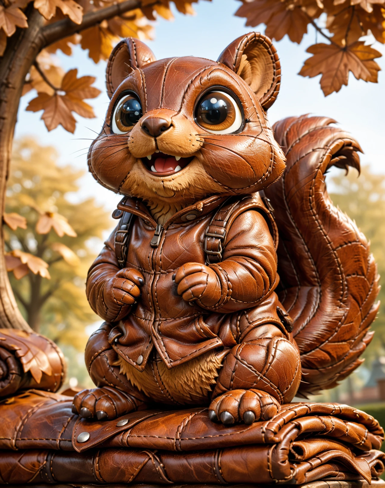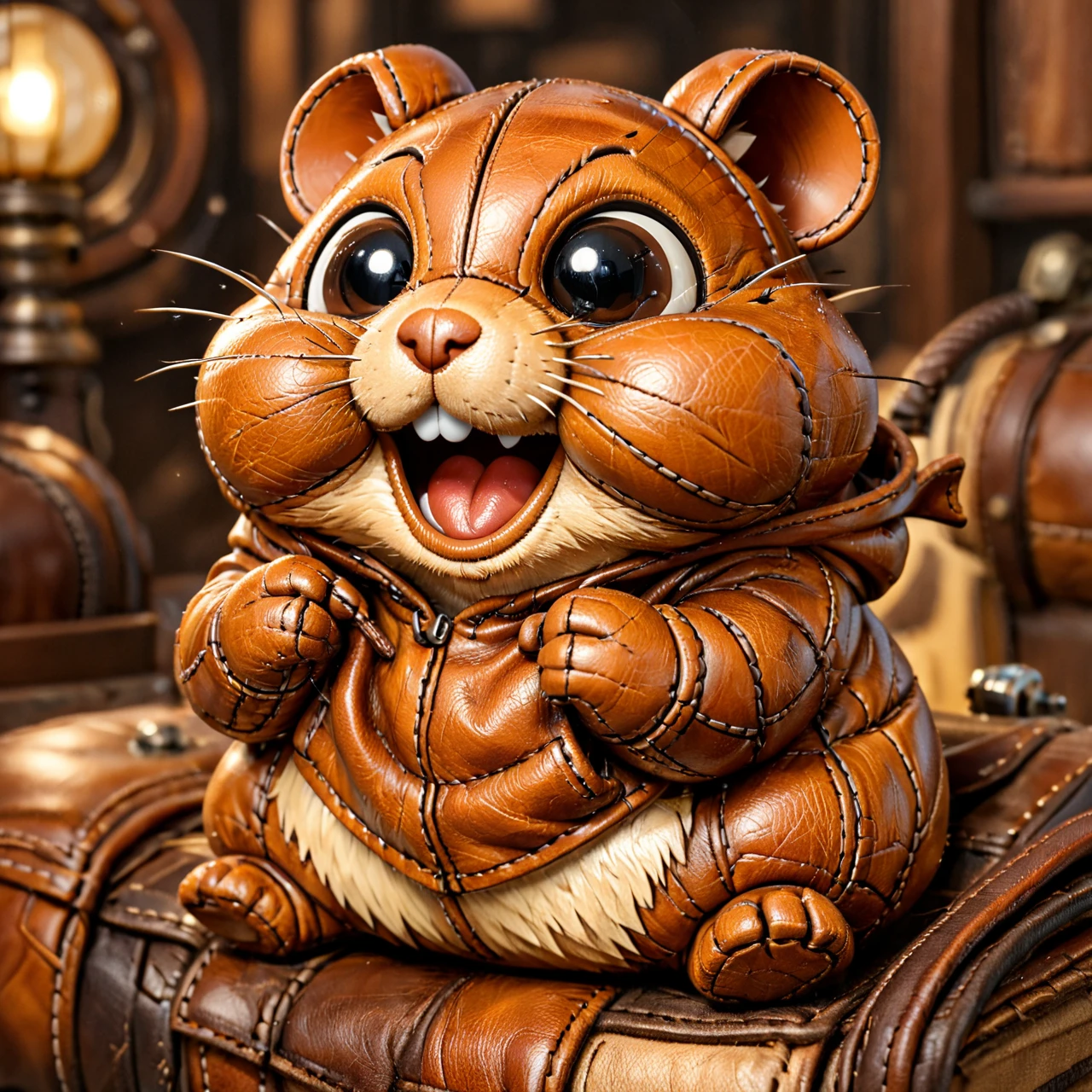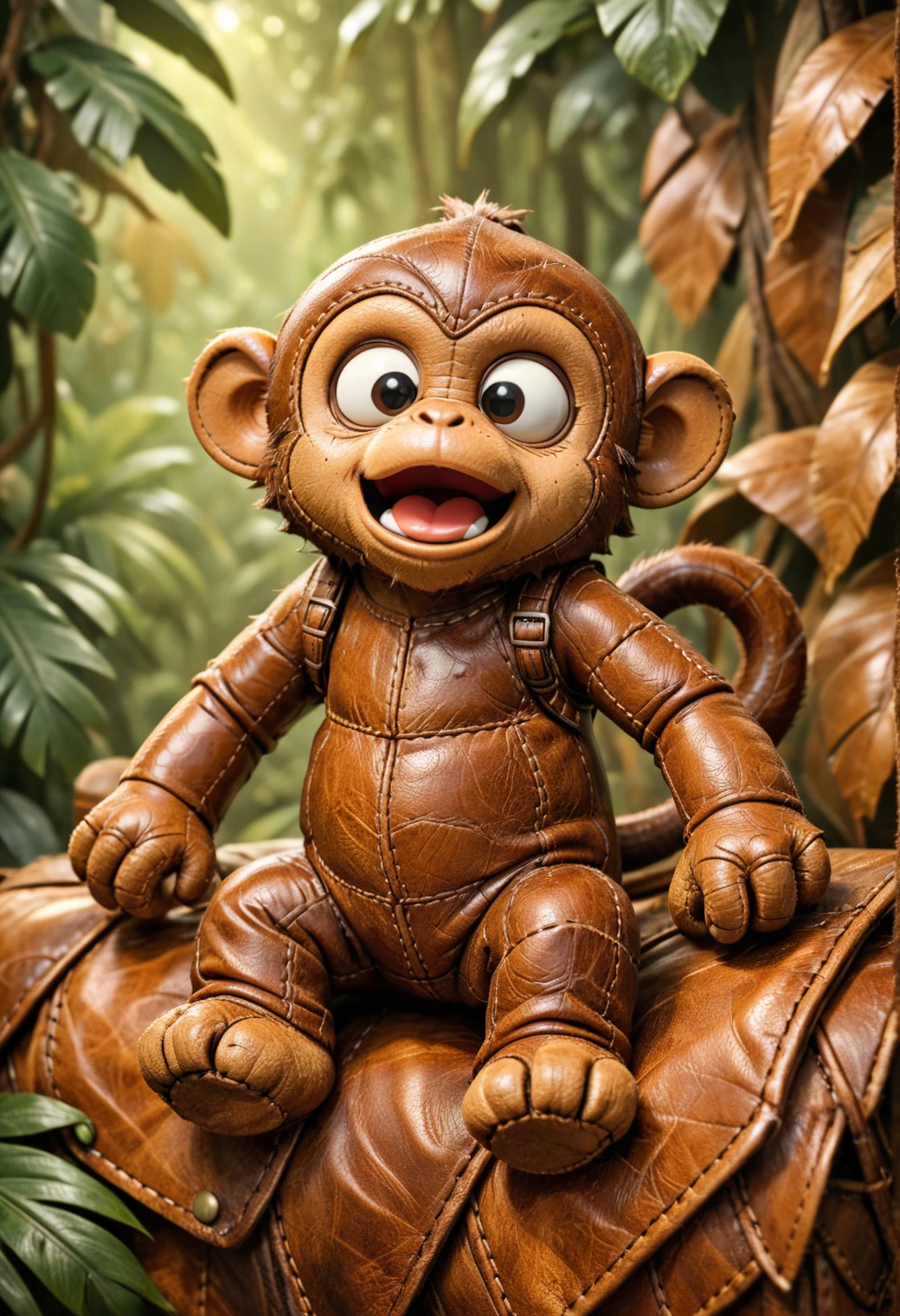 It turns subjects into soft, toy-like leather creations with stitched seams, padded forms, layered leather panels, and warm, cozy materials, combining high craftsmanship detail with expressive, adorable personalities.