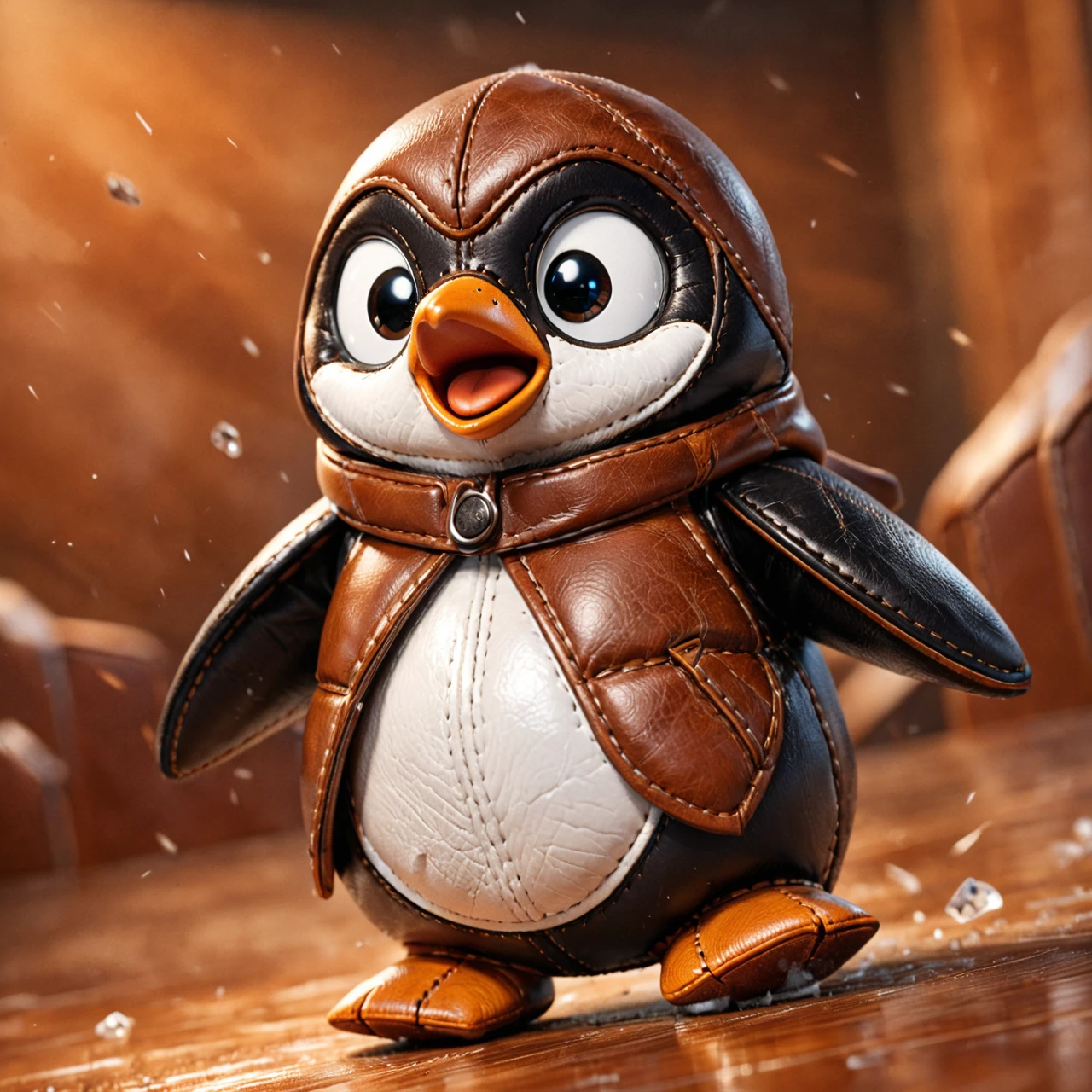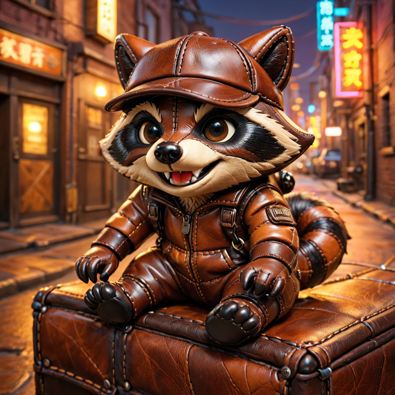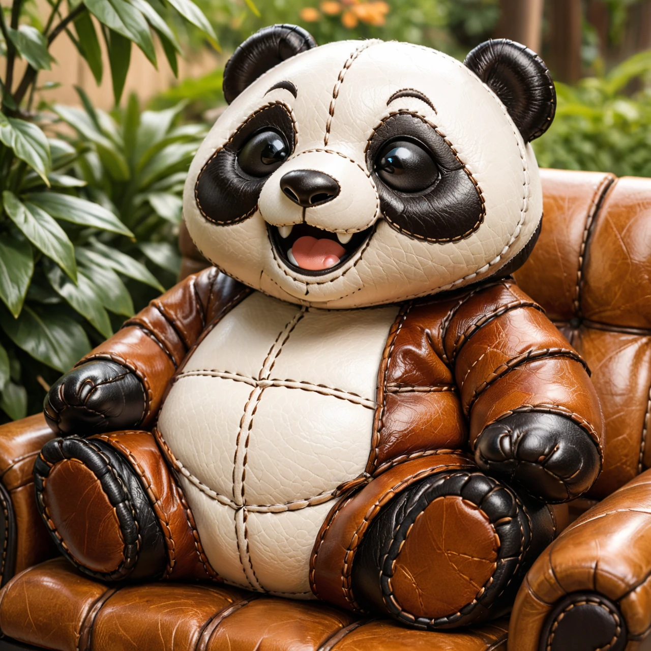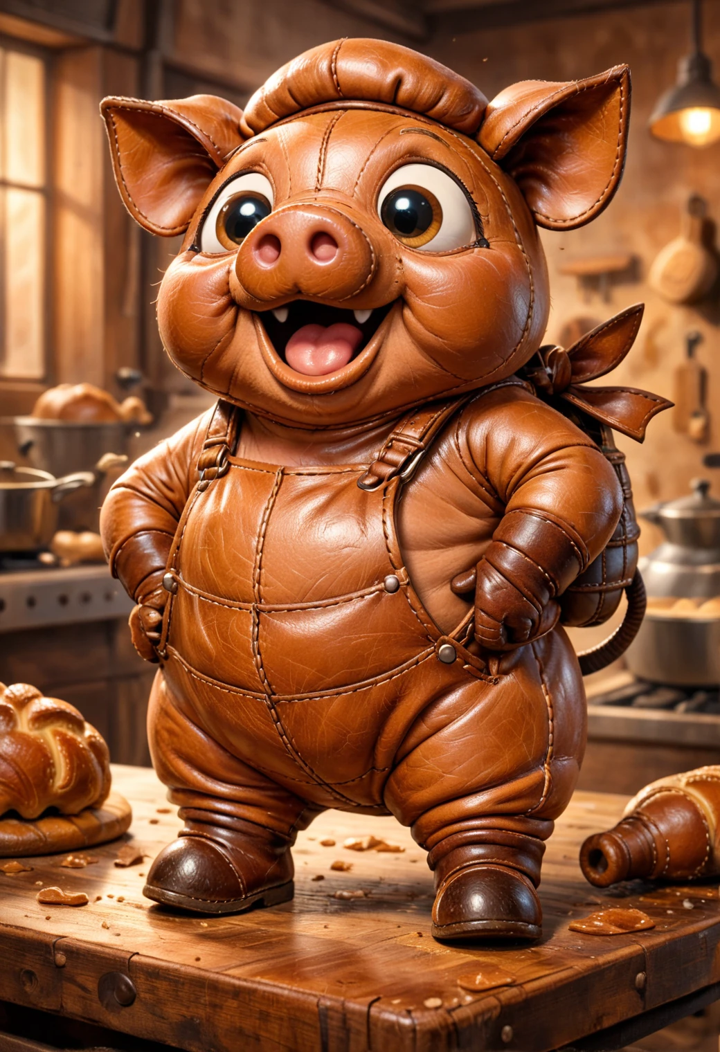It turns subjects into soft, toy-like leather creations with stitched seams, padded forms, layered leather panels, and warm, cozy materials, combining high craftsmanship detail with expressive, adorable personalities.