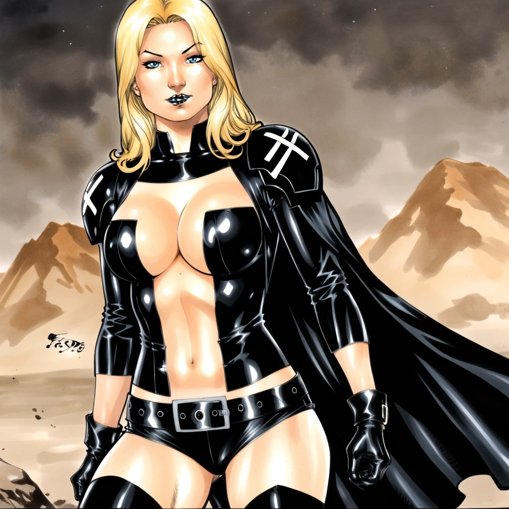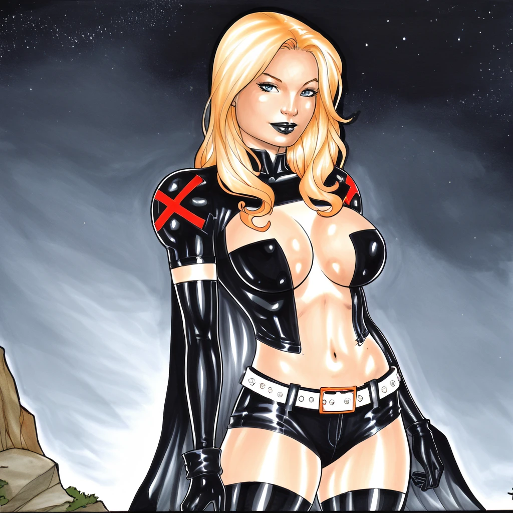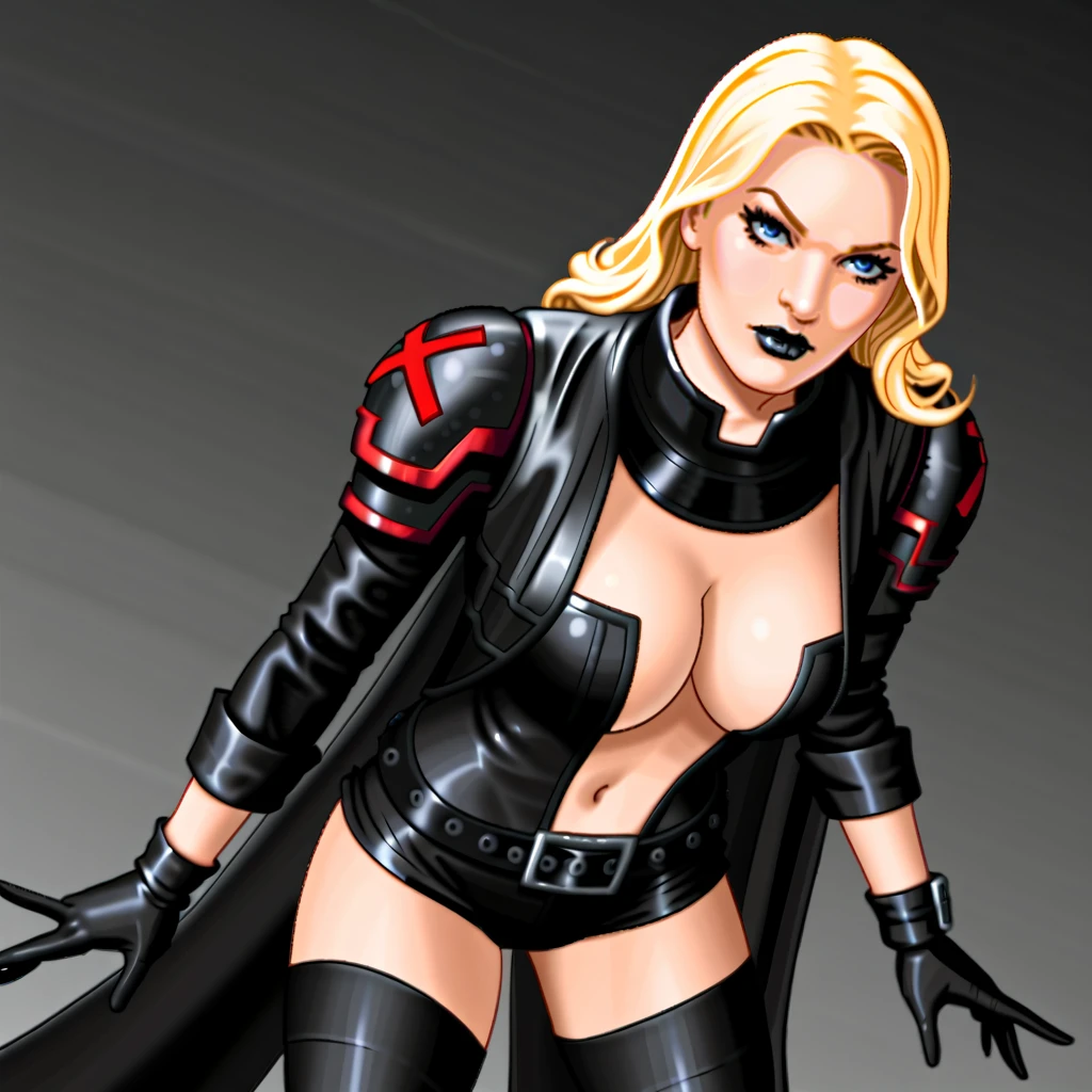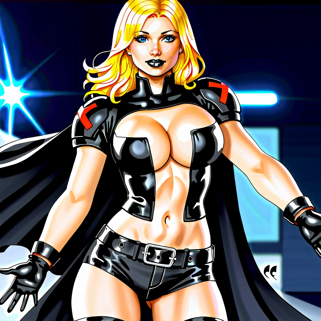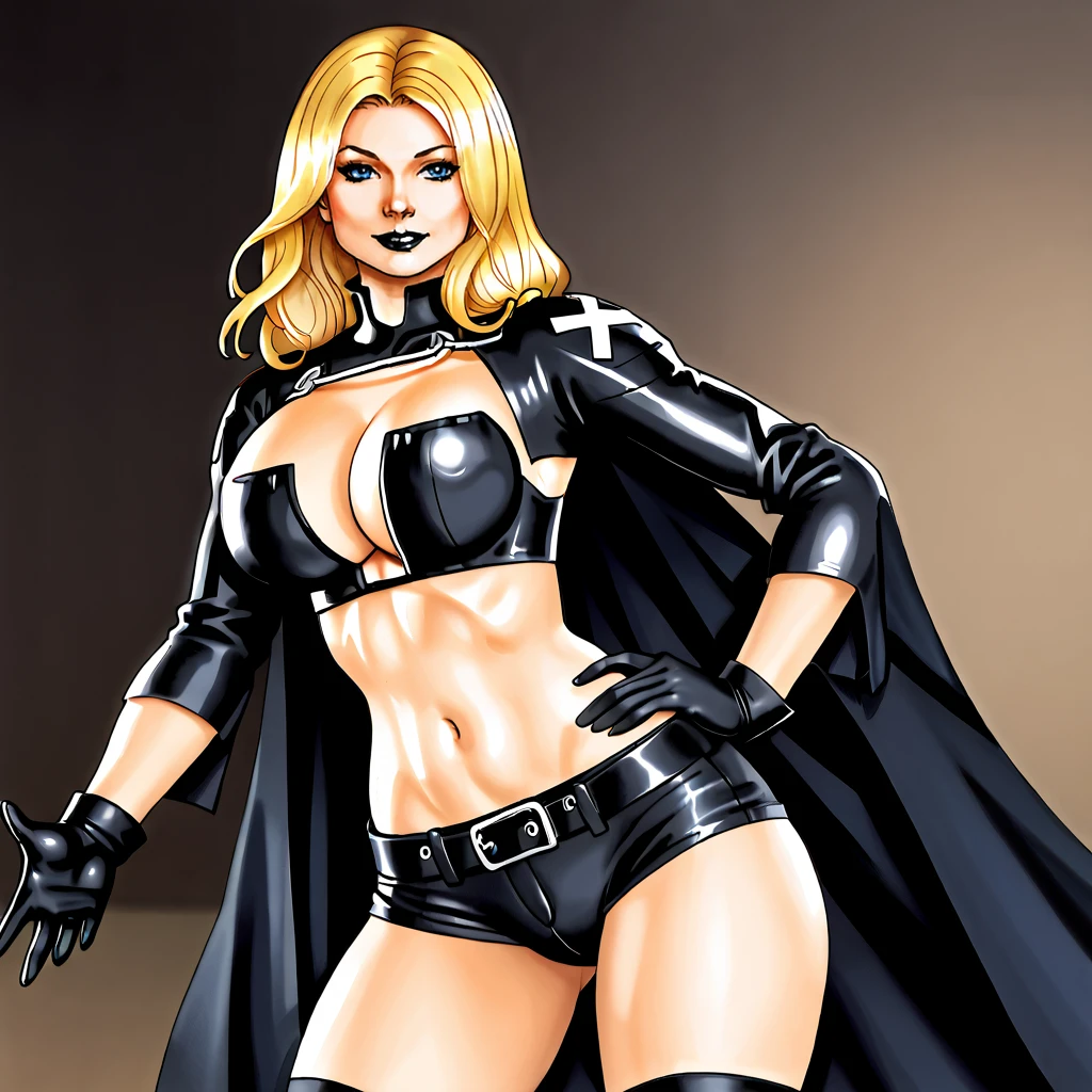 Trigger : EmmaFrostMarvelNow, 1girl, solo, large breasts, blonde hair, black thighhighs, blue eyes, black gloves, cleavage, navel, black lipstick, makeup, short shorts, belt, long hair, cape, center opening, black shorts, open clothes, lips