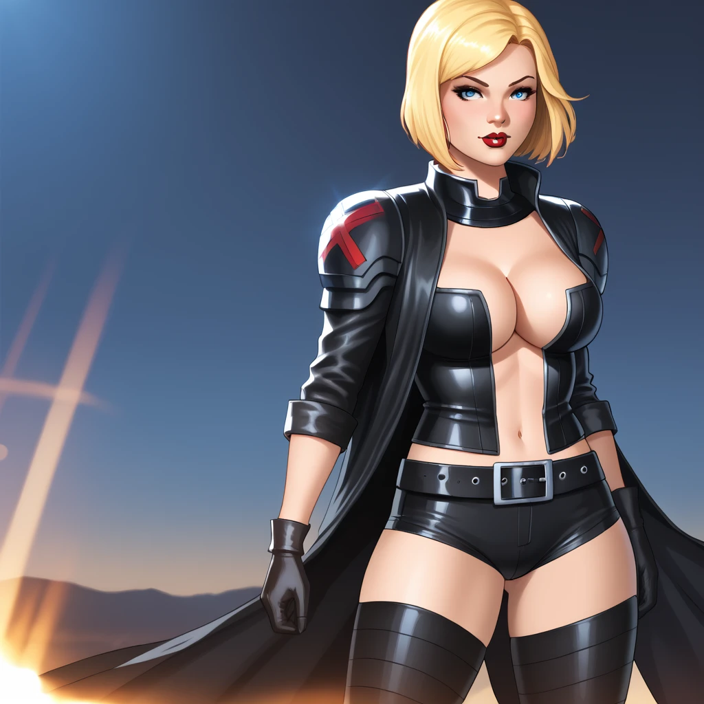 EmmaFrostMarvelNow, 1girl, solo, large breasts, blonde hair, black thighhighs, blue eyes, black gloves, cleavage, navel, black lipstick, makeup, short shorts, belt, long hair, cape, center opening, black shorts, open clothes, lips