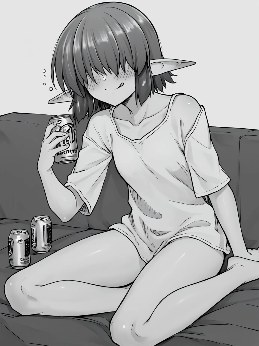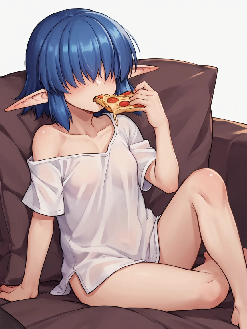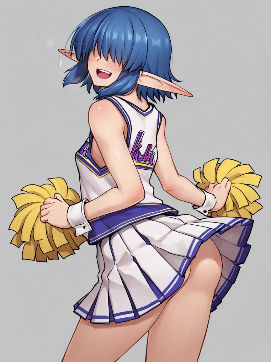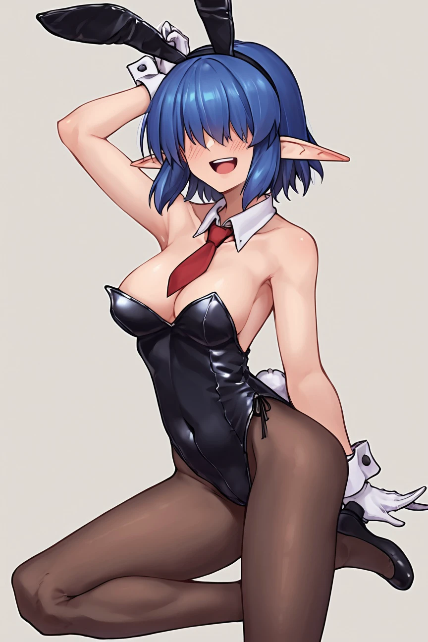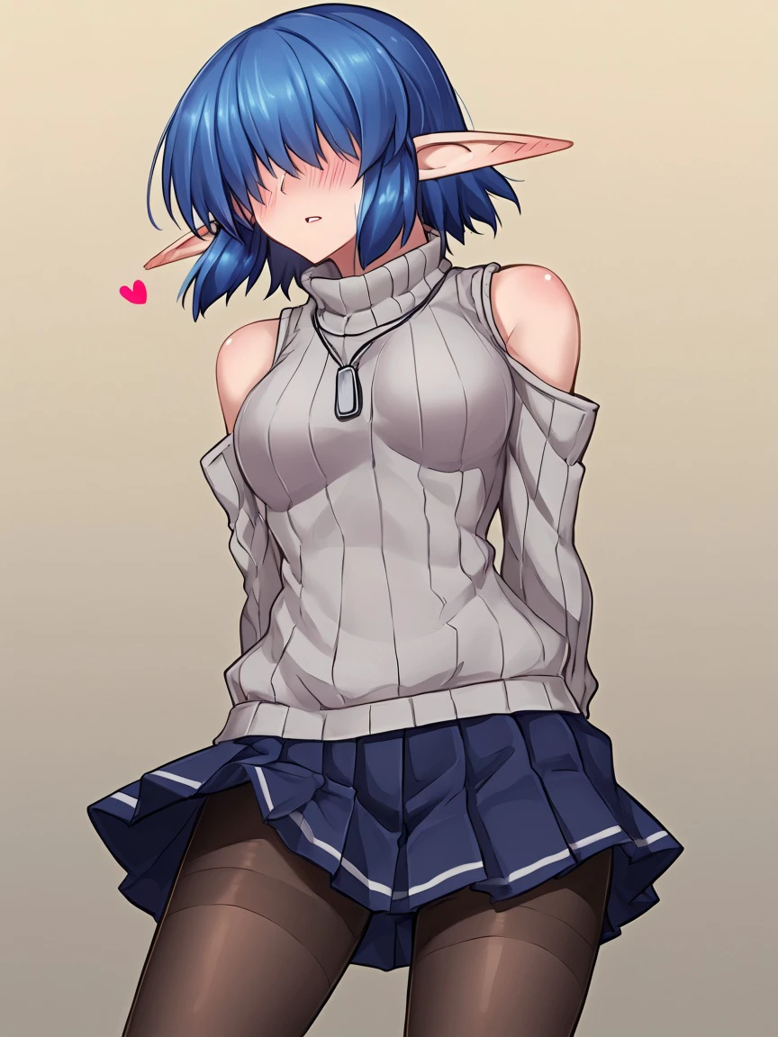 kinoe-san (kawajuu), short hair, skirt, shoulder cutout, pantyhose, sidelocks, pleated skirt, pointy ears, elf, sweater, clothing cutout, turtleneck, ribbed sweater, turtleneck sweater, hair over eyes