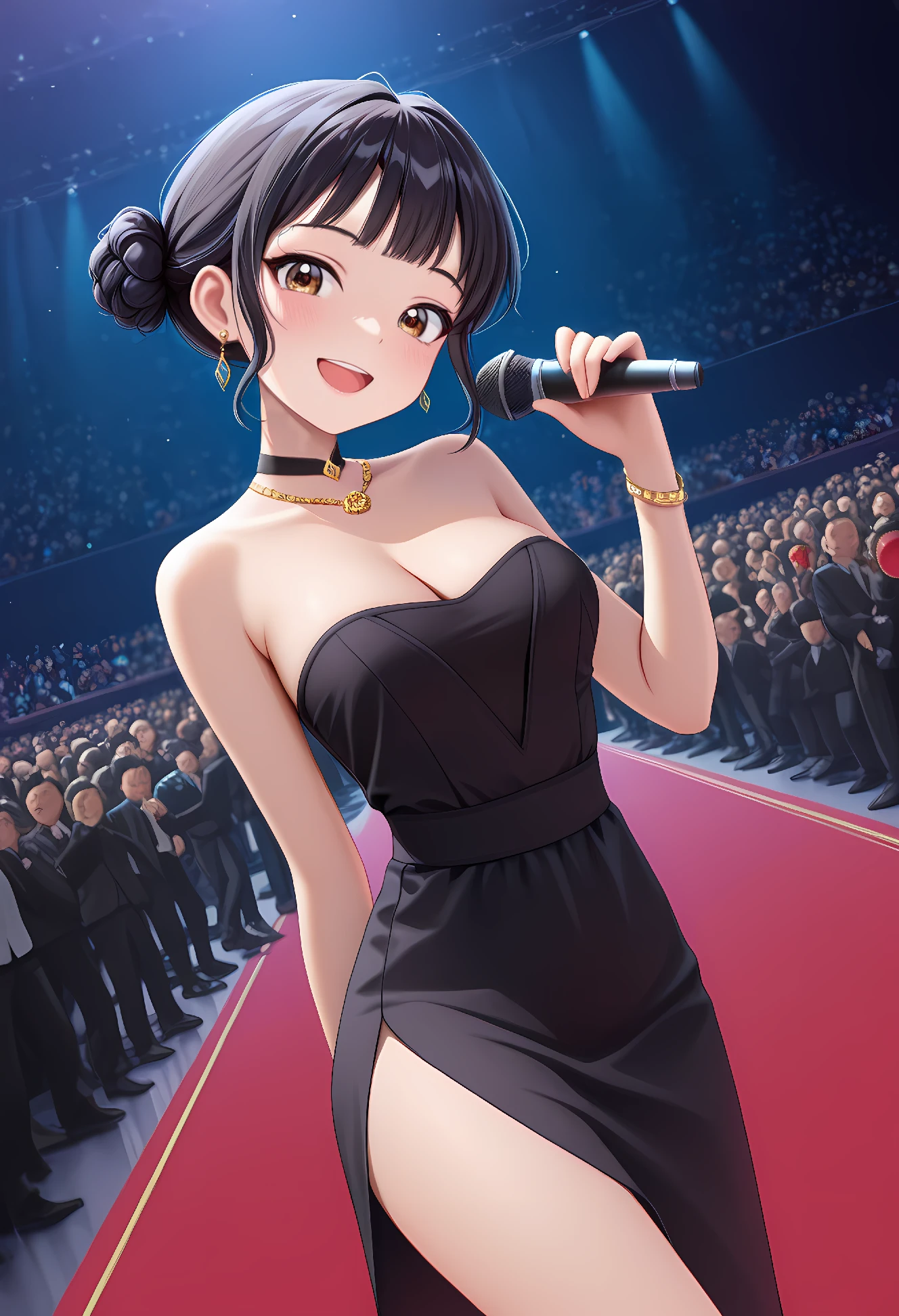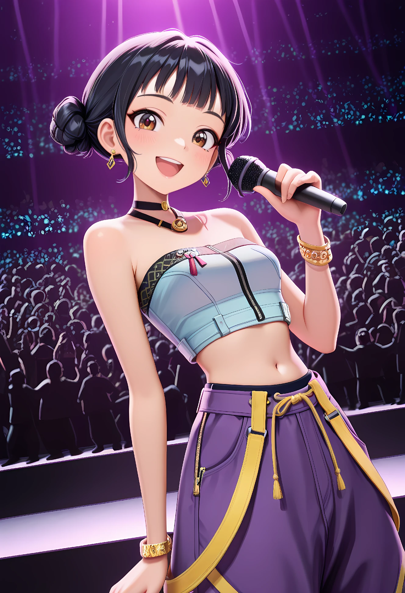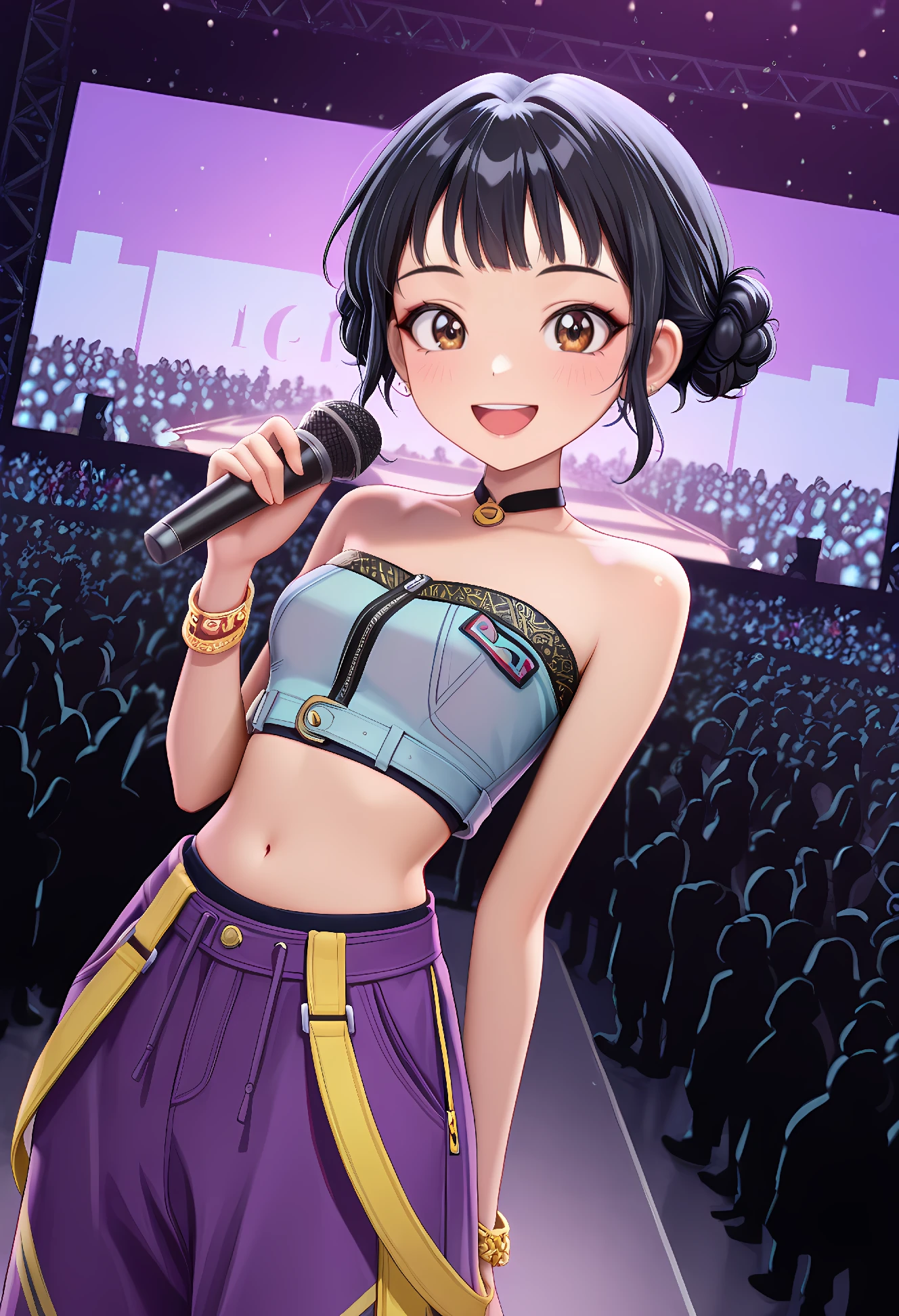 zoekpop, short hair, black hair, hair bun, double bun, bangs, brown eyes, short, 1girl, solo, ???? shoulders, jewelry, bracelet, midriff, (light blue crop top), choker, multicolored baggy pants in purple and yellow, baggy pants, sneakers, navel, holding microphone,