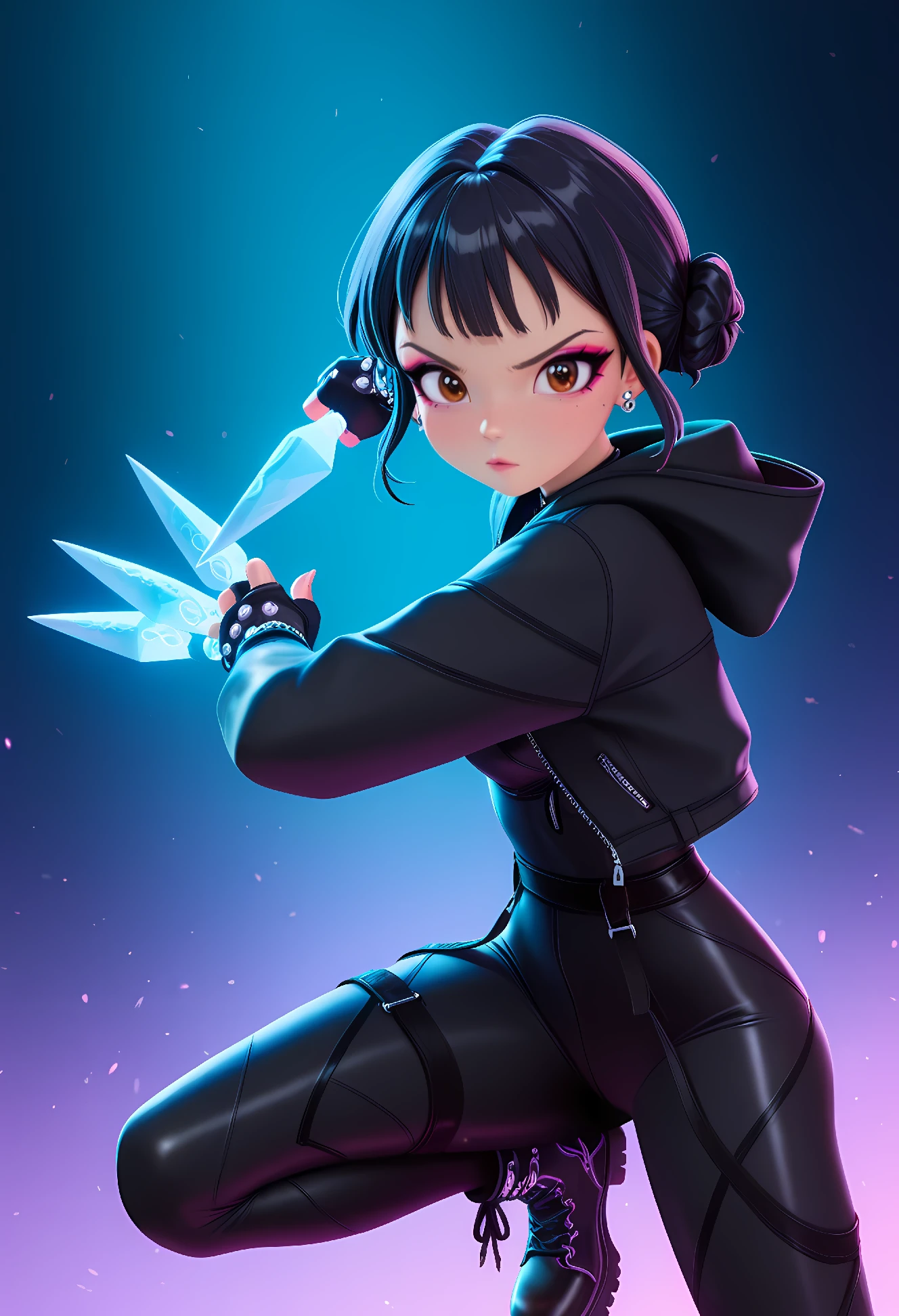 black ????????, black jacket, hood down, fingerless gloves, boots, earrings, jewelry, makeup, holding weapon, ((multiple kunai)), throwable weapon, dual wielding, blue glowing weapon, action pose