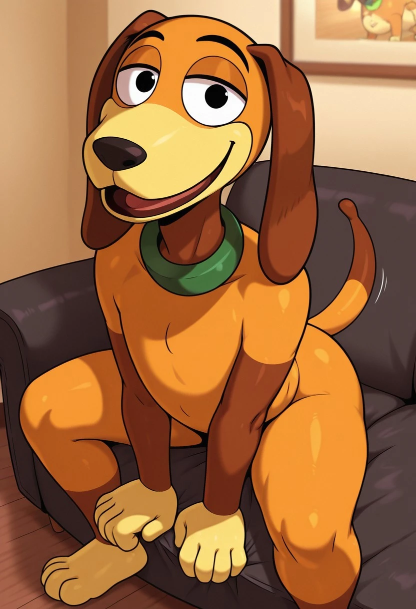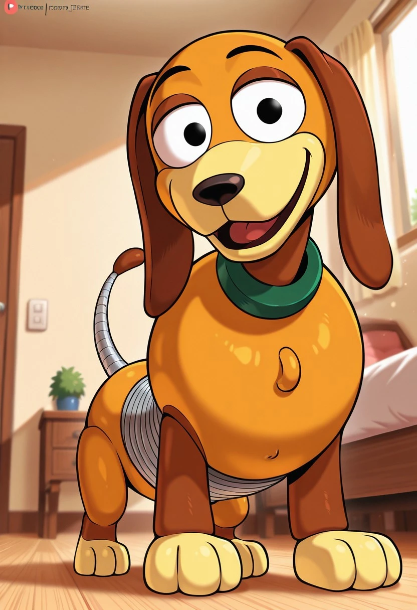 SlinkyDogToyStory,furry,Dachshund dog, male,solo,Brown floppy ears,orange fur,yellow muzzle, green collar,black eyes,tail