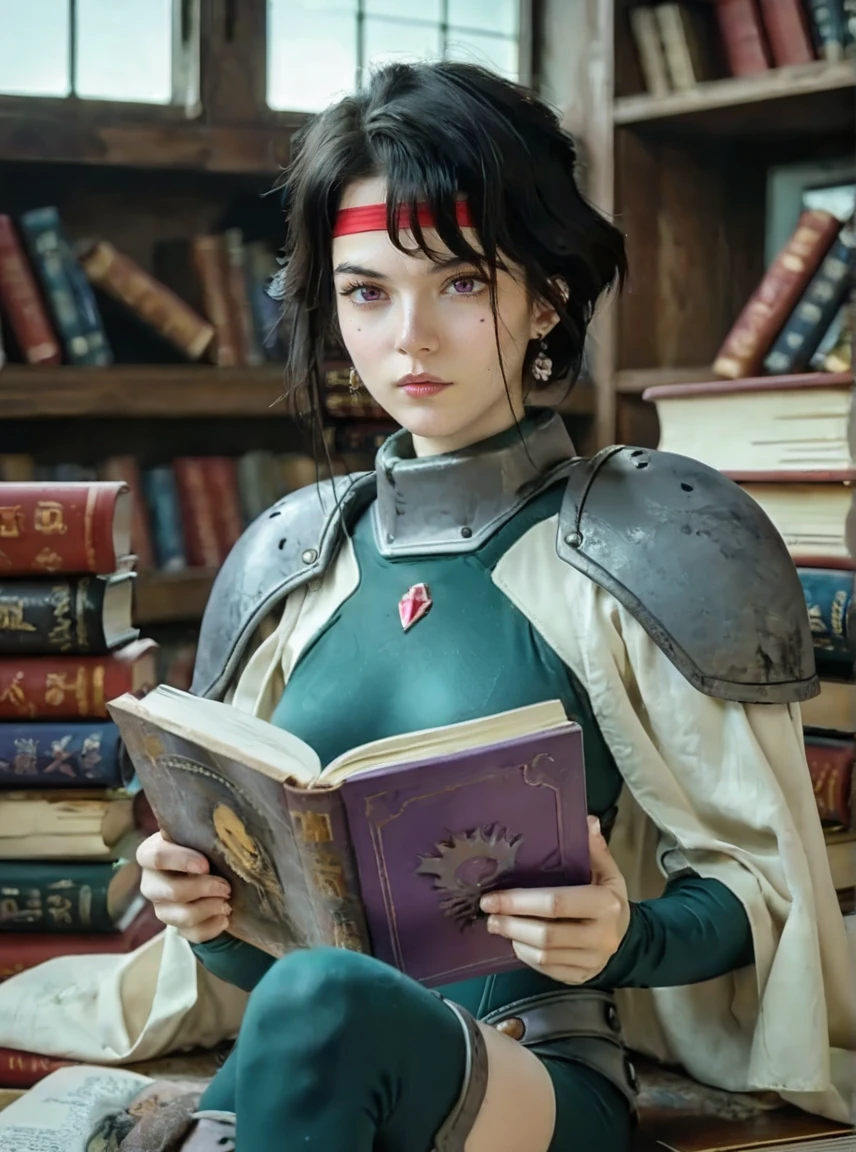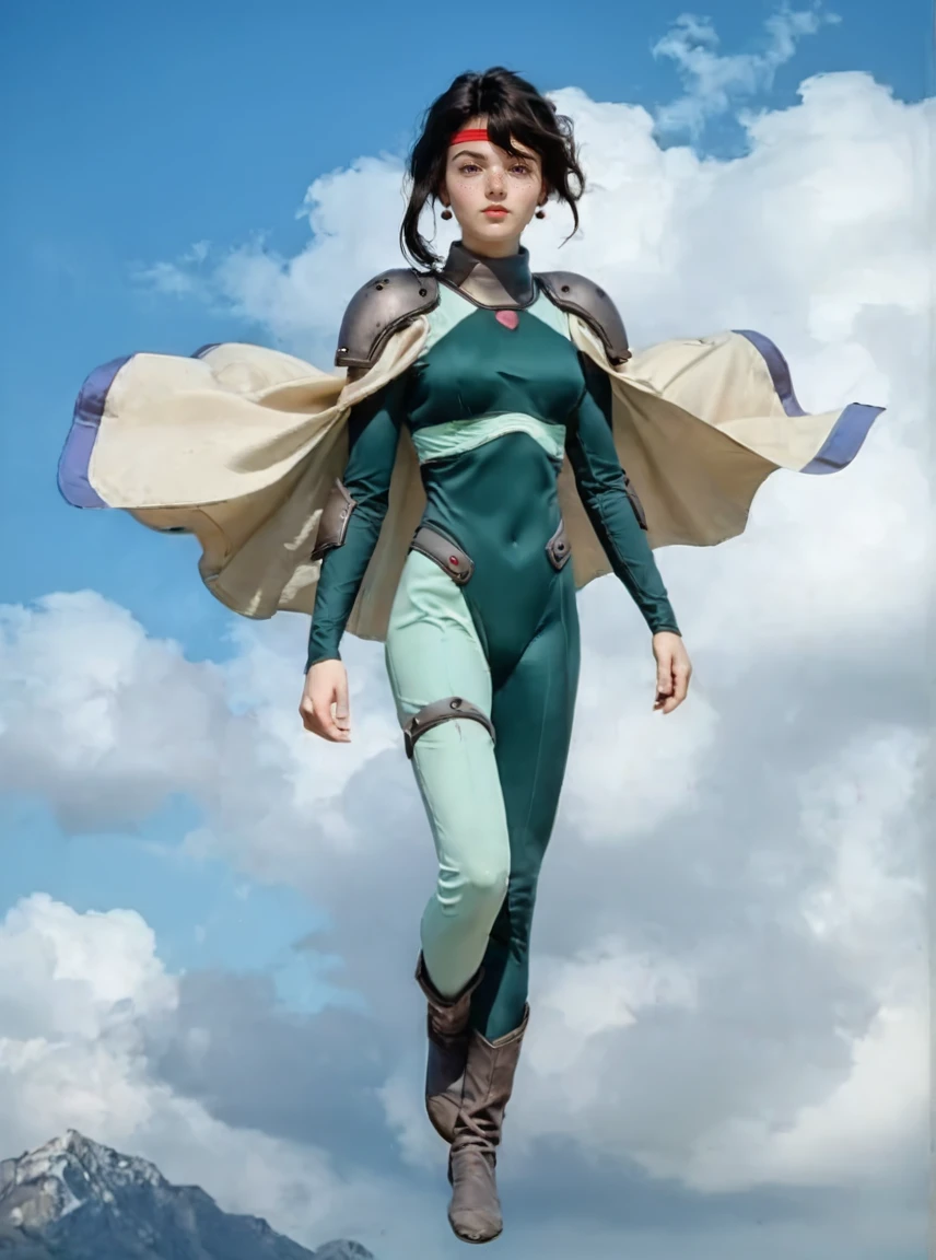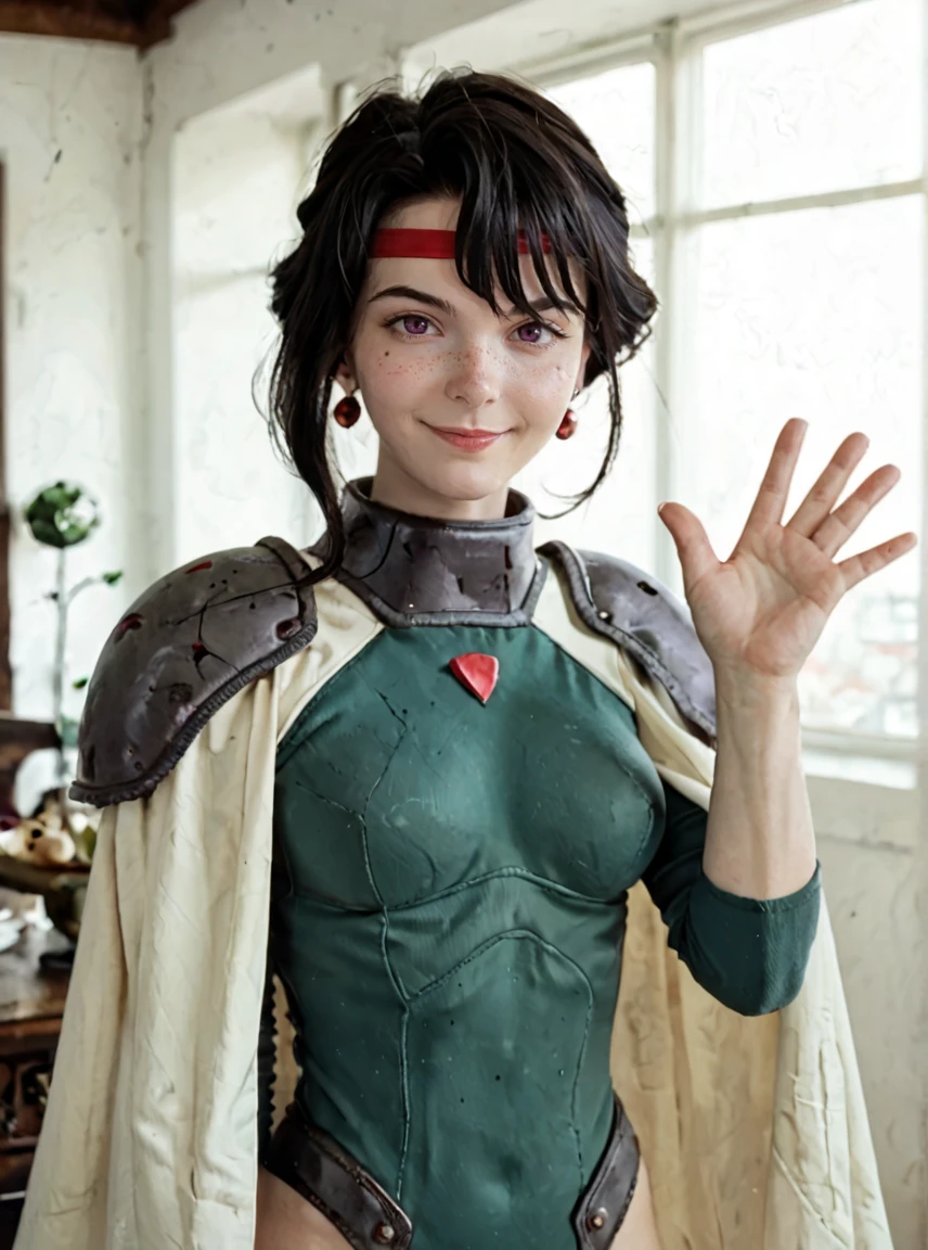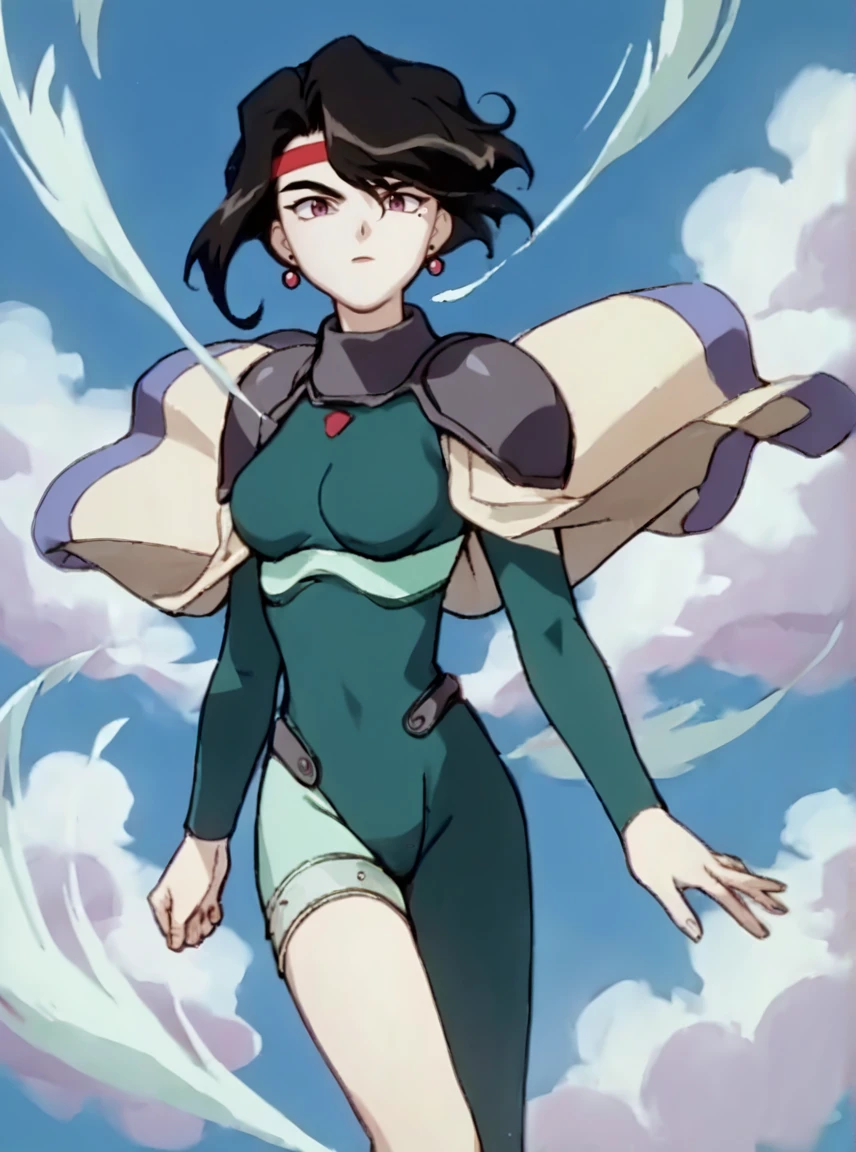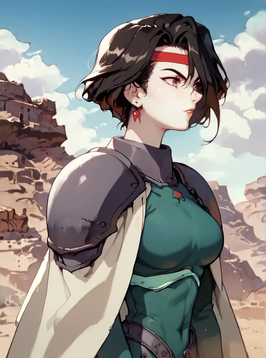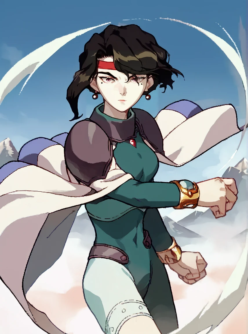 Afura_Mann, 1girl, black hair, short hair, bangs, red stripe on the forehead, purple eyes, mole on the left cheek, pale skin, light lipstick, earrings, médium breasts, short white cape, green leotard, gray shoulder armor,