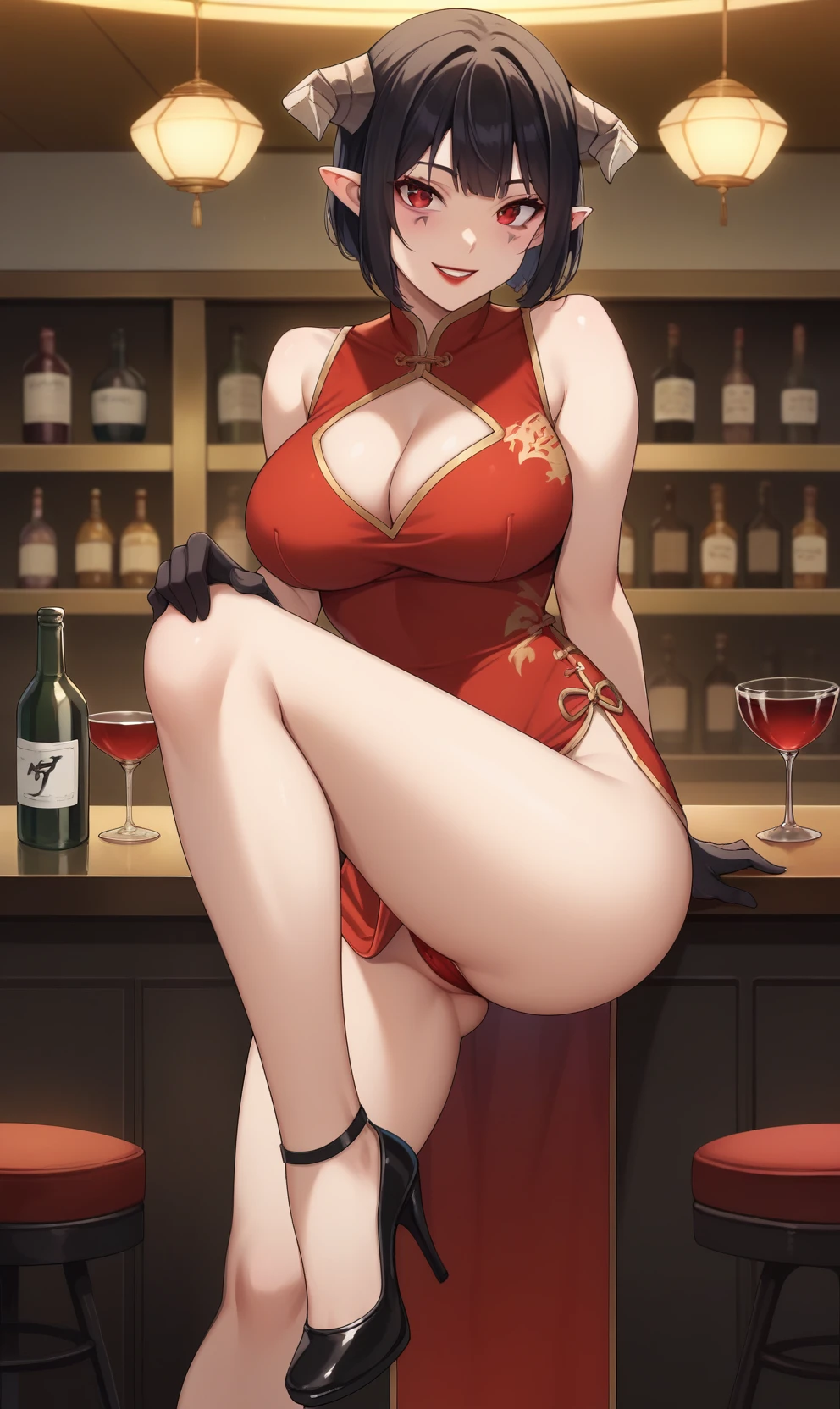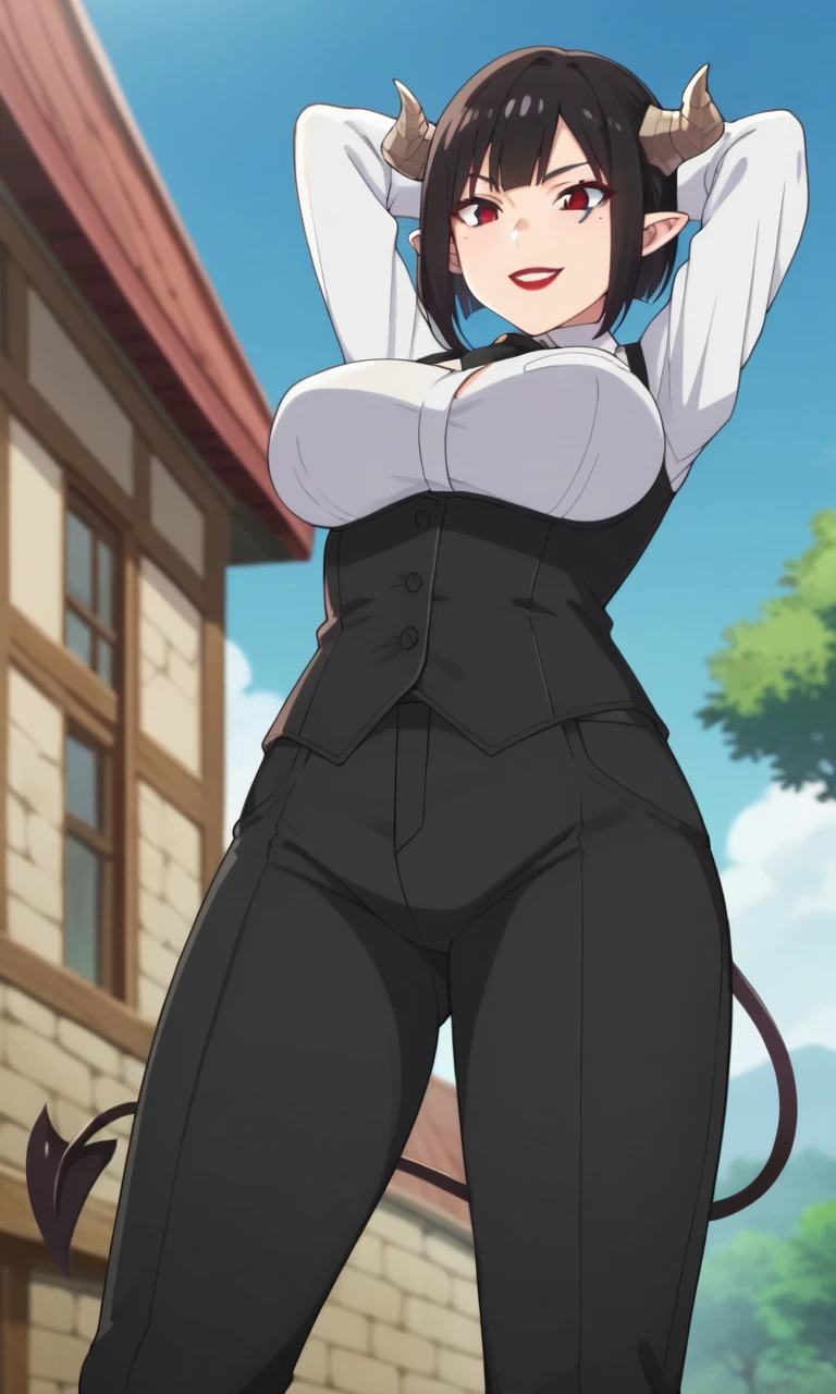 Use the following tags for correct generation: torturaxl, red eyes, black hair, short hair, pointy ears, black gloves, large breasts, red lips, demon horns, demon tail, black pants, black corset, white shirt, collared shirt, long sleeves, black necktie, vest, demon girl
