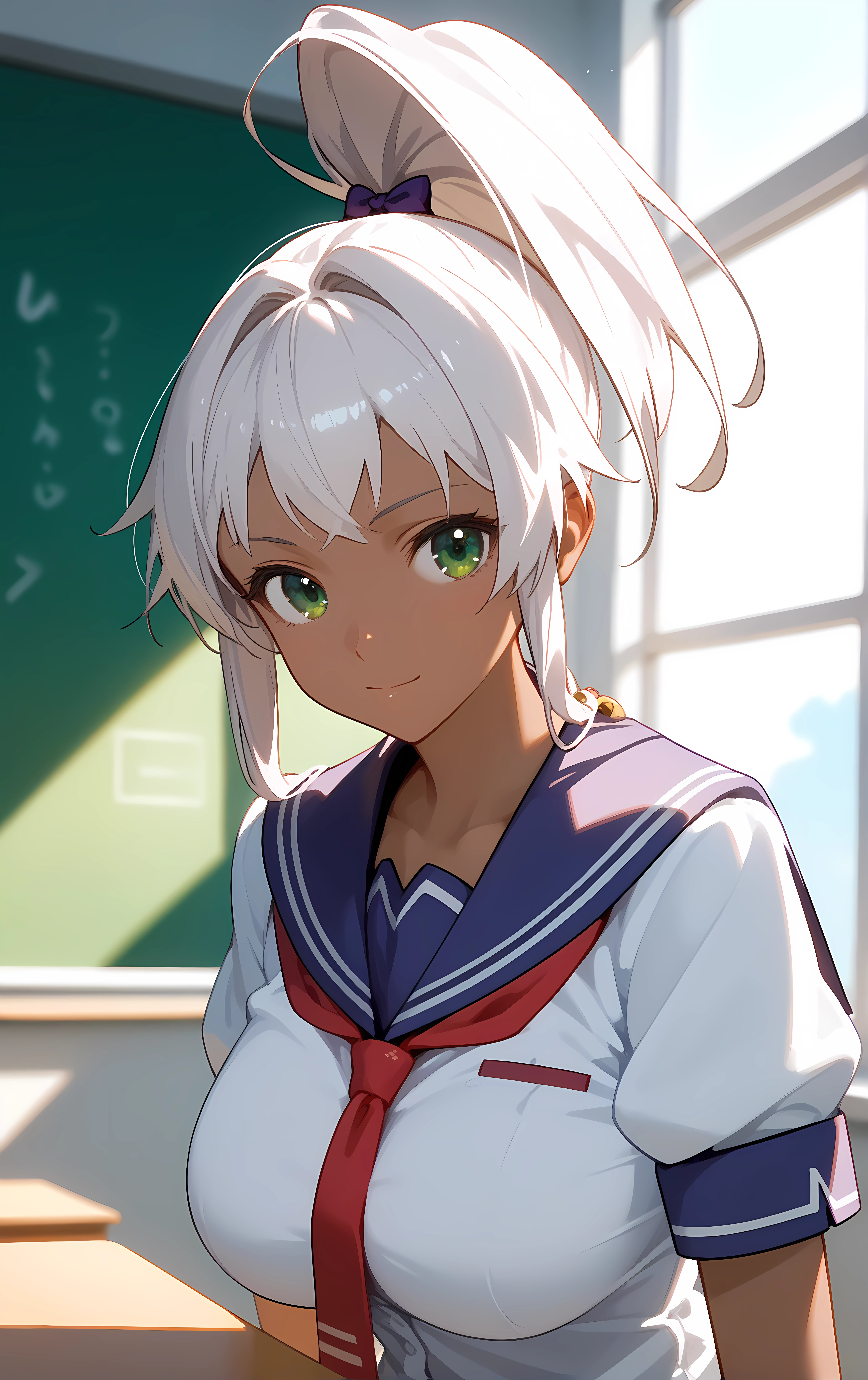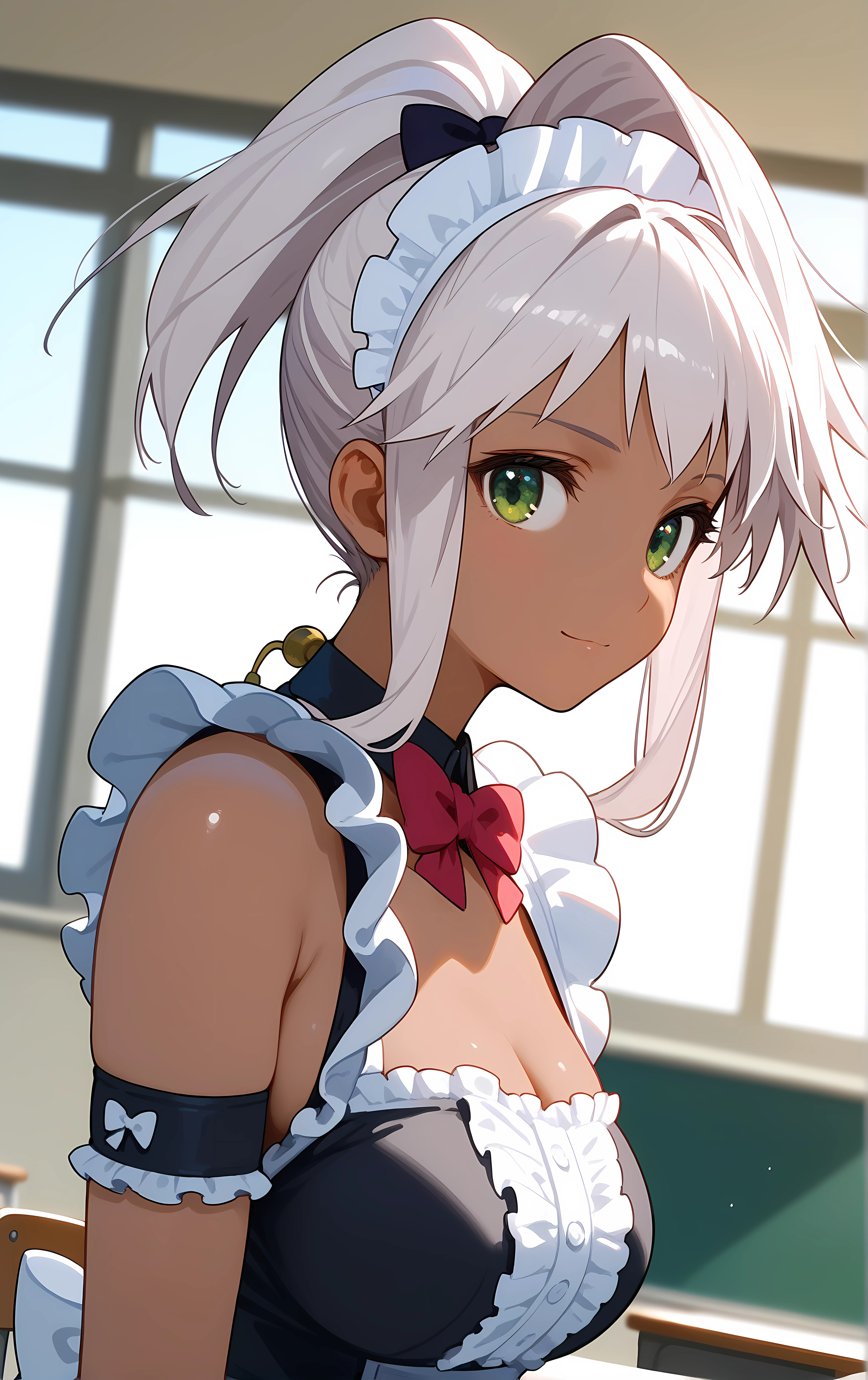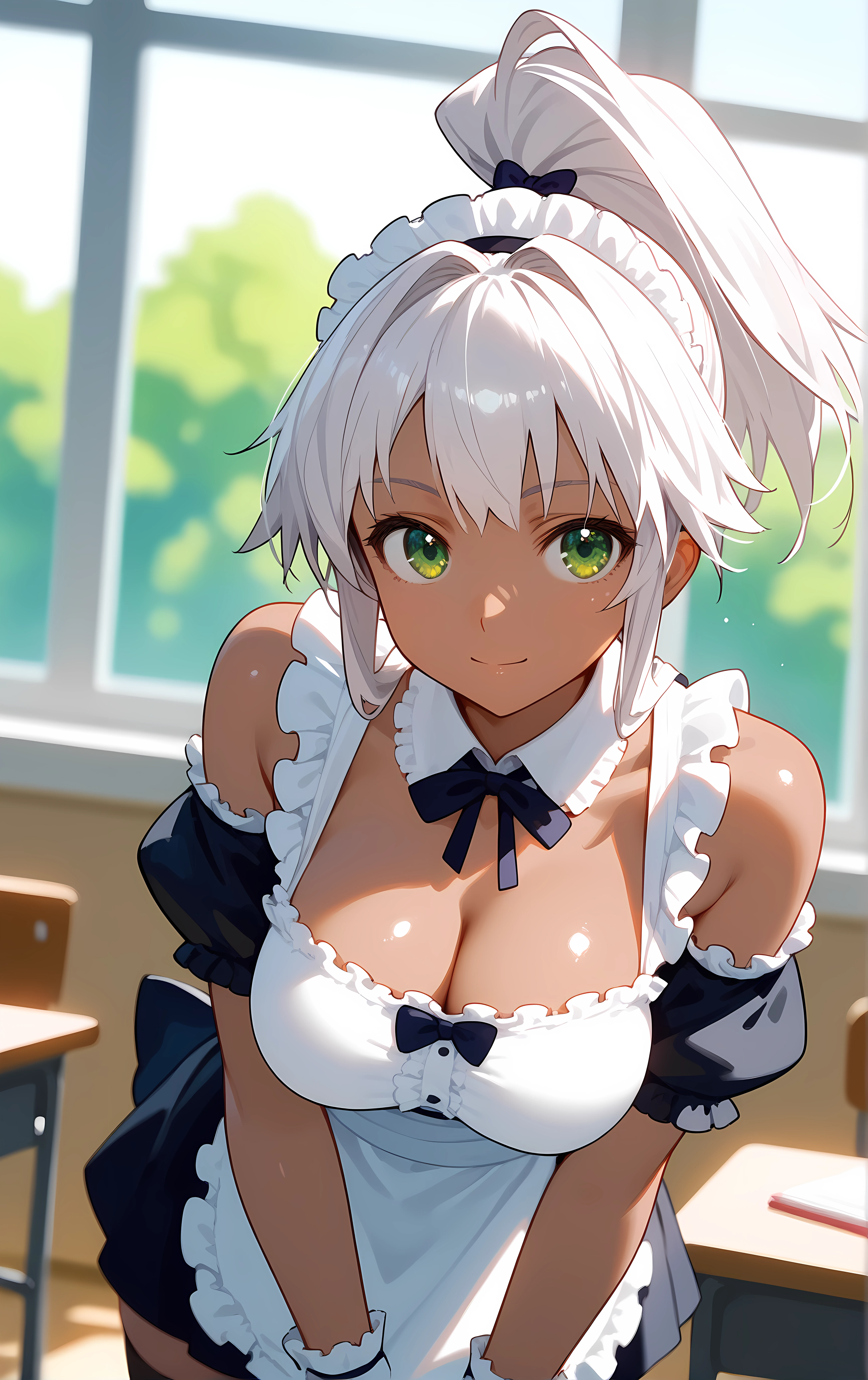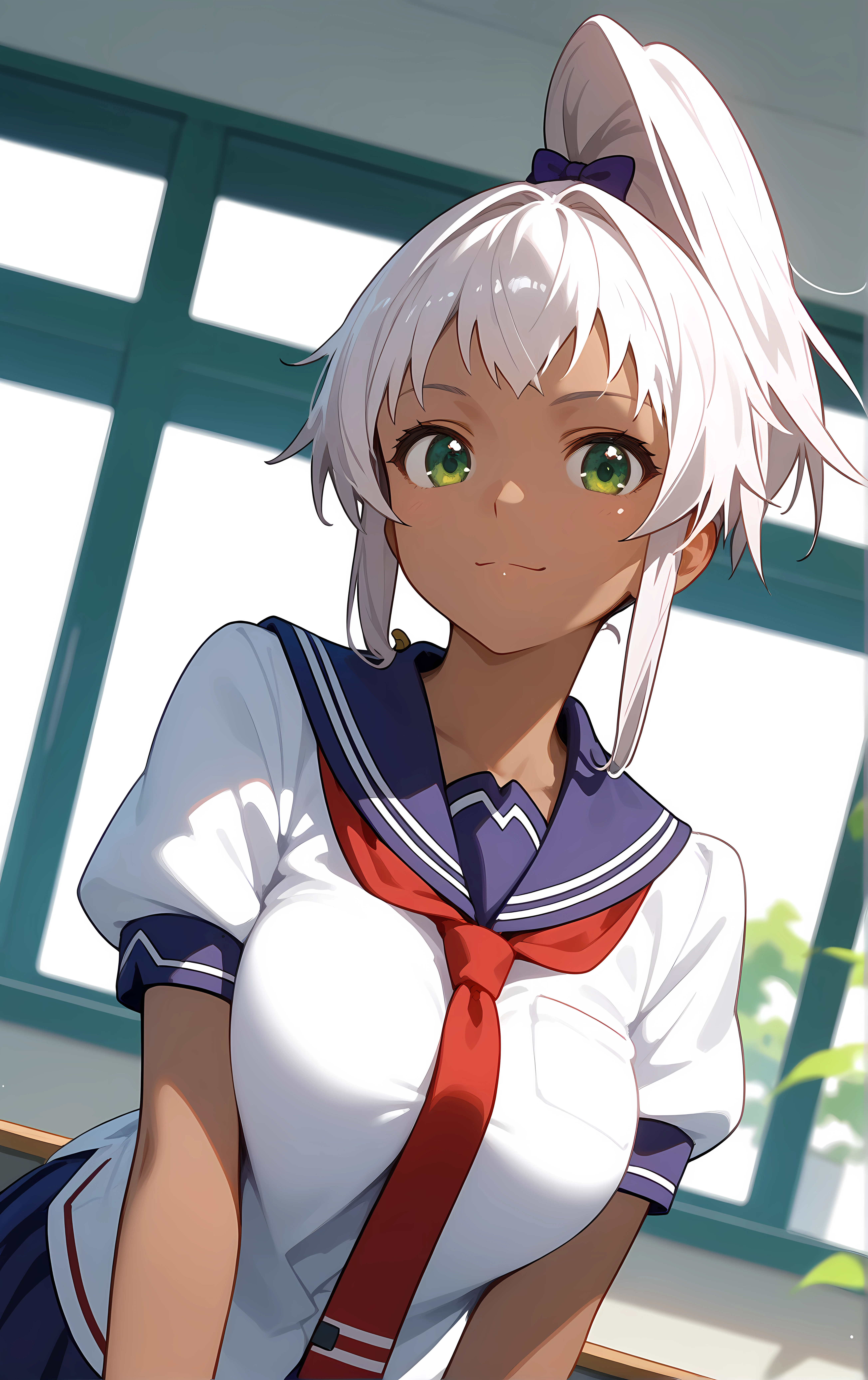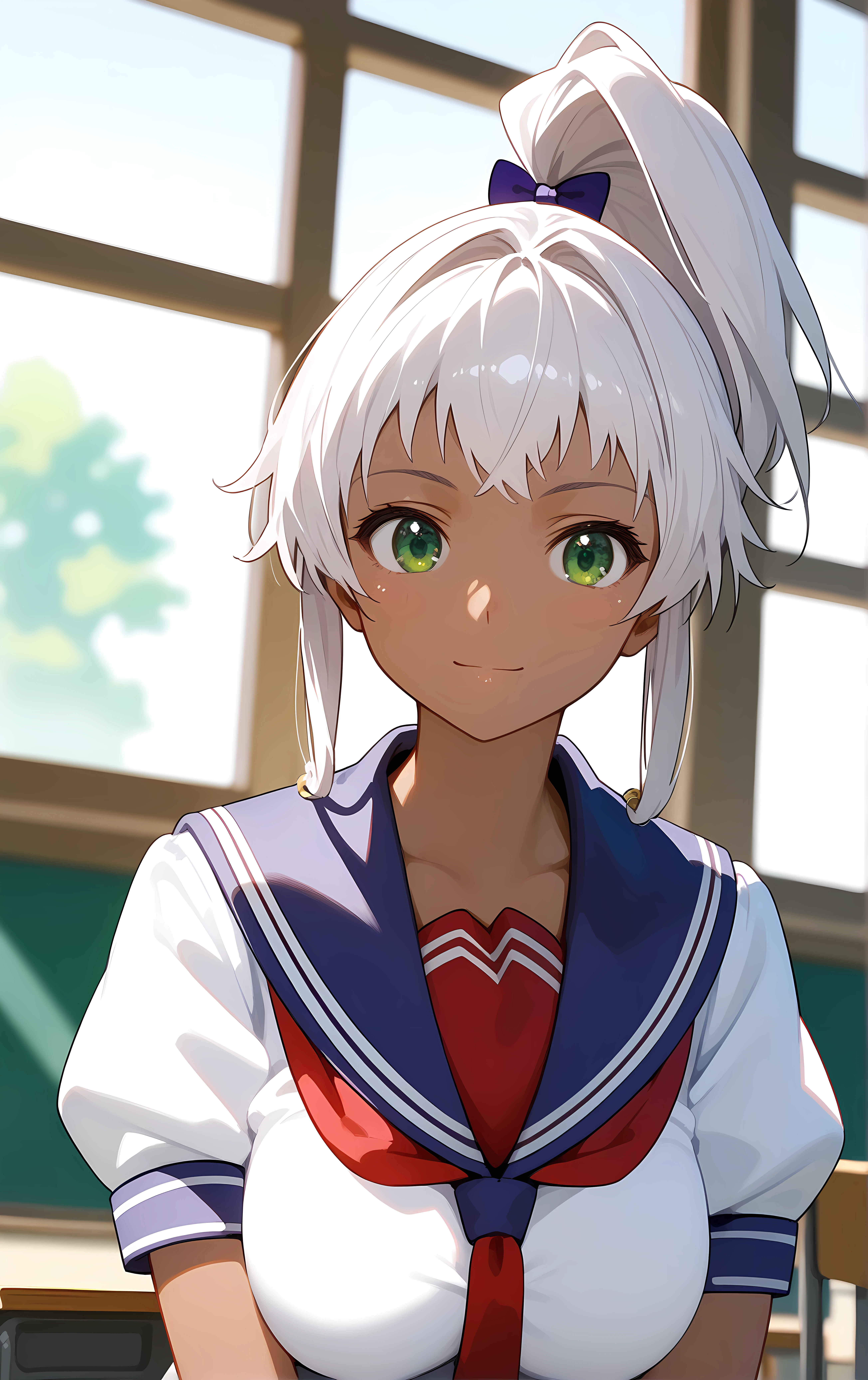ohwx, 1girl, solo, green_eyes, breasts, large_breasts, dark_skin, dark-skinned_female, ponytail, white_hair, long_hair, high_ponytail, bow,