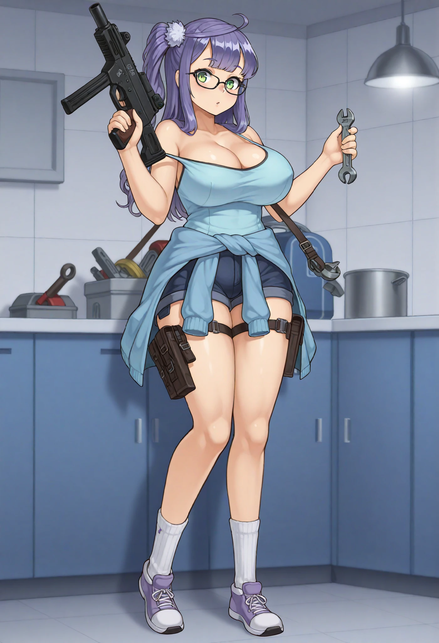 Gremlinlastorigin, large_breasts, breasts, purple_hair, shorts, wrench, glasses, cleavage, blue jacket tied around the waist,